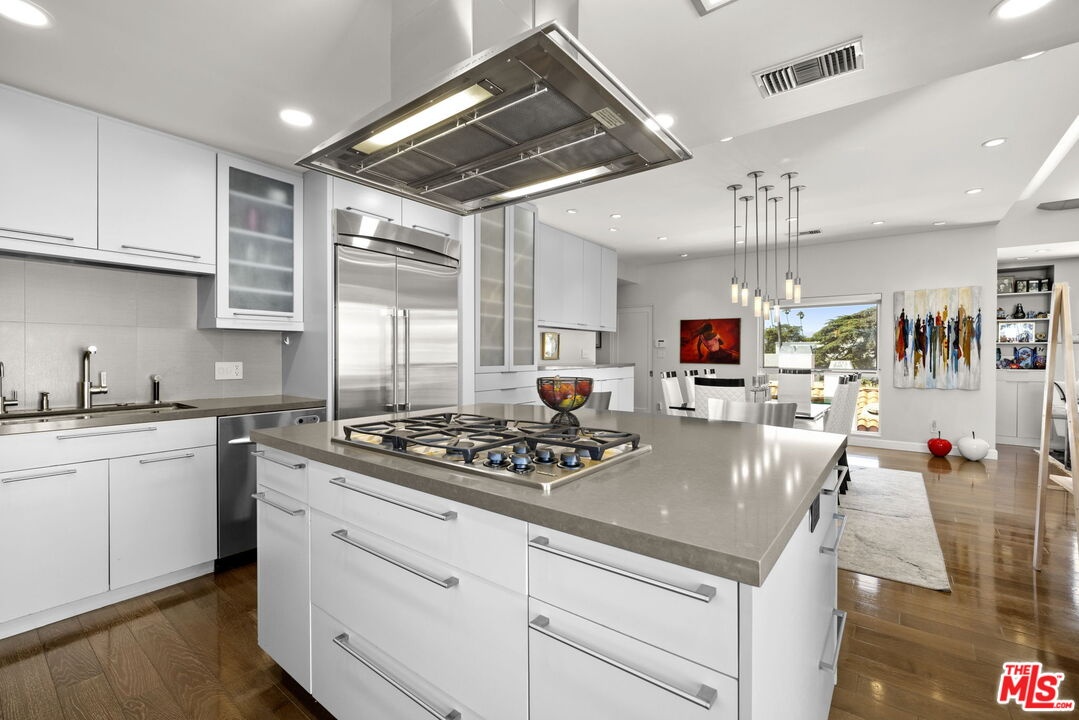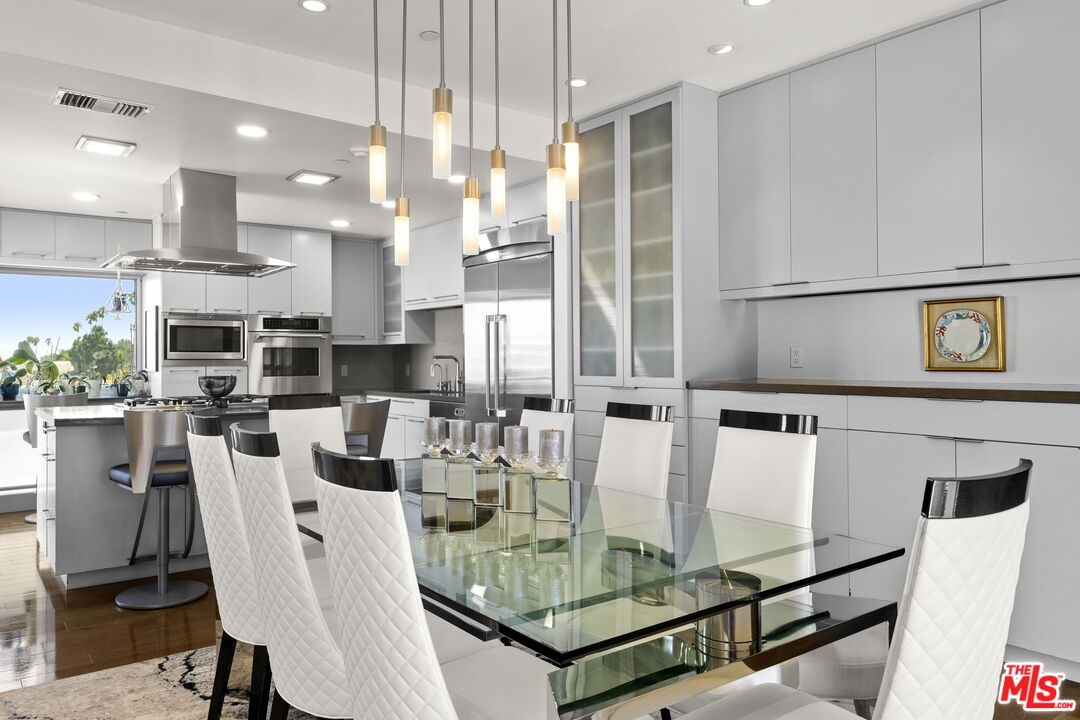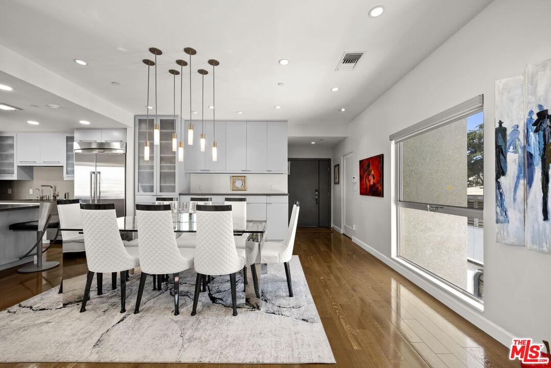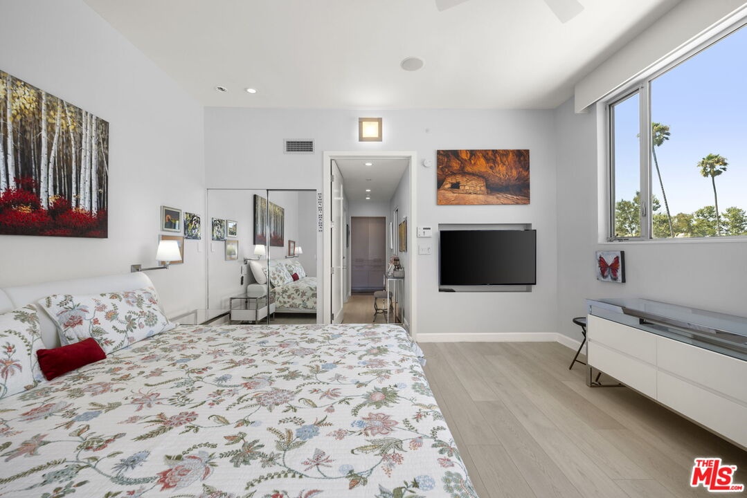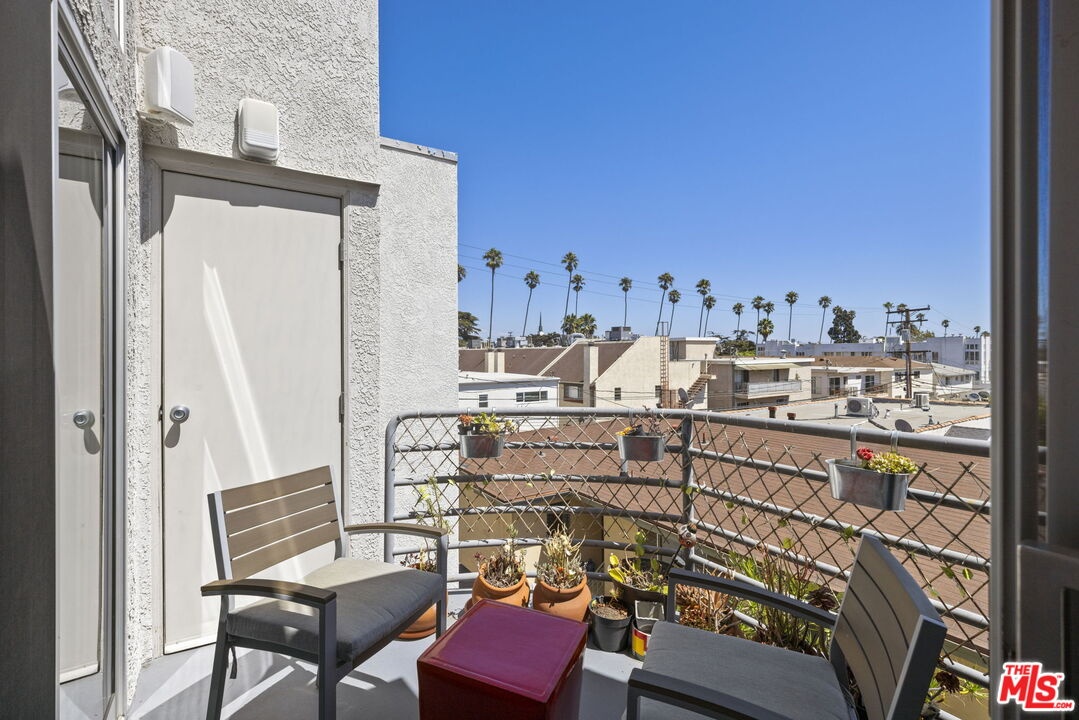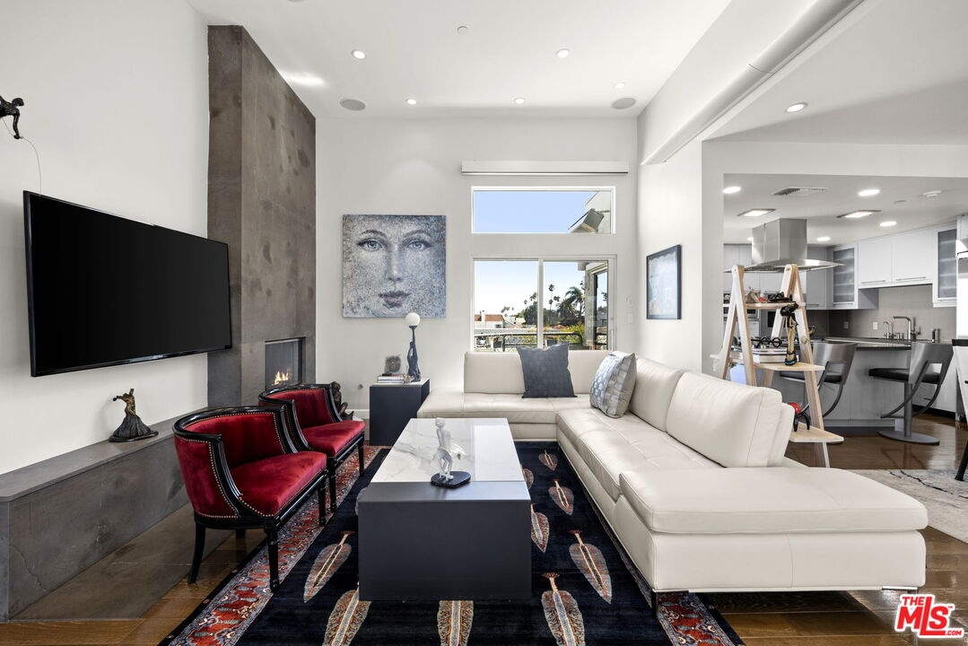Extraordinary contemporary single-level penthouse in a prime Santa Monica location just steps from Montana Avenue. This beautifully remodeled 2-bedroom, 2.5-bath residence offers exceptional design, quality craftsmanship, and a functional, open layout. Privately positioned in a quiet rear location with no common walls, the home features soaring 12-foot ceilings and abundant natural light through Fleetwood doors and windows. The spacious great room is ideal for both entertaining and everyday living, offering seamless living, dining, and sitting areas centered around a fireplace, built-in cabinetry, and access to a private balcony with a built-in heater and speakers. The chef's kitchen features a center island and Caesarstone countertops with ample prep and storage space. The primary suite offers a private retreat with its own balcony, walk-in closet, and spa-style bath with dual vanities, soaking tub, and steam shower with built-in bench seating. A well-sized guest suite, powder room, and convenient in-unit laundry add to the home's everyday functionality. Additional features include storage, in-unit speakers, side-by-side parking, and HOA dues that include earthquake insurance. Located in one of Santa Monica's most desirable neighborhoods, this residence offers convenience, privacy, and modern coastal living.