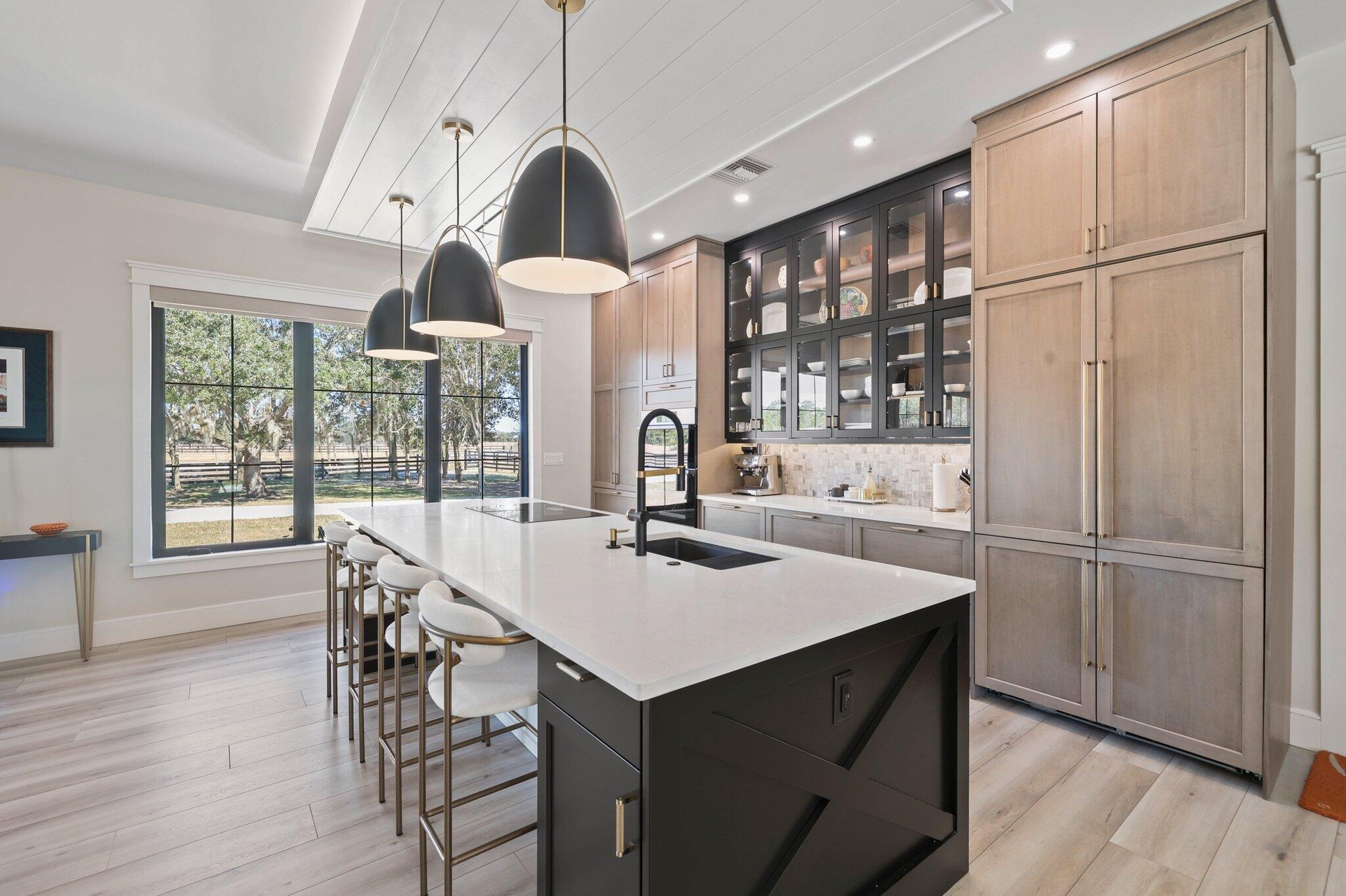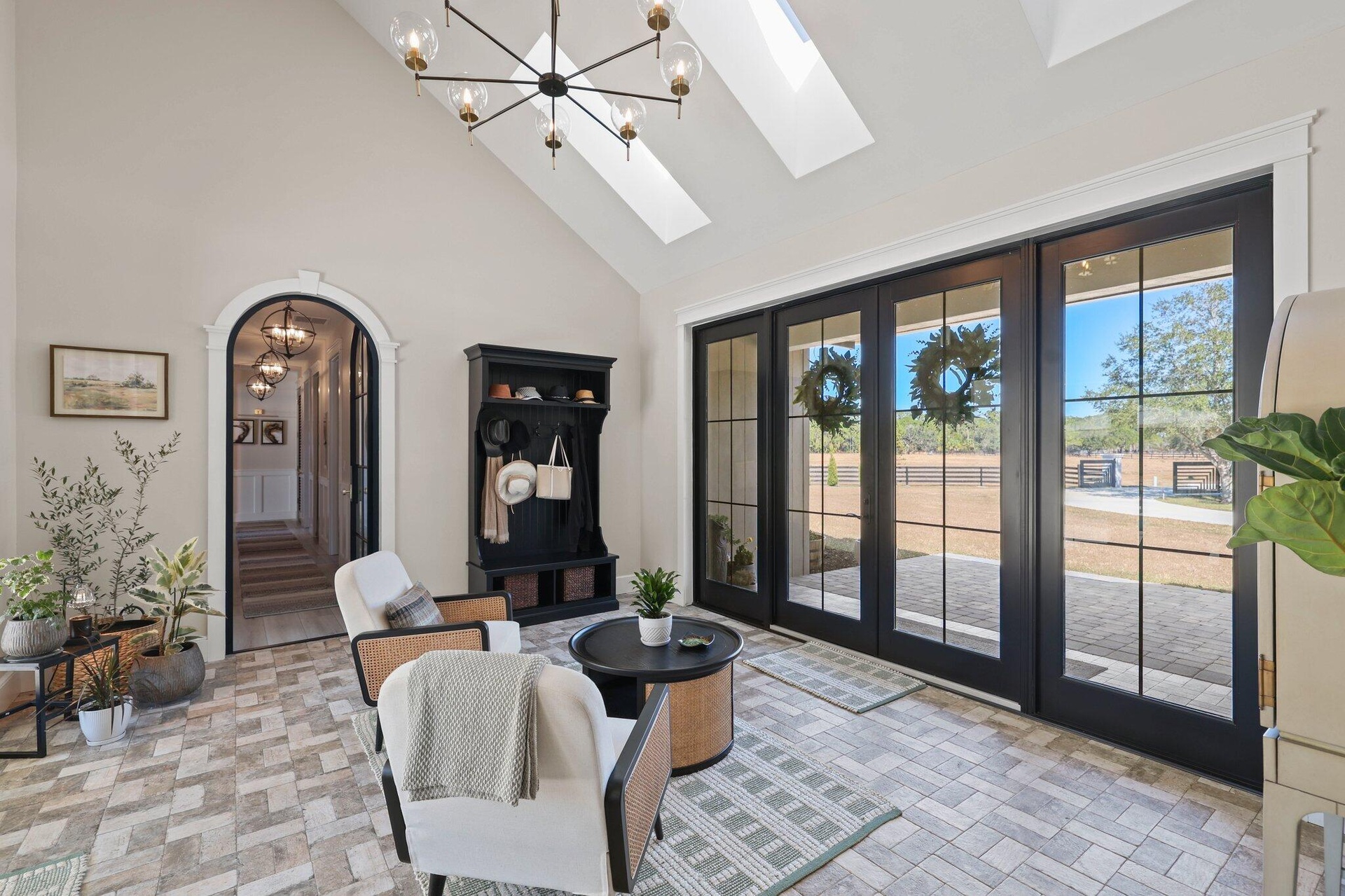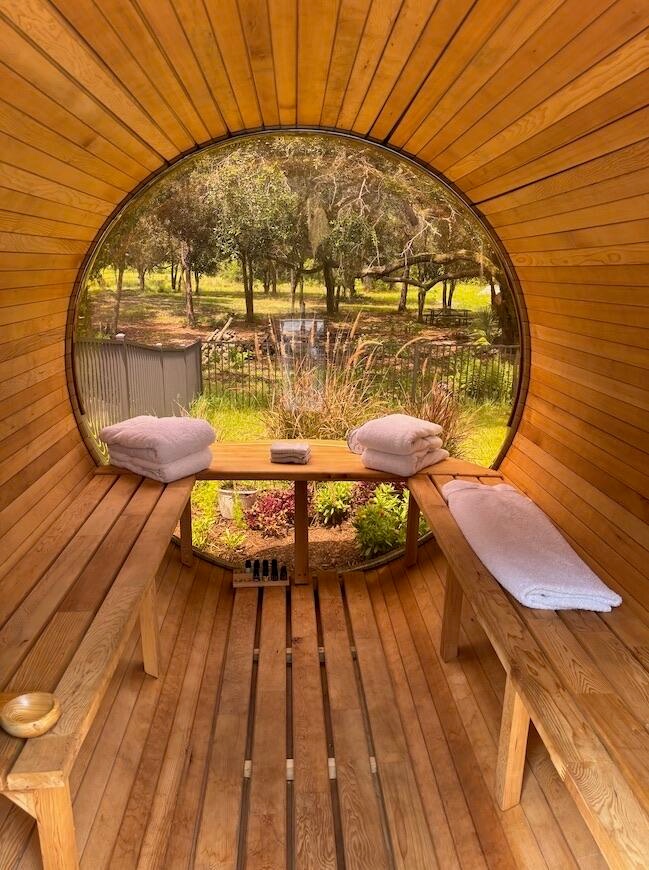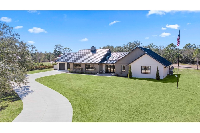 This rare, tranquil custom estate offers a blend of country living and sophisticated lifestyle in a healthy natural, spa inspired setting. Located in the highly sought out Bridlewood Ranches, a private, gated equestrian community, this exquisite 4 bedrooms/2 full 2 half bathroom luxury home was built in 2024. It is Located on 5+ acres on a cul de sac and was built with intention by owners, showcasing exceptional craftsmanship and attention to detail. Features include a standing-seam metal roof, oversized garage, hurricane-impact windows and doors and a stunning kitchen with 11' island and smart home functionality. The fully equipped, mirrored gym features professional equipment with seamless outdoor spaces including heated pool, integrated spa, and outdoor 6 person sauna/wet area. Elevated finishes throughout with soaring tray ceilings designed with cypress beams. Multiple French doors and expansive windows provide a calming flow from luxurious inside amenities to the natural outdoor spa area. Privacy, beauty and lifestyle in one exceptional home surrounded by abounding nature. The home is offered partially furnished, personal items and artwork not included. Many items and decor negotiable.