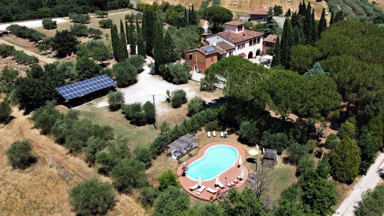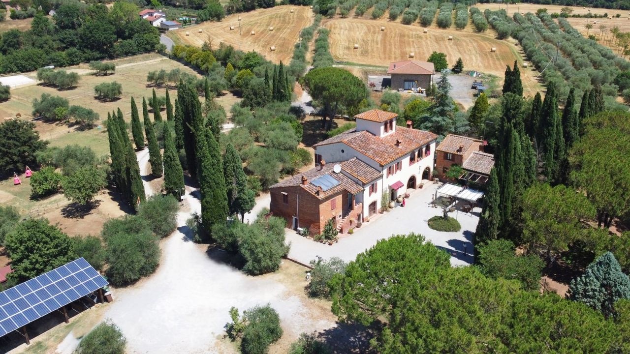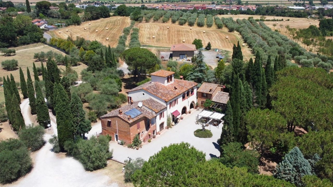 The first floor, accessed via an internal staircase, consists of a large living room with a fireplace and eight bedrooms, seven of which have en-suite bathrooms and two of which have a romantic balcony with a view. The most distinctive bedroom has an internal staircase leading to the third floor, where there is a bathroom converted from the old dovecote of the farmhouse: a bright and very spacious room offering extraordinary 360-degree panoramic views of the surrounding countryside.