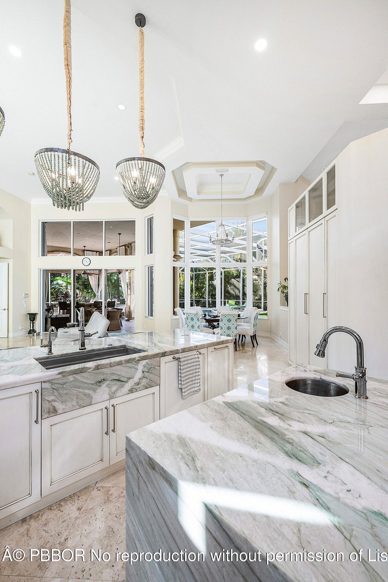 The home has been thoughtfully updated throughout, reflecting hundreds of thousands of dollars in renovations, beginning with a fully remodeled chef's kitchen featuring all-new Thermador appliances, a dramatic marble center island, custom cabinetry, marble countertops, and premium water filtration. Living areas are enhanced by custom built-ins and a statement chandelier, while the oversized primary suite provides a true retreat with serene views and spa-like comfort.