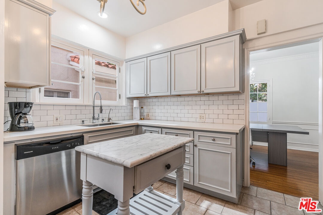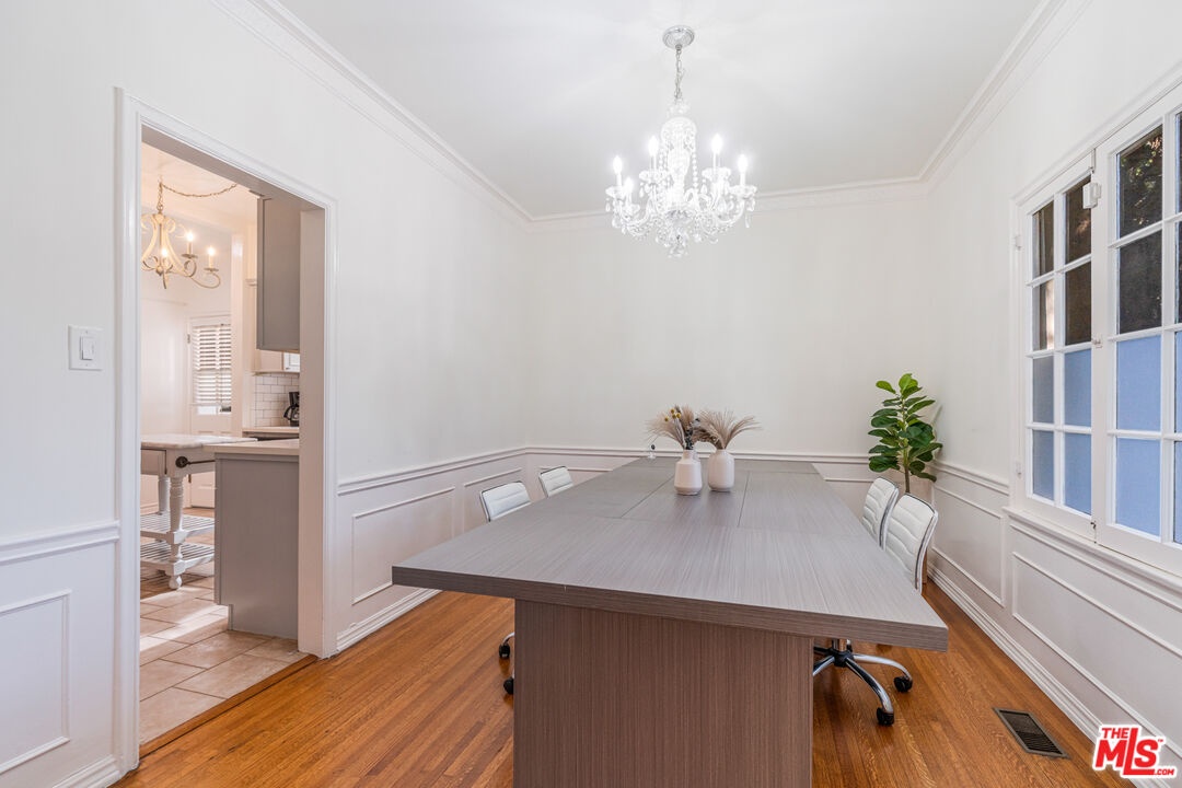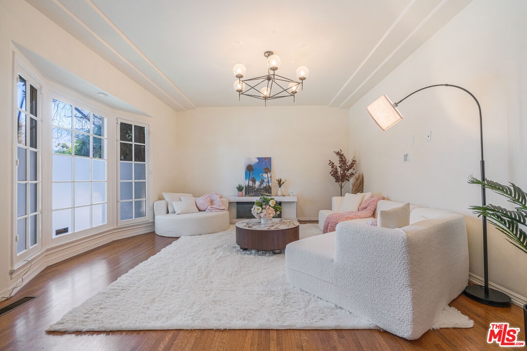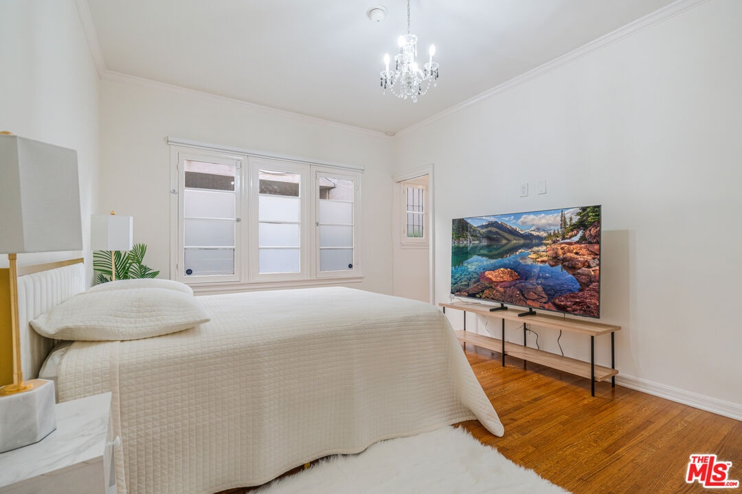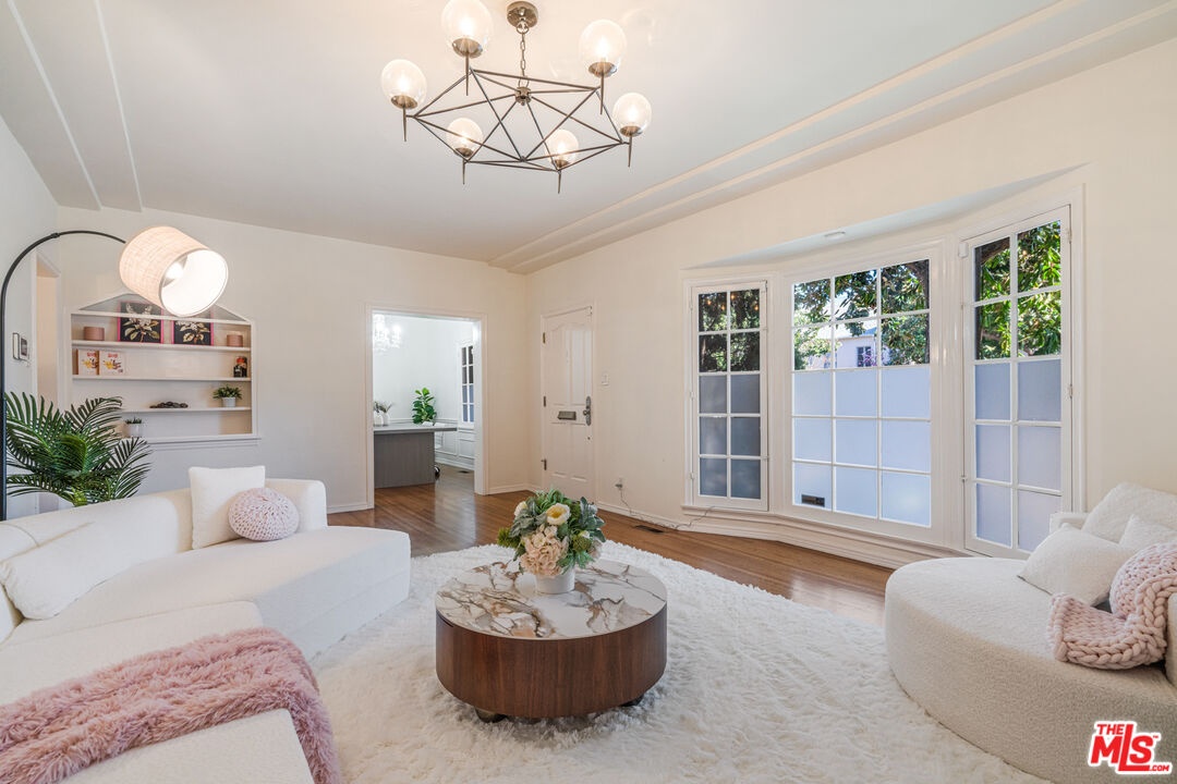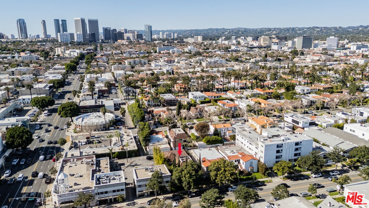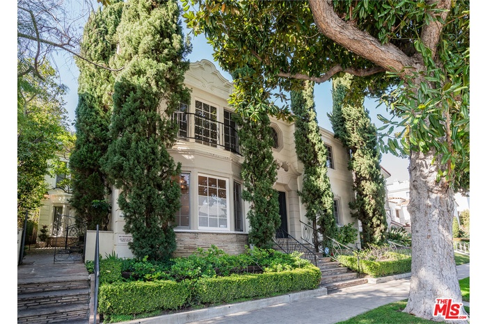 A refined expression of Classical Revival style architecture, this Beverly Hills residence reflects a thoughtful reinterpretation of classic European design. Framed by mature cypress and defined by a symmetrical stucco facade, wrought-iron detailing, and a formal recessed entry, the home presents a composed and enduring architectural presence. Inside, approximately 1,210 square feet of living space is defined by warmth, proportion, and understated elegance. Sunlit interiors feature rich hardwood floors, crown moldings, paneled walls, and graceful ceiling details, creating rooms that feel intimate yet refined. Large windows introduce soft natural light, reinforcing a sense of calm and balance throughout. The home offers two bedrooms and two bathrooms, ideally suited for a sophisticated primary residence, an elegant pied-a-terre, or a discerning downsizing opportunity. A charming kitchen blends classic cabinetry with modern functionality, complementing the home's architectural character while supporting everyday living. Centrally located yet inwardly serene, the interiors offer a quiet retreat from the surrounding energy. Set within a highly walkable Beverly Hills neighborhood near shops, cafes, and restaurants, the residence pairs architectural distinction with the ease of an urban lifestyle, appealing to those who value timeless design, location, and discretion.