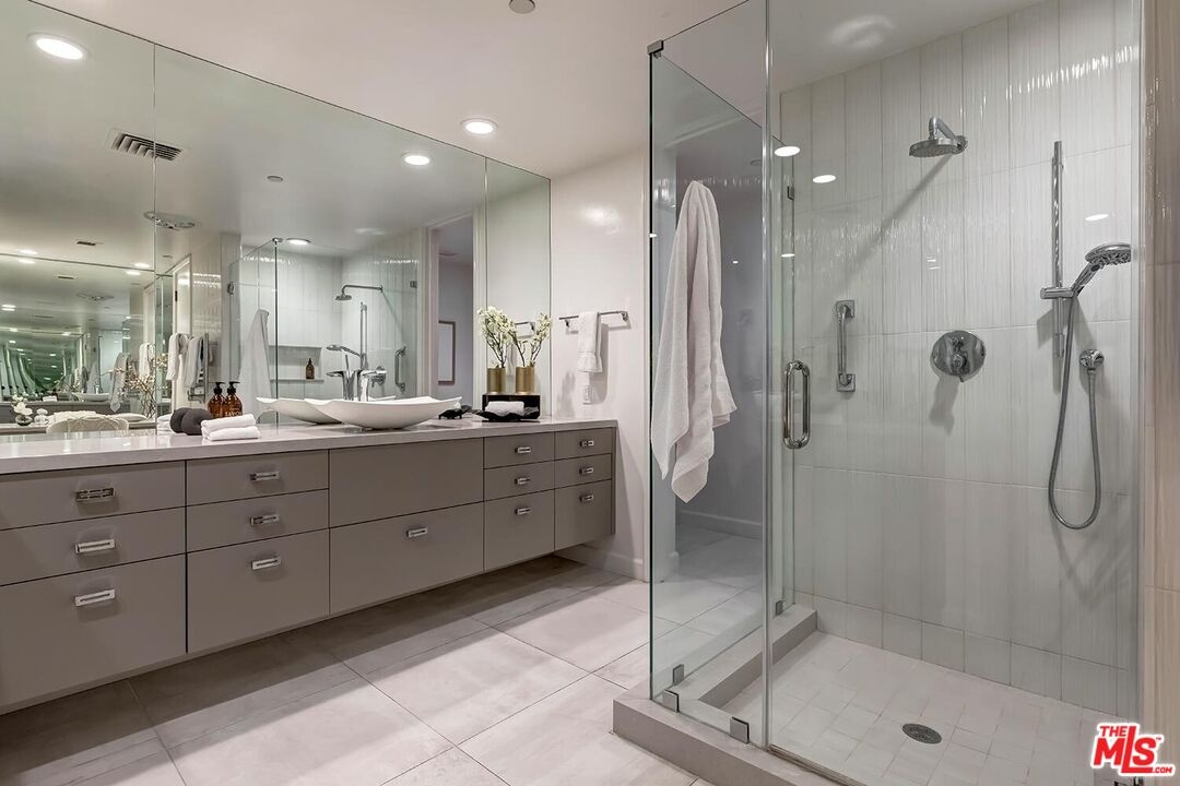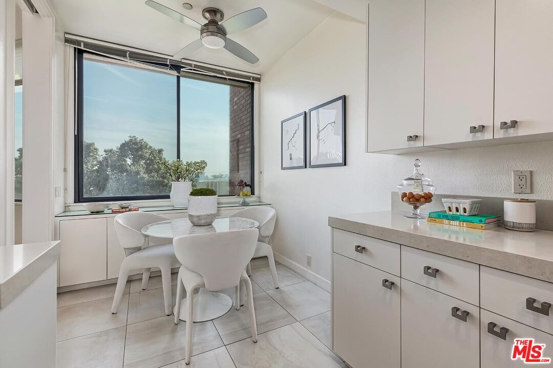 A modern, one-of-a-kind residence, this premier corner home is the largest Plan two-bedroom + den layout at the coveted IV Seasons Condominiums in Beverly Hills. Set on a quiet, tree-lined street, this residence is a refined contemporary aesthetic and exceptional attention to detail. Floor-to-ceiling windows wrap the residence in expansive 280-degree views from the Hollywood Hills to Beverly Hills and vibrant eastern sunrises, filling the interiors with natural light. Oversized white porcelain tile floors and streamlined built-in library cabinetry create a clean, modern backdrop, while the spacious terrace extends the living space outdoors with effortless flow. The formal dining area and sleek galley kitchen are designed for today's lifestyle, featuring modern cabinetry, and a bright breakfast room overlooking lush park treetops and the city skyline. The primary suite offers a calming, contemporary retreat with a custom walk-in closet, freestanding soaking tub, and an oversized glass-enclosed shower. The second bedroom suite mirrors the same elevated design with a custom closet and stylish ensuite bath. A flexible den serves perfectly as a home office or media lounge, and the redesigned laundry room adds everyday convenience with a modern edge. Residents enjoy full-service amenities, including 24/7 doormen, valet parking, a newly renovated pool and spa, fitness center, and additional storage. All just moments from the best shopping, dining, and experiences Beverly Hills and the Westside have to offer.