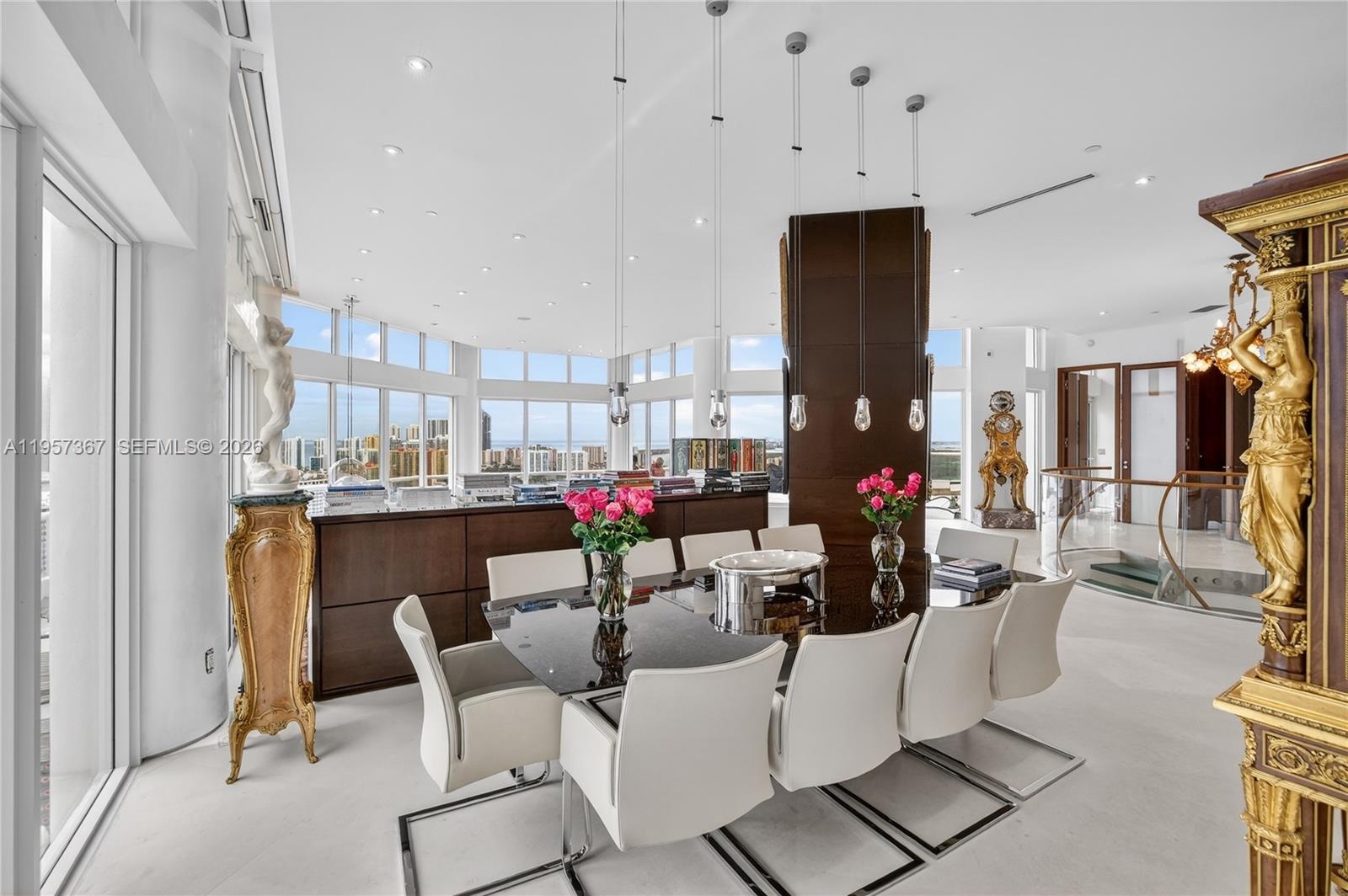 WOW comes out of your mouth every time you walk in. Introducing a truly rare Williams Island penthouse offering 5 bedrooms and 4.5 baths with immense 14-foot ceiling heights and breathtaking, full panoramic views stretching from the direct ocean to the east and southeast, all the way to the dazzling city skyline. This residence delivers a one-of-a-kind “wow factor” with a dramatic glass staircase, a sunken living room, and an elegant formal dining room—perfectly designed for both grand entertaining and refined everyday living.