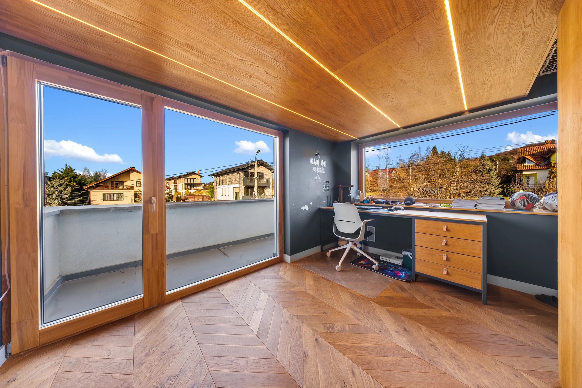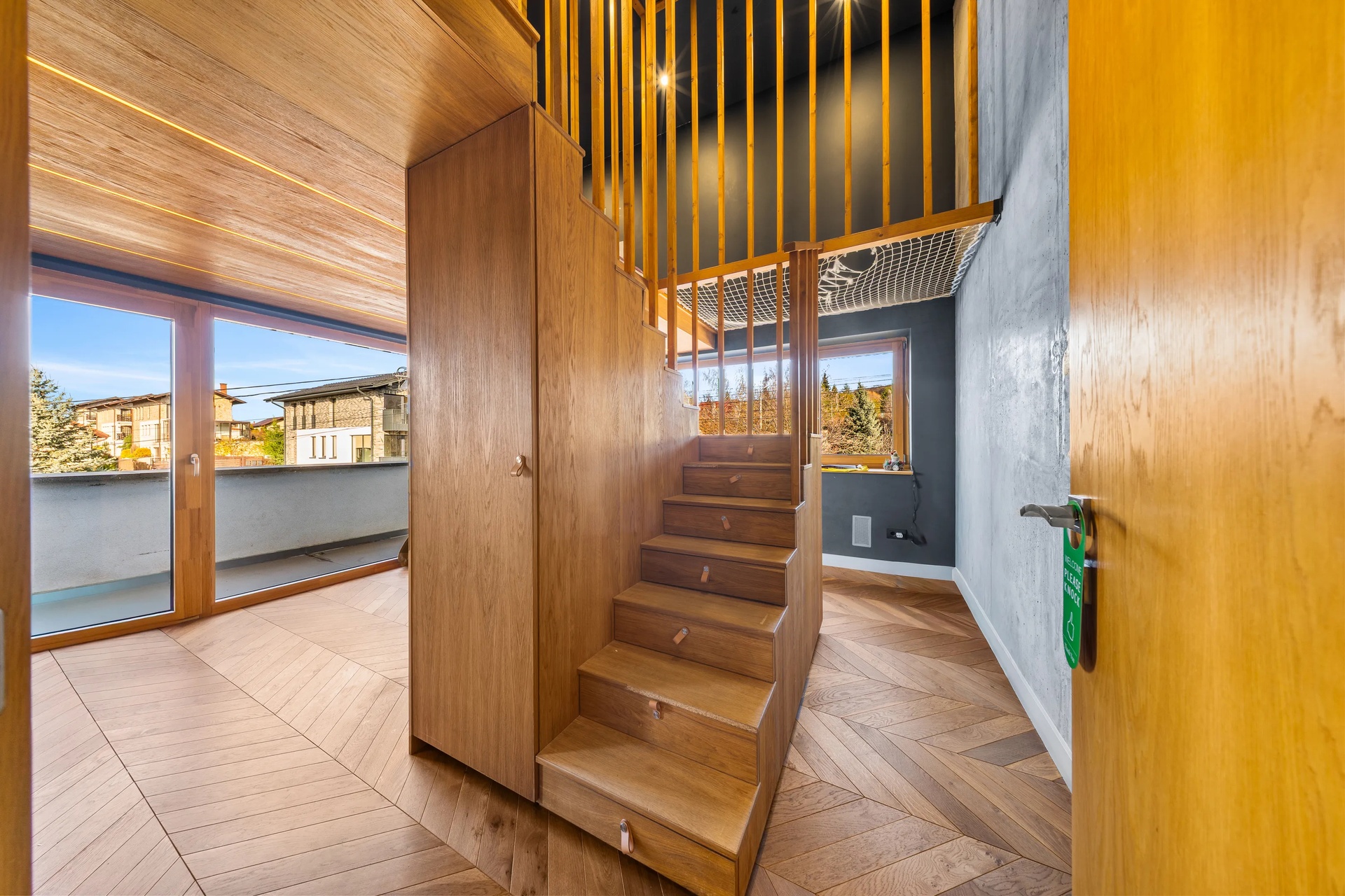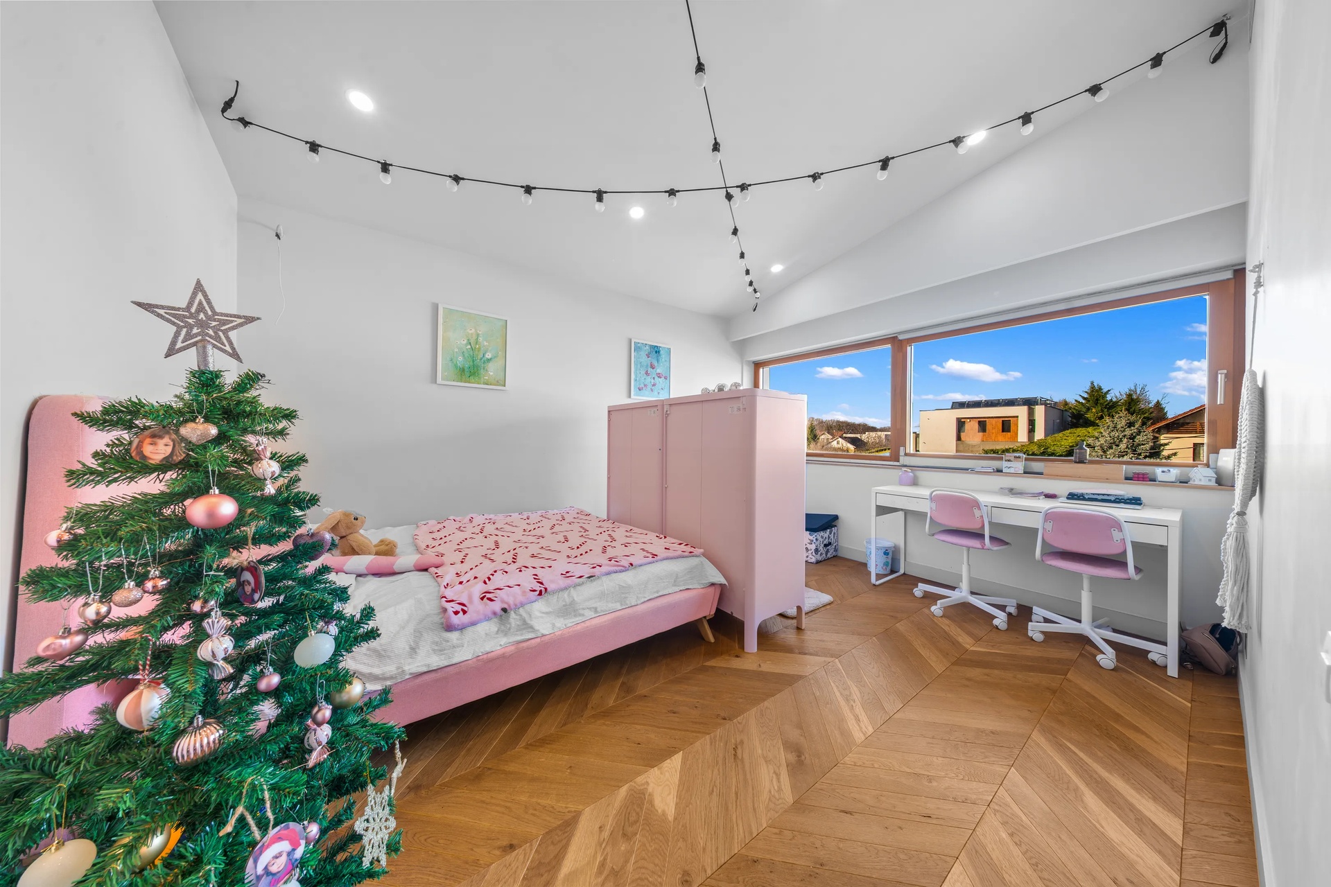 The first floor, spanning 113 sqm, is devoted entirely to private accommodation and offers an exceptional level of comfort and privacy. The bedrooms are generously proportioned, each benefiting from its own en-suite bathroom and intelligently integrated storage solutions. The principal suite is particularly impressive, featuring a spacious dressing area and a private bathroom complete with sauna, creating a true in-home wellness retreat. Open views towards the forest enhance the atmosphere of tranquility, while the terraces provide additional natural light and a strong connection to the outdoors.