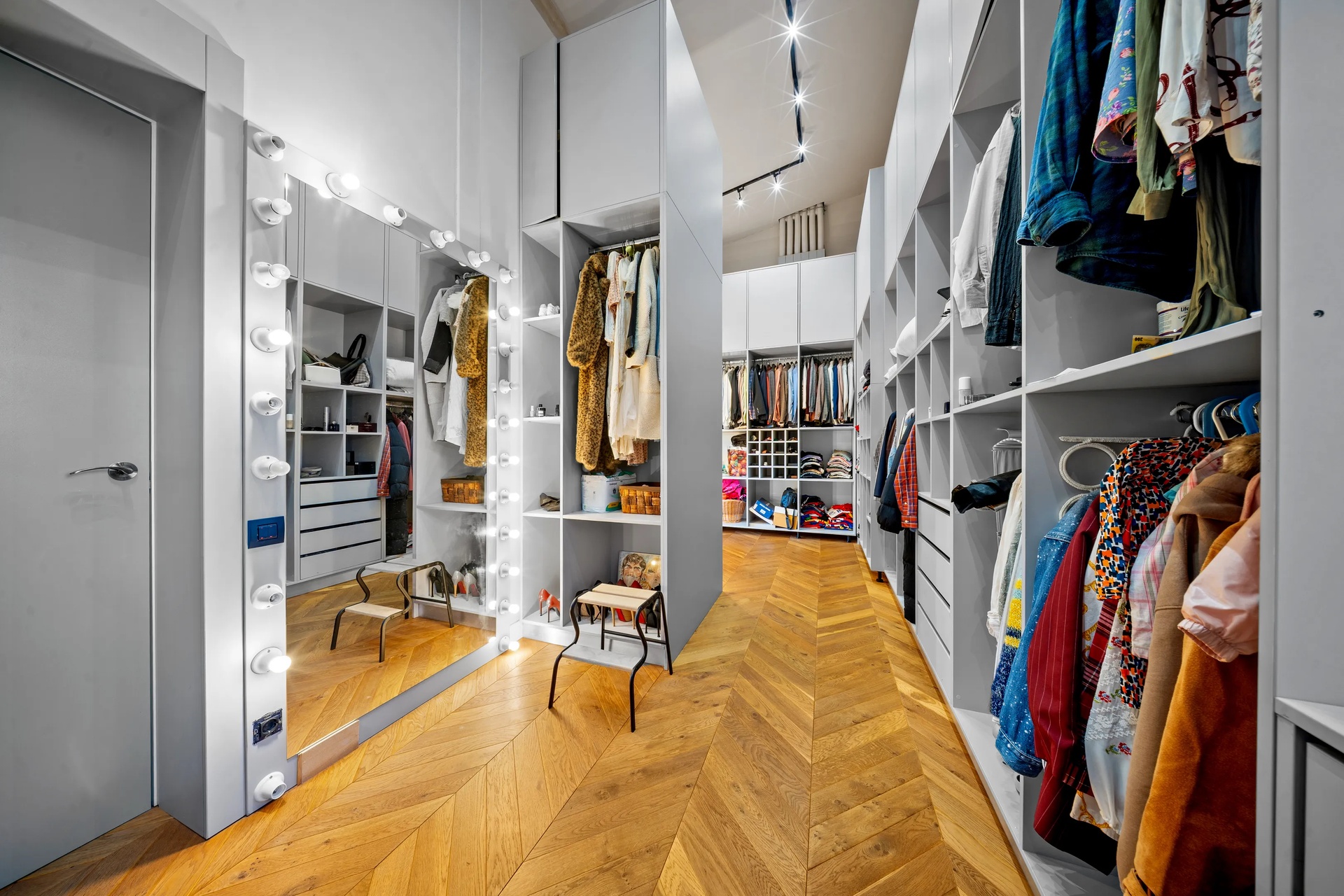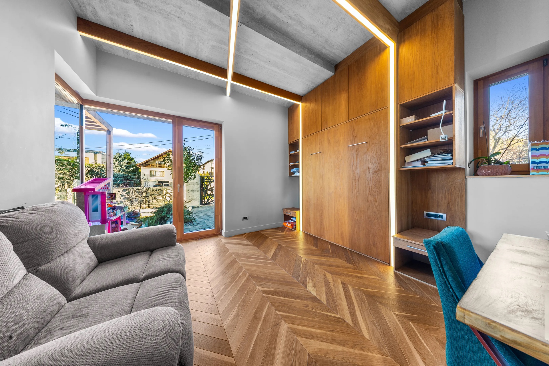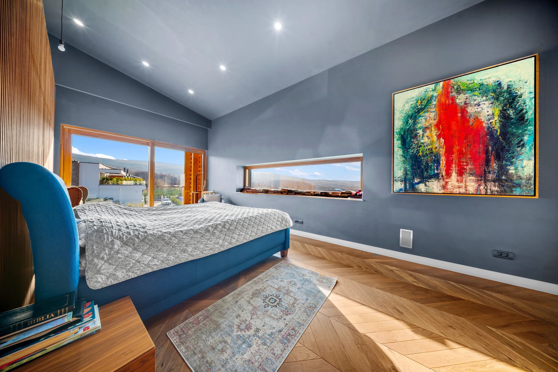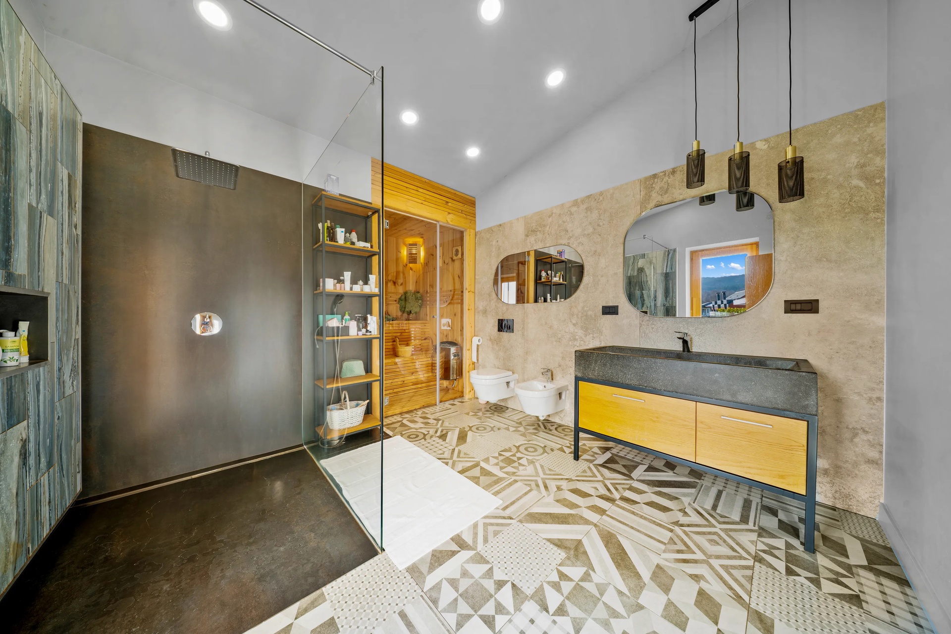 The first floor, spanning 113 sqm, is devoted entirely to private accommodation and offers an exceptional level of comfort and privacy. The bedrooms are generously proportioned, each benefiting from its own en-suite bathroom and intelligently integrated storage solutions. The principal suite is particularly impressive, featuring a spacious dressing area and a private bathroom complete with sauna, creating a true in-home wellness retreat. Open views towards the forest enhance the atmosphere of tranquility, while the terraces provide additional natural light and a strong connection to the outdoors.