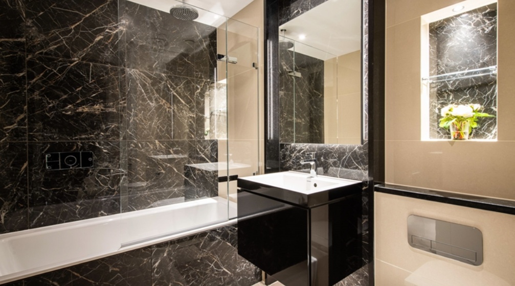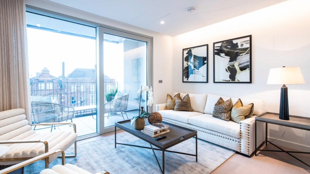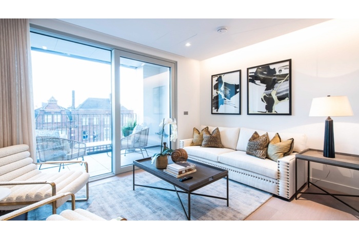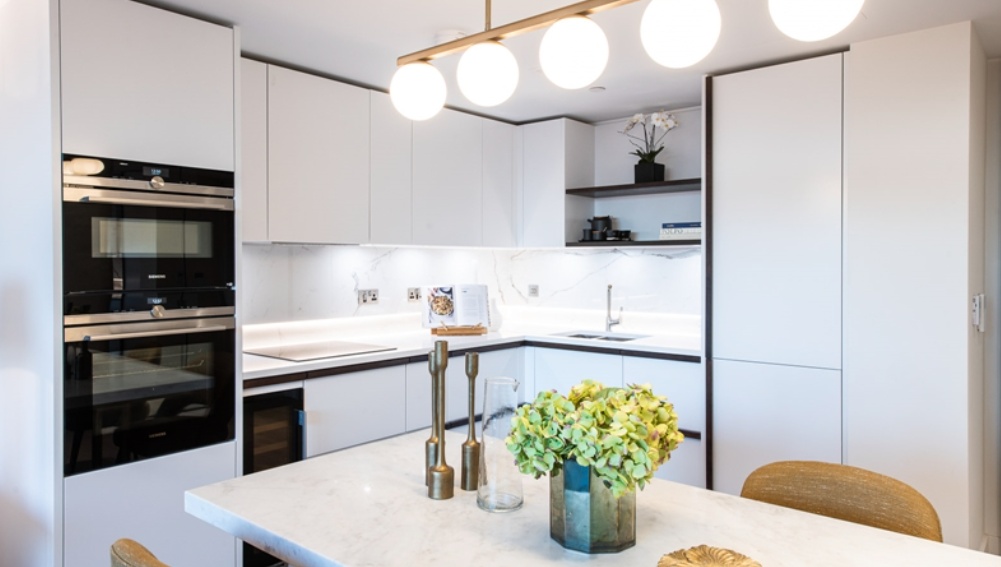 The fully integrated kitchen is finished to the highest standard with Siemens and Miele appliances, including an oven, induction hob, large fridge freezer, dishwasher, and wine chiller, all set within elegant composite stone worktops. The apartment benefits from comfort cooling throughout, ensuring year-round climate control.