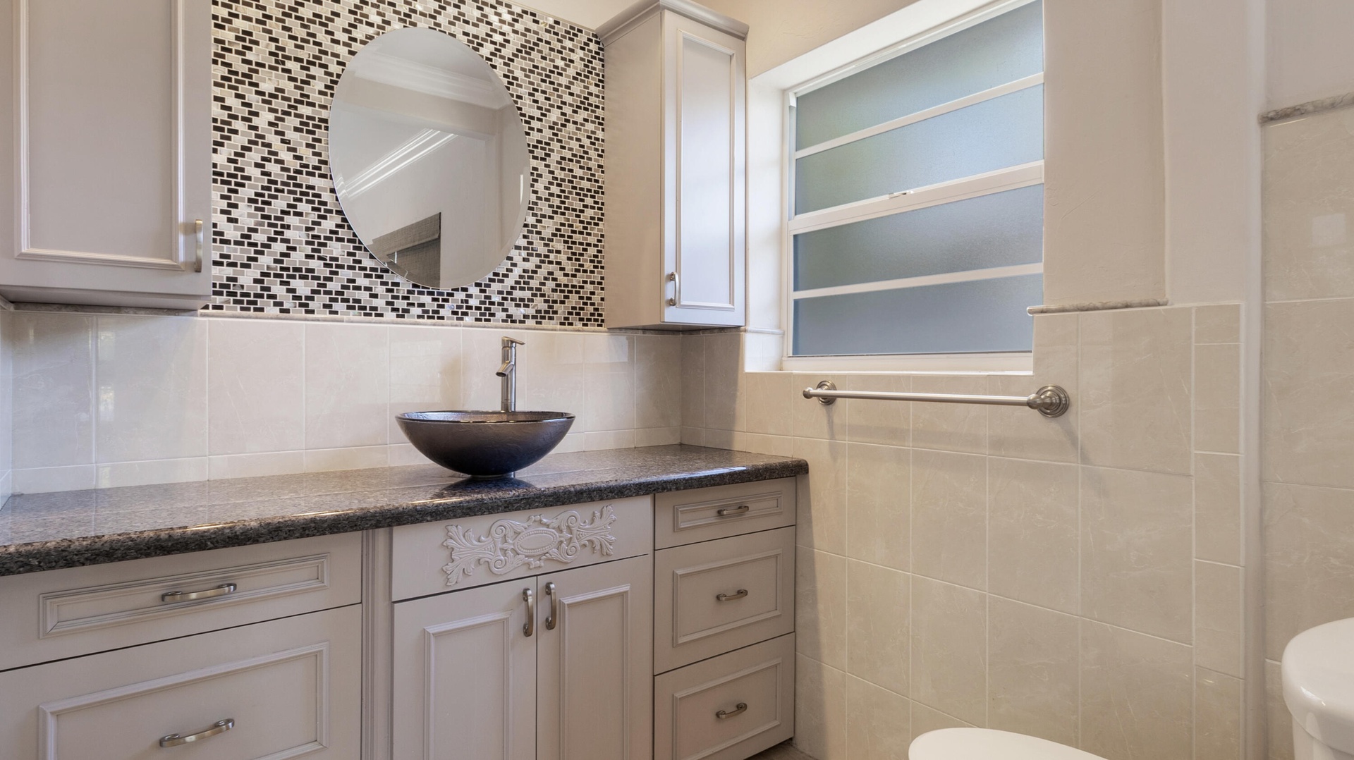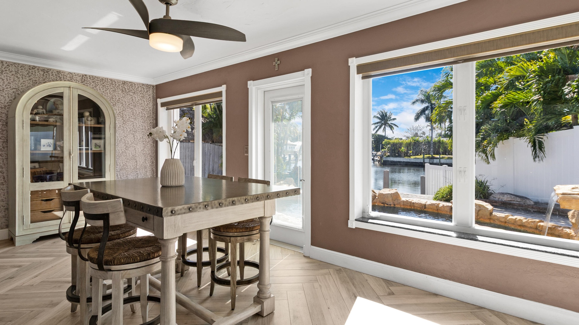 Set along the water with two fixed bridges, the property features its own private dock and a tropical backyard designed for relaxed South Florida living. A free-form pool with rock detailing and a waterfall feature creates a resort-style setting. Rinse off in the heated outdoor shower after a day on the water or at the beach.