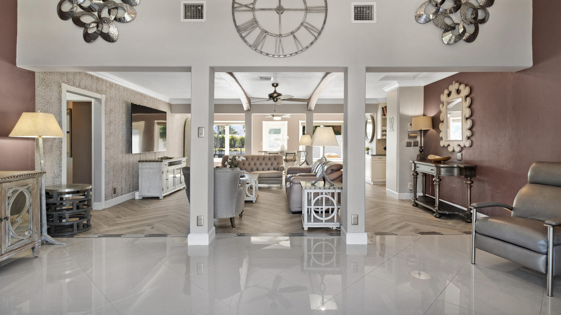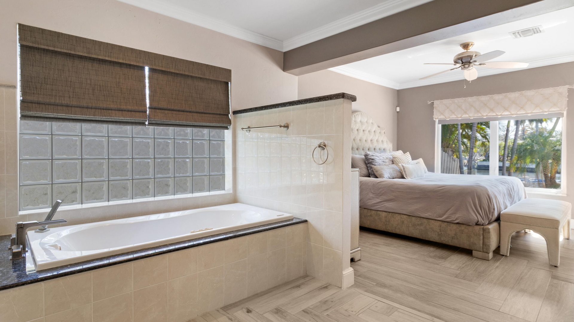 Inside, volume ceilings welcome you into a spacious entry and an open-concept great room designed to maximize light and water views. Modern herringbone-pattern ceramic tile runs throughout the main living space creating a clean, contemporary feel. The primary suite serves as your own private retreat with direct access to the backyard, walk-in closet with custom built-ins, and an open-concept spa-style bathroom featuring a separate walk-in shower, and jacuzzi tub.