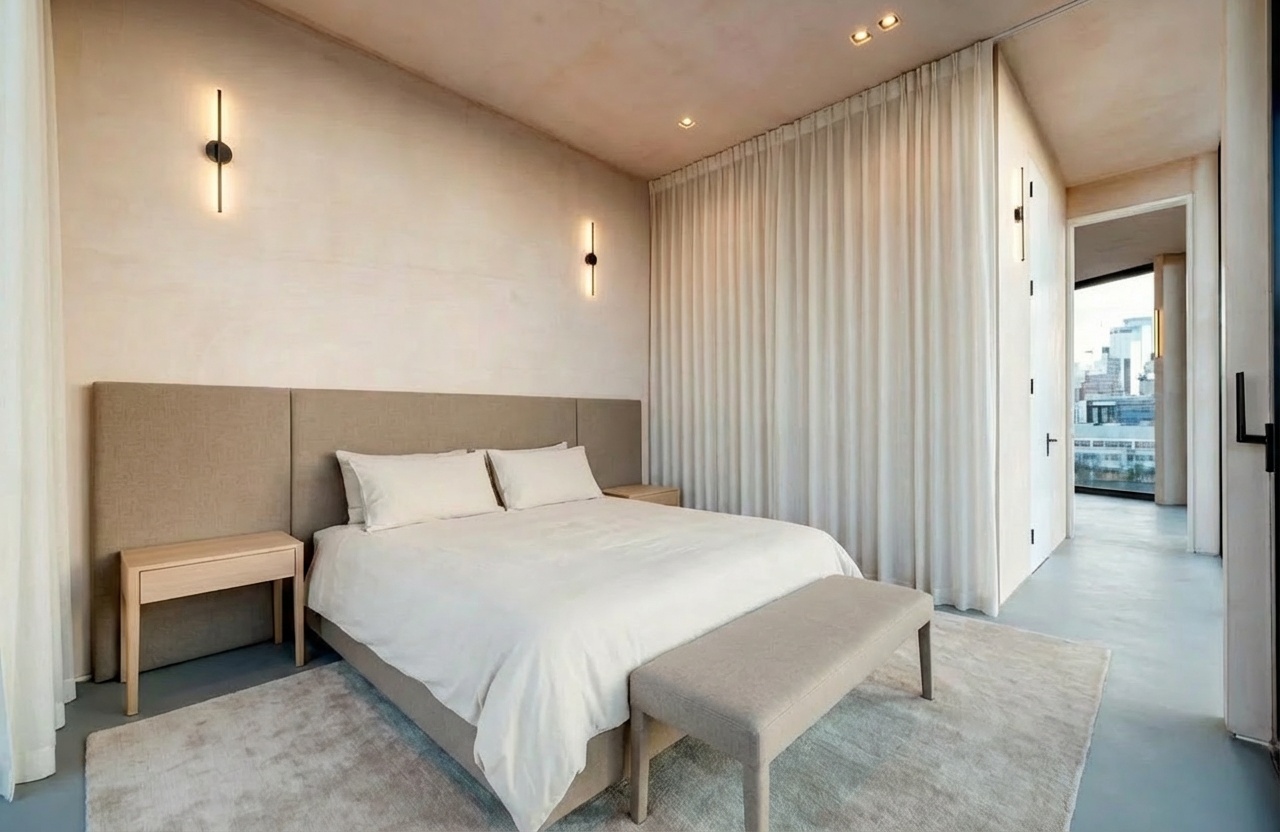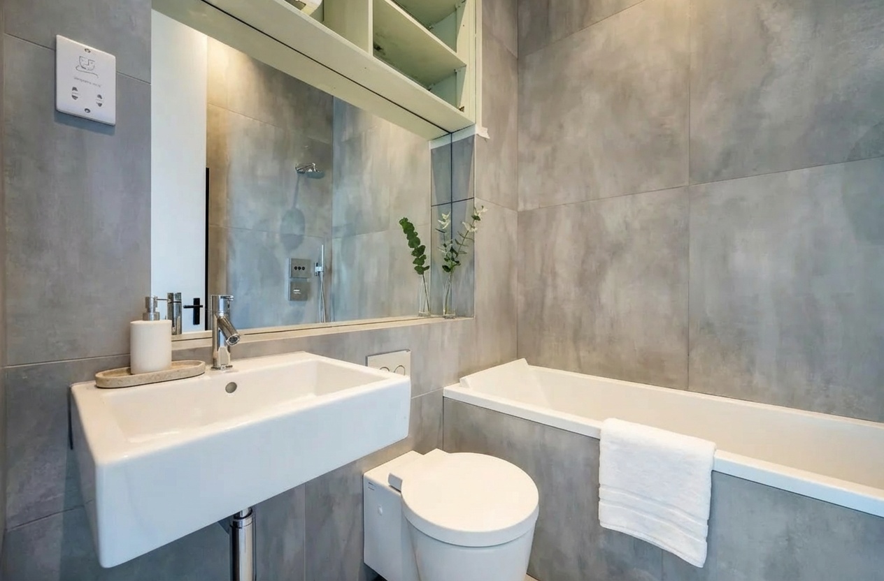 Bathrooms are minimal and contemporary, finished in large-format tiling with modern fittings, reinforcing the clean, architectural language seen throughout the apartment.