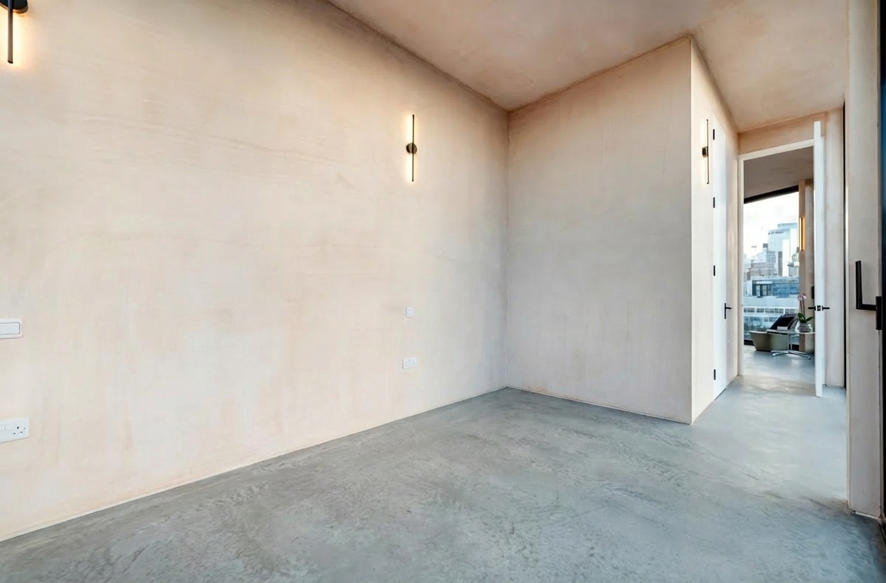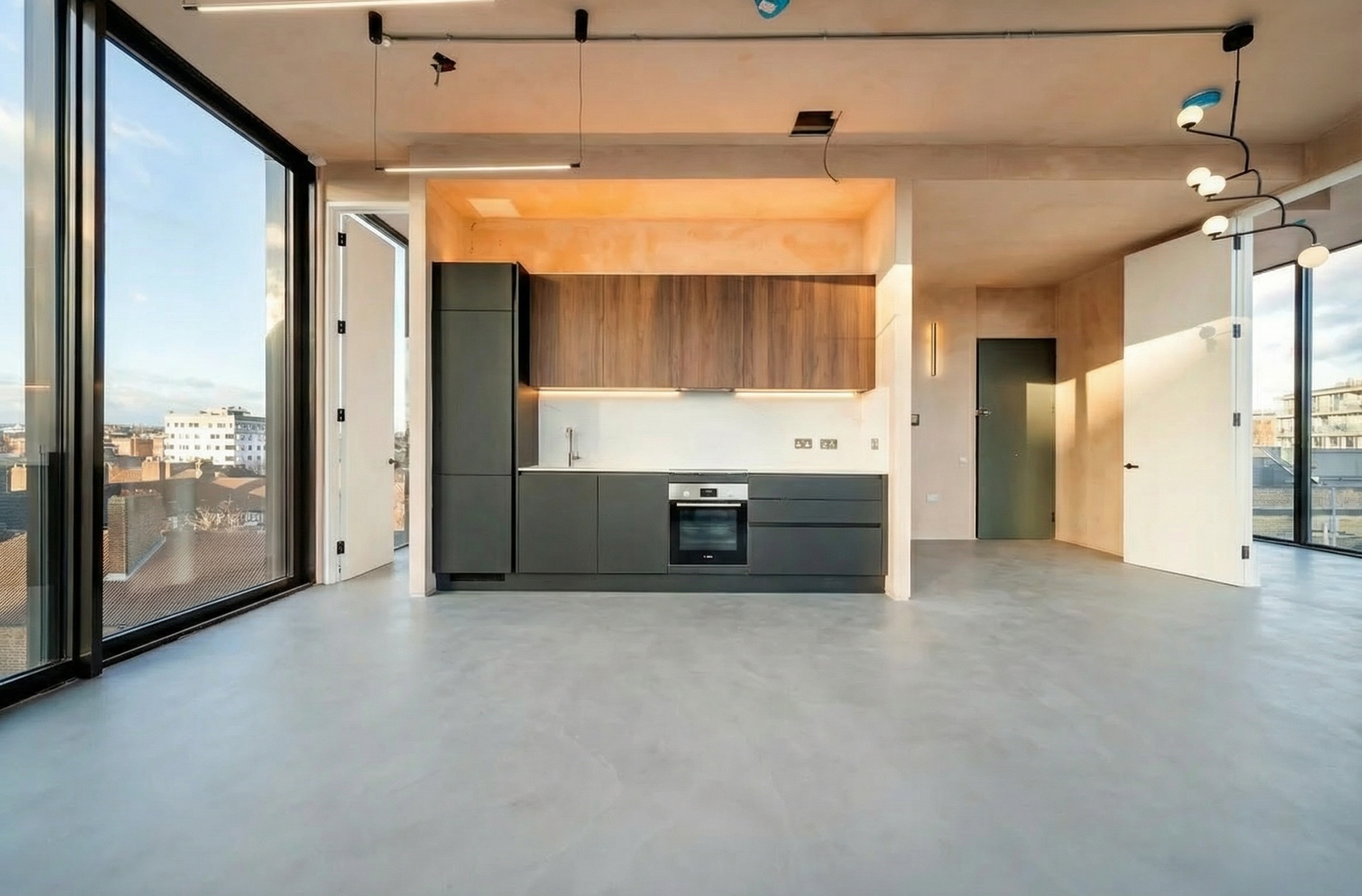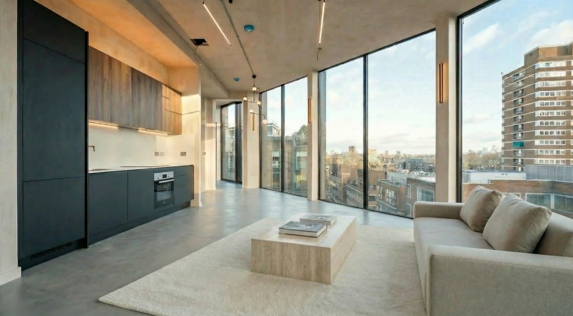The apartment is arranged around a generous open-plan living, dining, and kitchen space, framed by full-height, floor-to-ceiling glazing that wraps the perimeter of the home. Natural light enters from multiple aspects throughout the day, accentuating the polished concrete flooring, exposed structural elements, and hand-finished plaster walls that define the building’s refined industrial character.