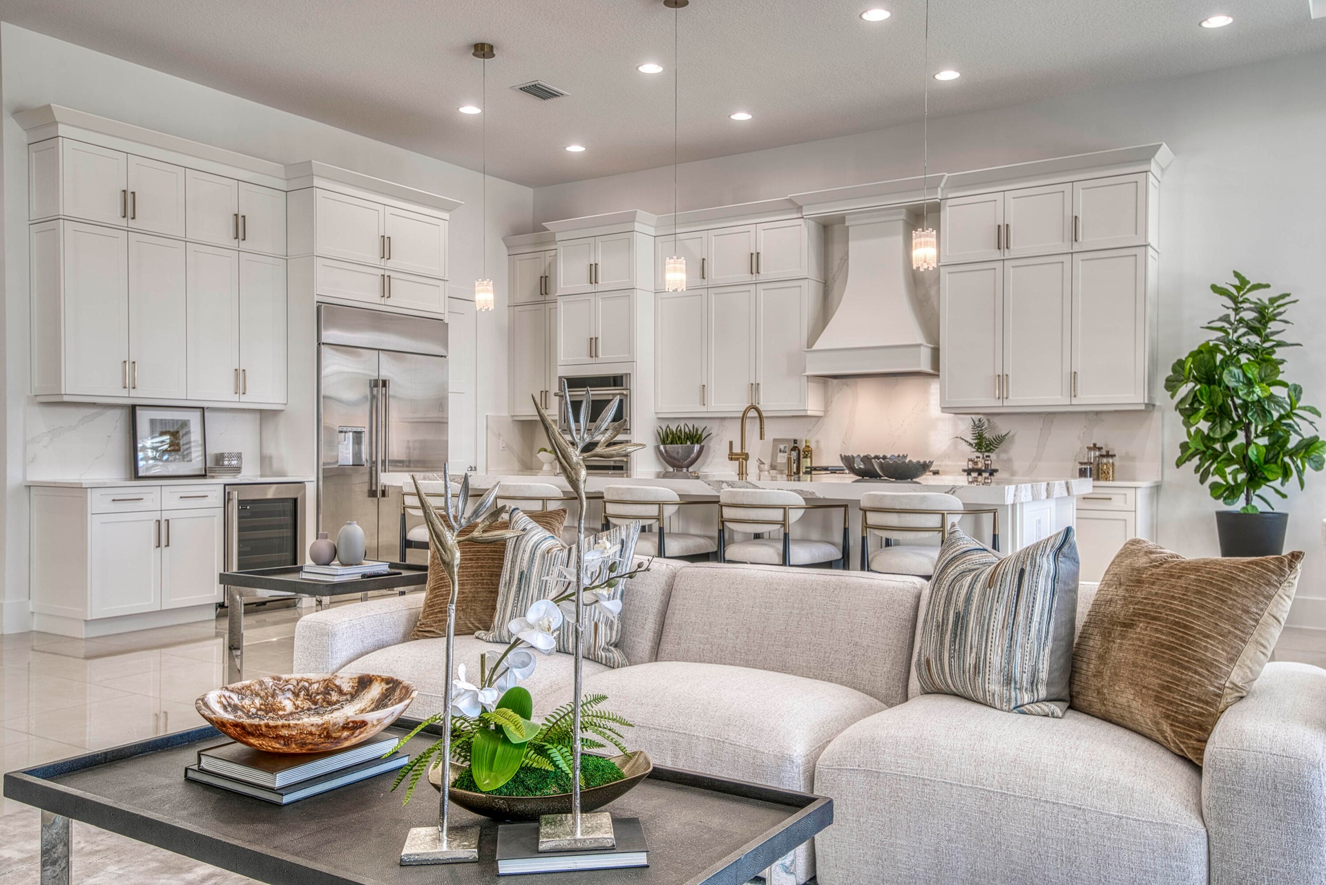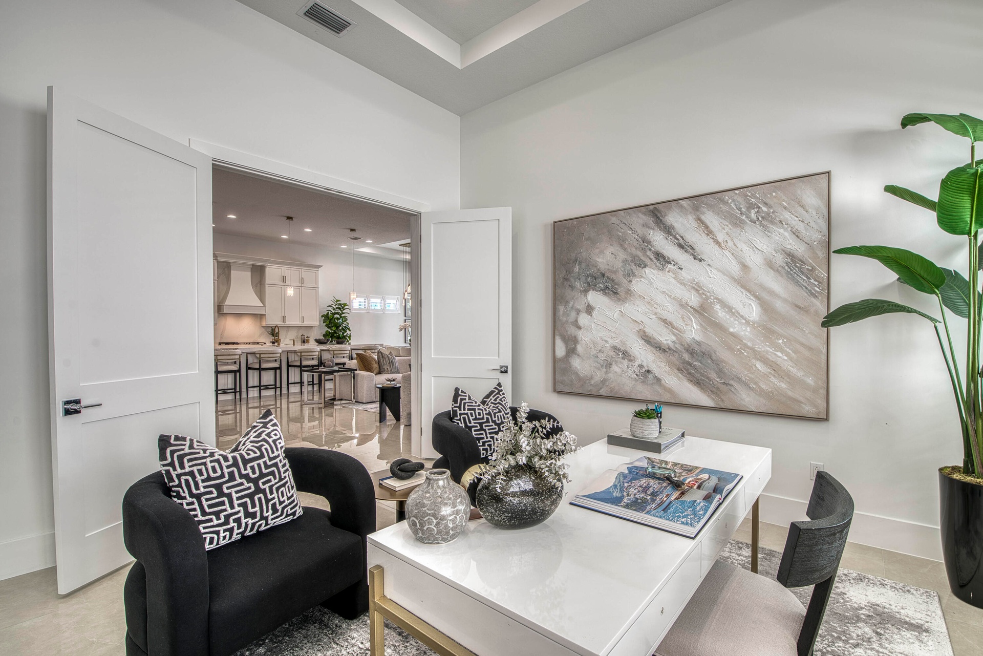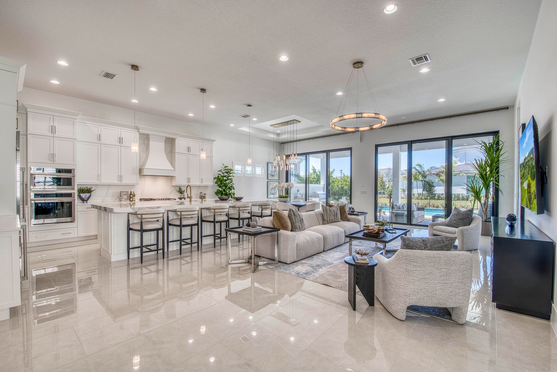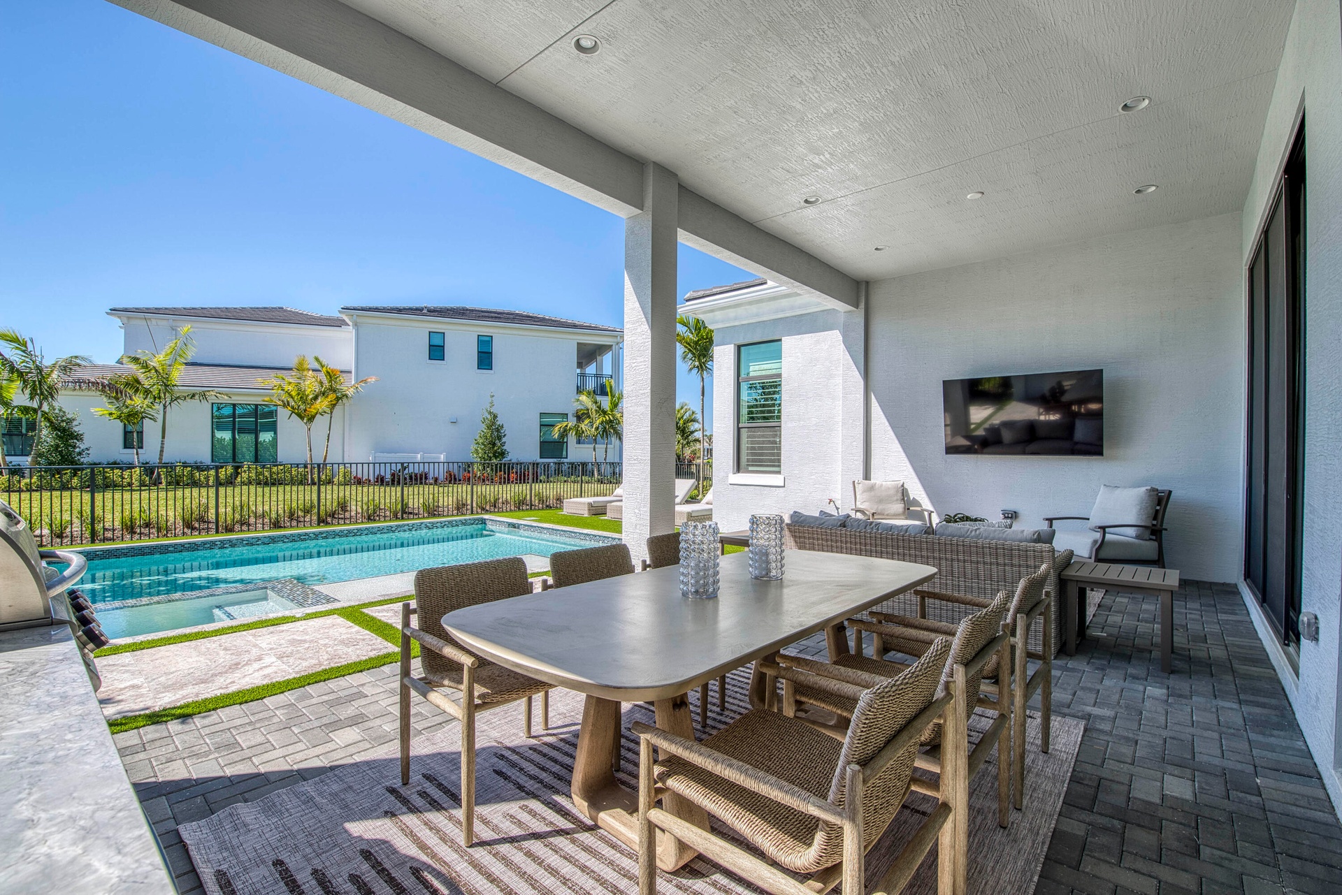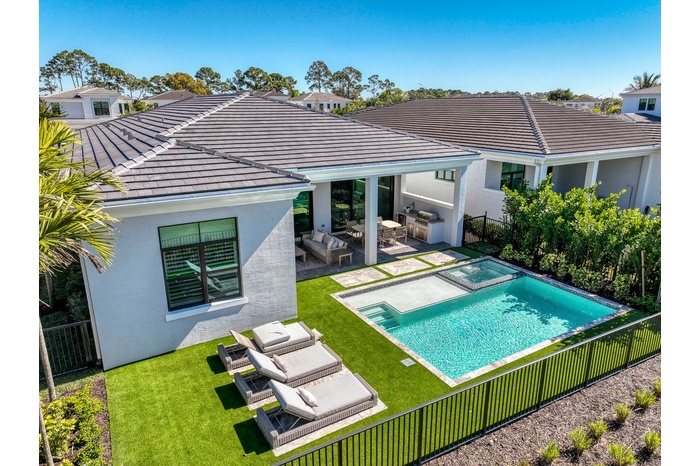 Welcome to this exquisite new construction residence in the gated community of Artistry in Palm Beach Gardens, where modern design and elevated finishes converge in a thoughtfully curated one-story floor plan. Offering 3 bedrooms, 3.5 baths, a private office, and a 3-car garage across 2,976 square feet under air, this home was crafted for both refined living and effortless entertaining. A seamless open layout unites the living, dining, and kitchen spaces, truly the heart of the home, accentuated by large-format tile flooring, custom lighting, 5'' baseboards, and a sophisticated linen-toned palette. The designer kitchen showcases custom white wood cabinetry, coordinating quartz countertops and backsplash, a premium stainless steel appliance package with gas cooktop, separate beverage refrigerator, and an expansive island with pull-up seating. Two oversized 10' sliding glass doors flood the space with natural light while framing views of the covered patio and resort-style pool and spa. The dedicated office, introduced by double doors and a recessed ceiling detail, provides a quiet and stylish workspace. All bedrooms feature en-suite baths and walk-in closets, with the primary suite serving as a true sanctuary. Its spa-inspired bath is appointed with a wall-to-wall dual vanity with center make-up station, floor-to-ceiling tile, soaking tub, glass-enclosed shower, bronze fixtures, and statement lighting. Outdoor living is equally compelling, highlighted by an expansive covered patio designed for year-round enjoyment. A fully equipped summer kitchen with built-in grill anchors the dining area, while the lounge space is prepped for a wall-mounted TV. The sparkling pool and integrated spa with sunshelf are surrounded by turf greenery and lush tropical landscaping, creating a private resort ambiance. Additional features include impact windows and doors, white plantation shutters, and a dedicated laundry room with sink and added storage. This exceptional residence offers the perfect blend of new construction peace of mind and sophisticated modern luxury in one of Palm Beach Gardens' most sought-after gated communities.