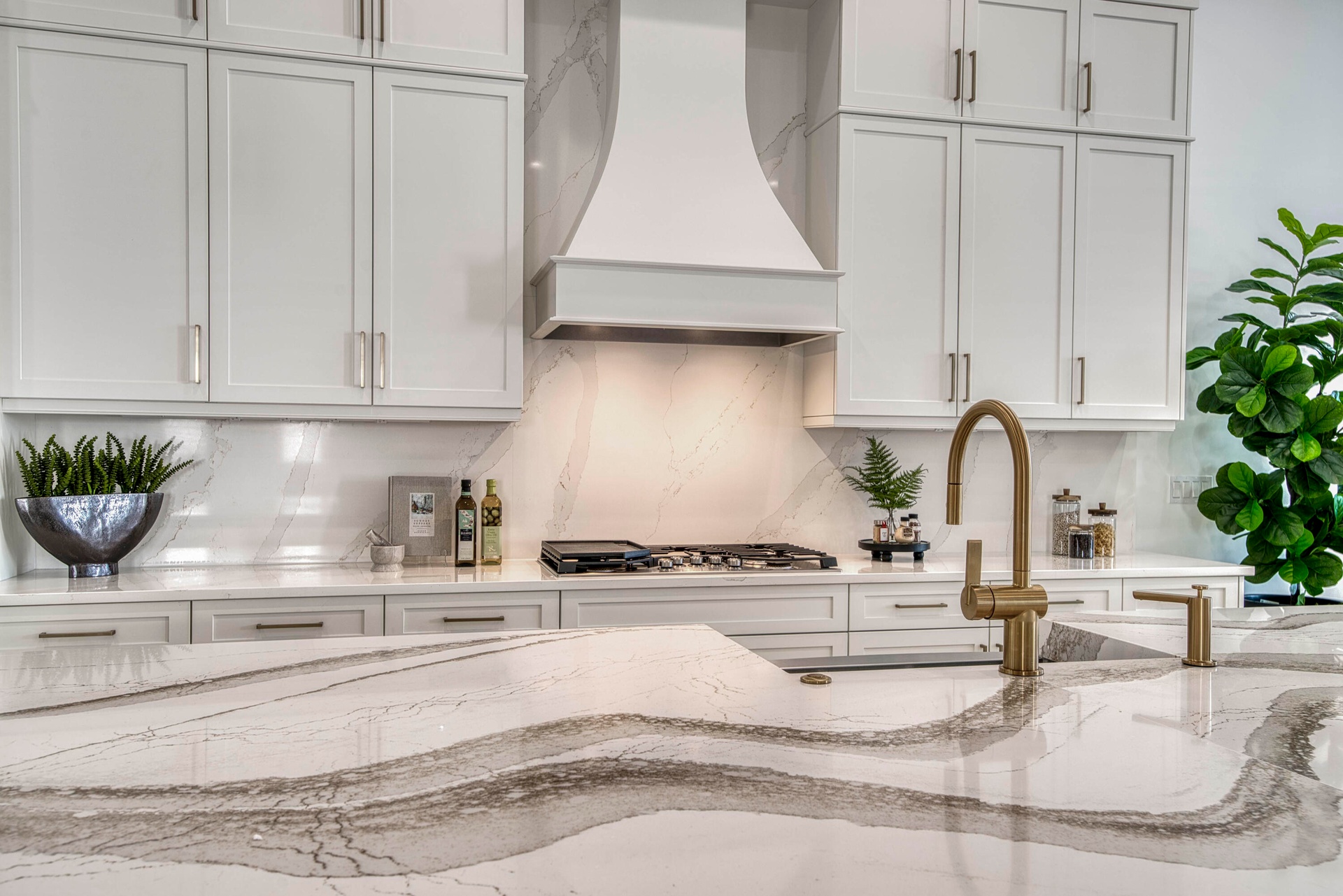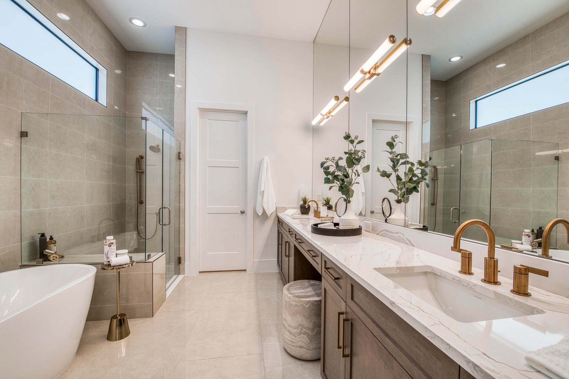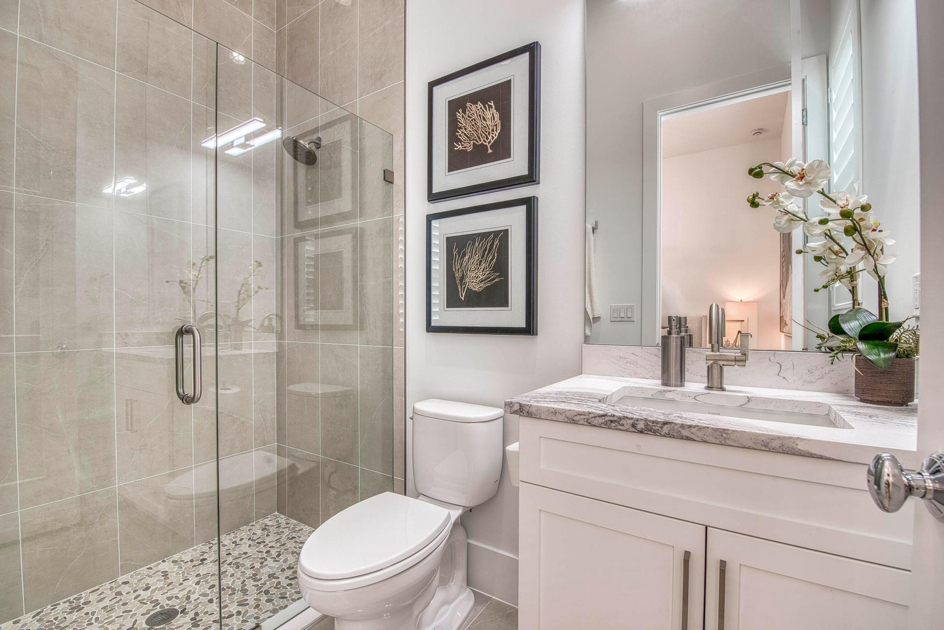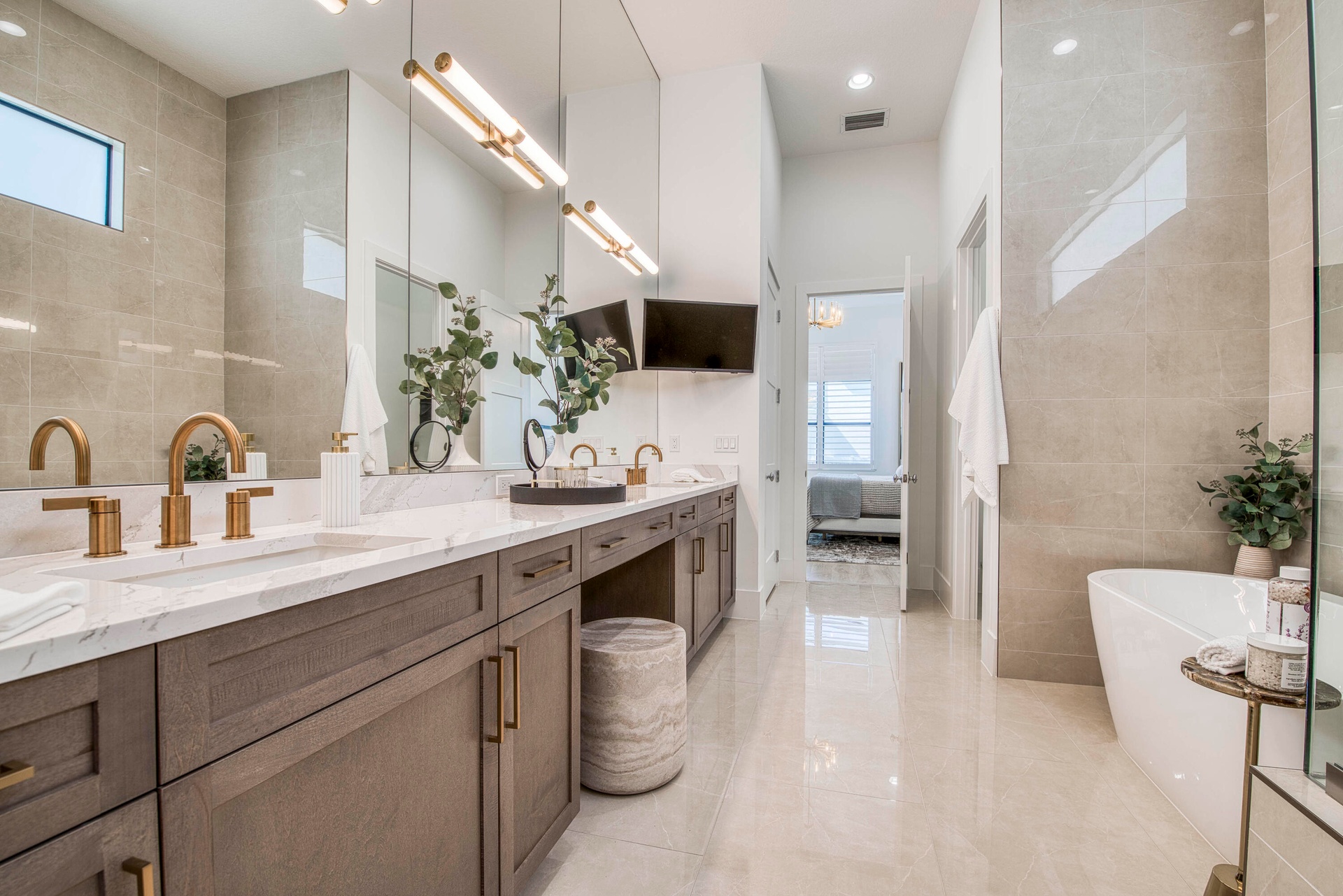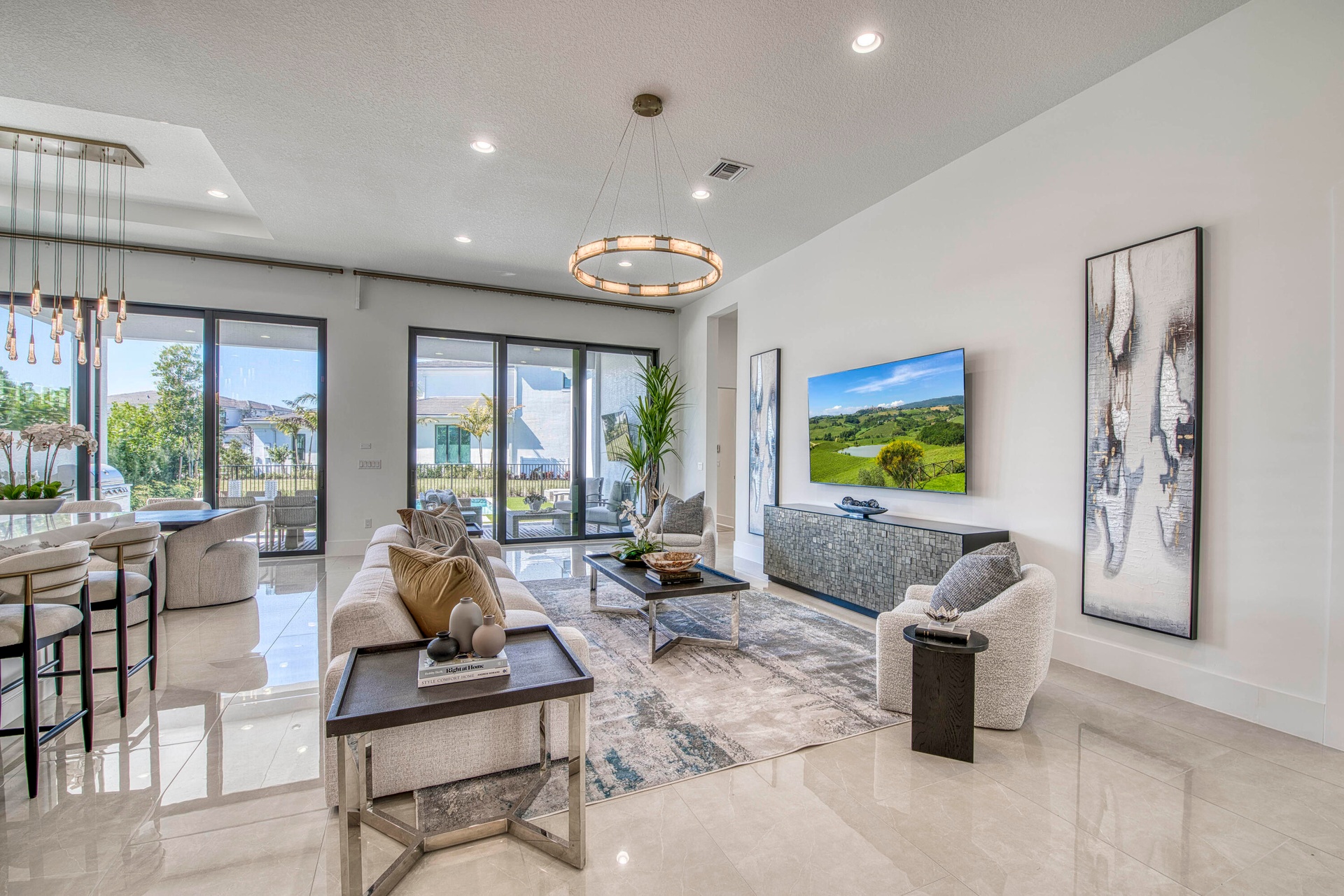 Welcome to this exquisite new construction residence in the gated community of Artistry in Palm Beach Gardens, where modern design and elevated finishes converge in a thoughtfully curated one-story floor plan. Offering 3 bedrooms, 3.5 baths, a private office, and a 3-car garage across 2,976 square feet under air, this home was crafted for both refined living and effortless entertaining. A seamless open layout unites the living, dining, and kitchen spaces, truly the heart of the home, accentuated by large-format tile flooring, custom lighting, 5'' baseboards, and a sophisticated linen-toned palette. The designer kitchen showcases custom white wood cabinetry, coordinating quartz countertops and backsplash, a premium stainless steel appliance package with gas cooktop, separate beverage refrigerator, and an expansive island with pull-up seating. Two oversized 10' sliding glass doors flood the space with natural light while framing views of the covered patio and resort-style pool and spa. The dedicated office, introduced by double doors and a recessed ceiling detail, provides a quiet and stylish workspace. All bedrooms feature en-suite baths and walk-in closets, with the primary suite serving as a true sanctuary. Its spa-inspired bath is appointed with a wall-to-wall dual vanity with center make-up station, floor-to-ceiling tile, soaking tub, glass-enclosed shower, bronze fixtures, and statement lighting. Outdoor living is equally compelling, highlighted by an expansive covered patio designed for year-round enjoyment. A fully equipped summer kitchen with built-in grill anchors the dining area, while the lounge space is prepped for a wall-mounted TV. The sparkling pool and integrated spa with sunshelf are surrounded by turf greenery and lush tropical landscaping, creating a private resort ambiance. Additional features include impact windows and doors, white plantation shutters, and a dedicated laundry room with sink and added storage. This exceptional residence offers the perfect blend of new construction peace of mind and sophisticated modern luxury in one of Palm Beach Gardens' most sought-after gated communities.