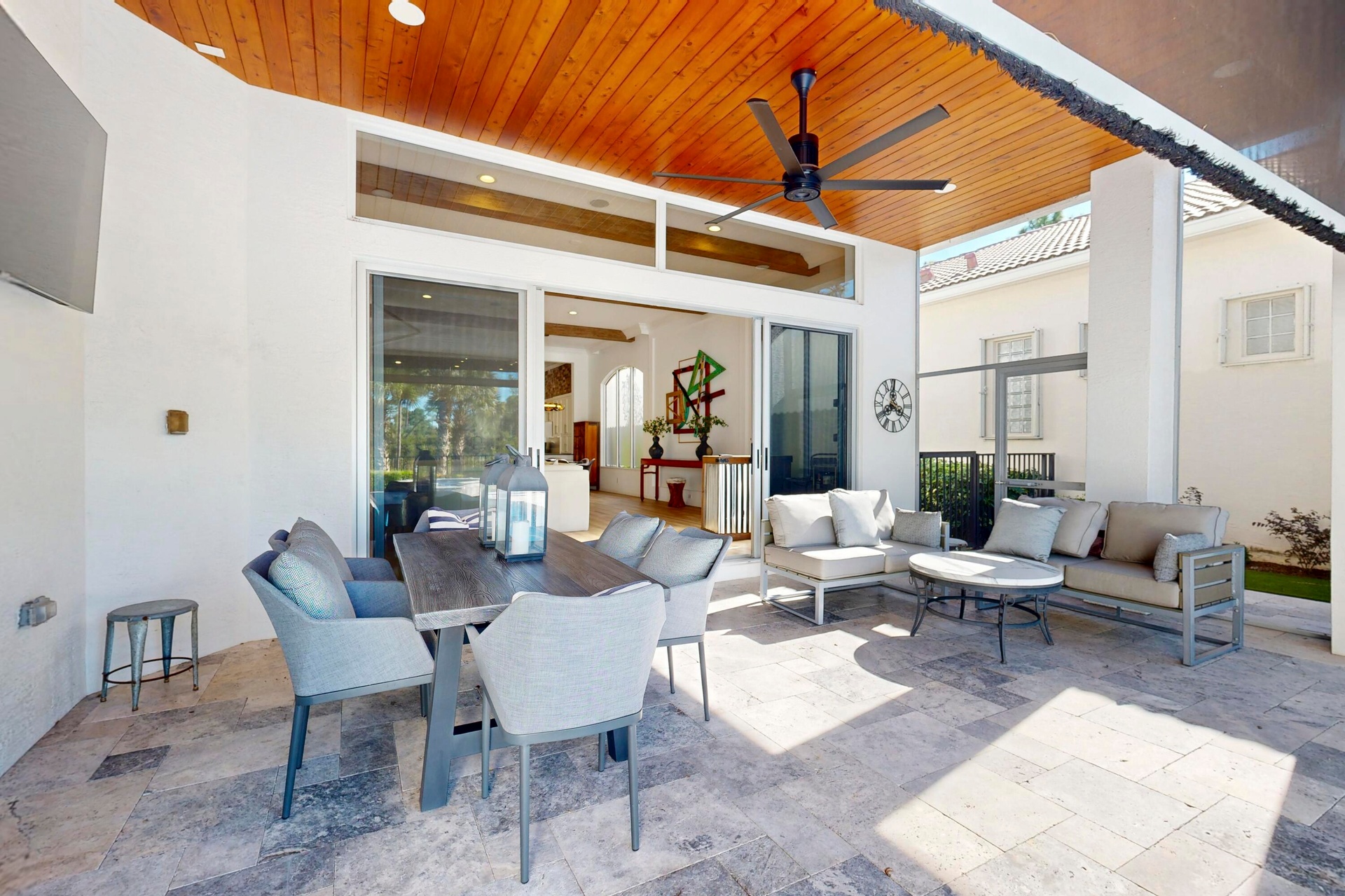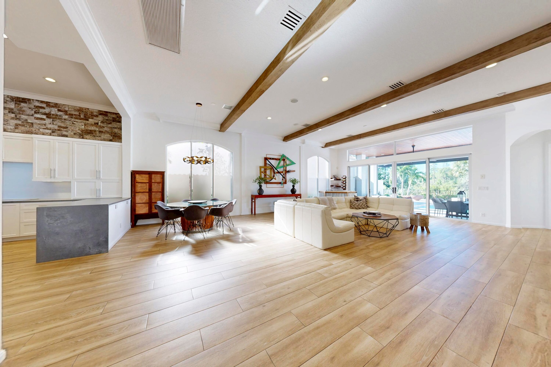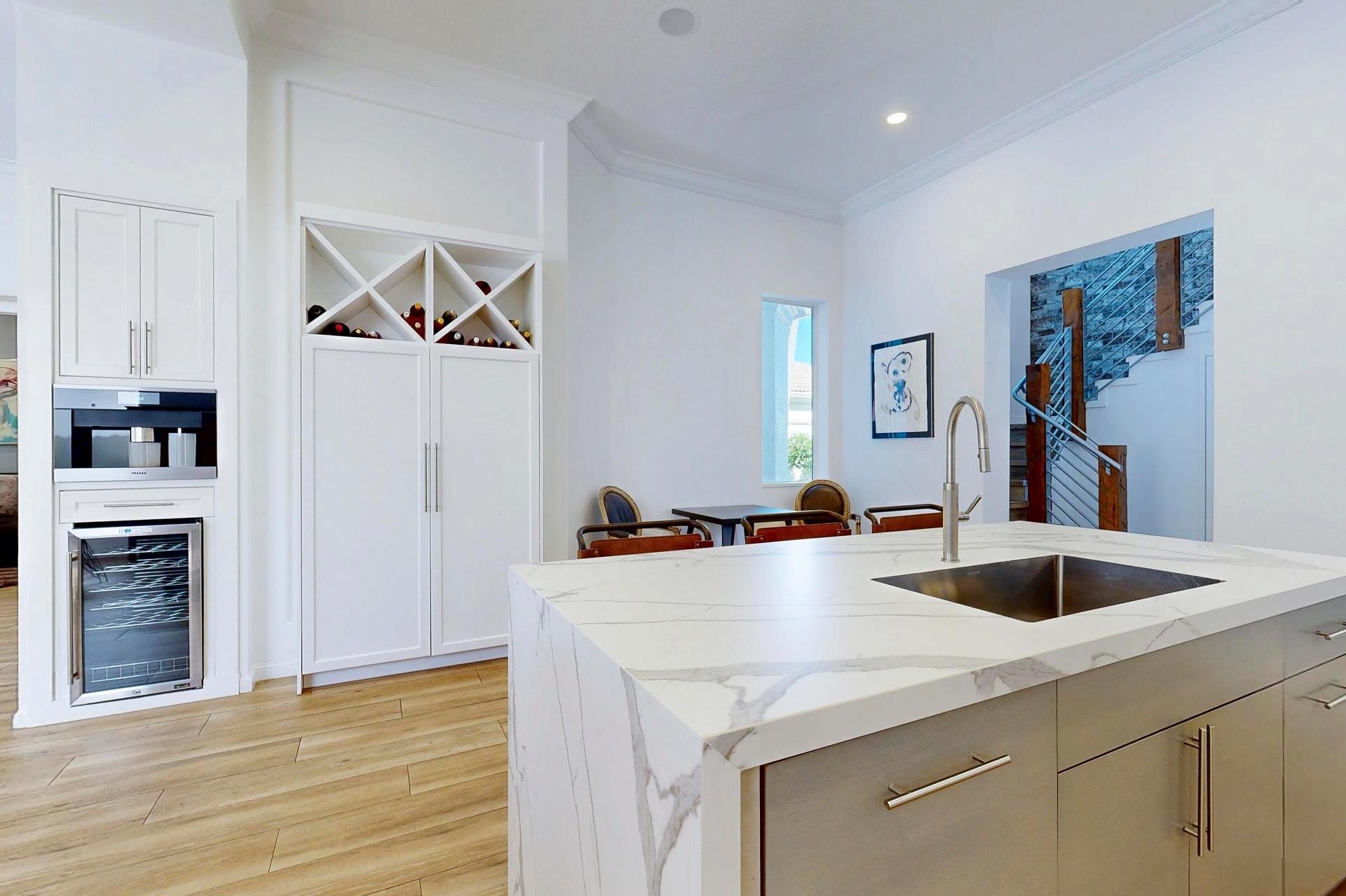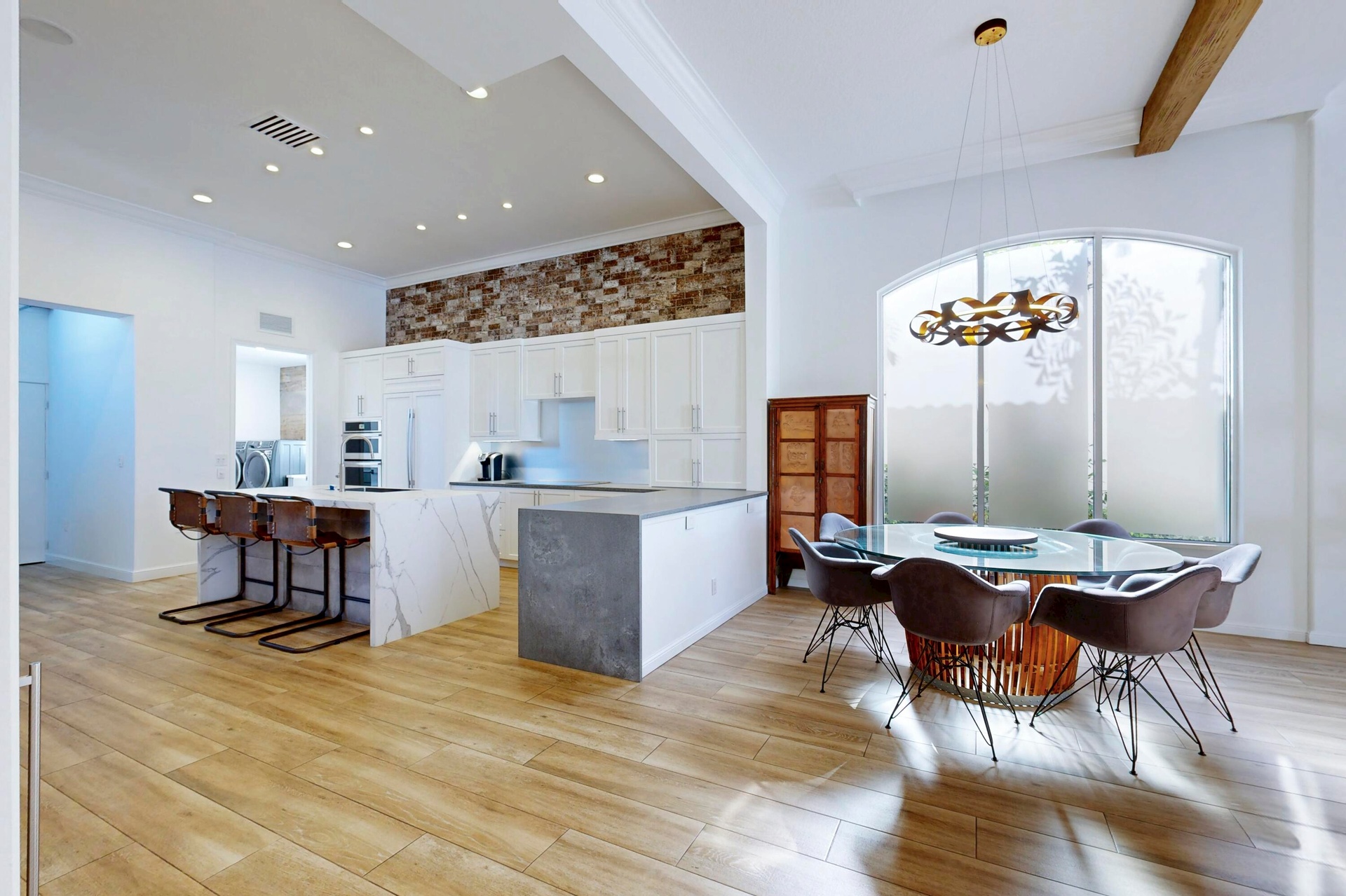 A one-of-a-kind, fully renovated two-story industrial modern home with a golf membership. Offering turnkey living and tucked away on a private cul-de-sac. The residence has been completely updated from front to back, including a new roof, driveway, three air conditioning units, water heater, electrical panels, and a Tesla charging outlet. The newly constructed upper level features a spacious bedroom with a stunning en-suite bathroom, walk-in closet, and a flexible loft-style office/den. An architecturally designed staircase leads down to the open-concept first floor, which includes three additional bedrooms and bathrooms, including the primary suite. Toto washlet toilets in 3 of the 4 bathrooms,Large kitchen has a center island, built in Miele coffeemaker, wine refrigerator,Jenn-air oven The chef's kitchen showcases a large center island, built-in Miele coffee maker with wine refrigerator, Jenn-Air oven, wood-paneled double-door refrigerator, dishwasher, and Thermador induction cooktop. The living room is highlighted by a custom bar with a second wine refrigerator, exposed wood beams, and a cozy fireplace.
