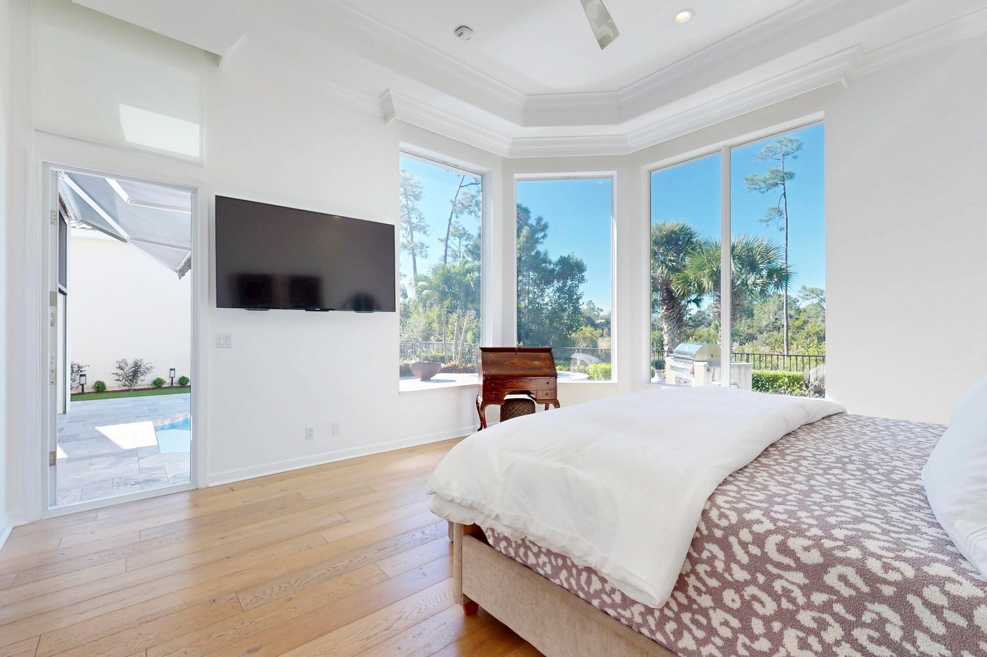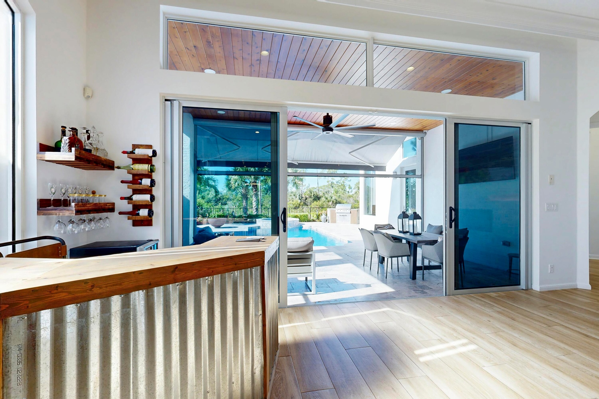 Impact windows and doors are installed throughout, with accordion shutters on the side of the home. The serene outdoor space overlooks a peaceful preserve and features a travertine deck, newly replastered saltwater pool, firepit, and built-in BBQ. The expanded lanai offers generous seating, a cedar wood ceiling, an automatic drop-down screen, and a large retractable awning for shade while maintaining an open, airy feel.