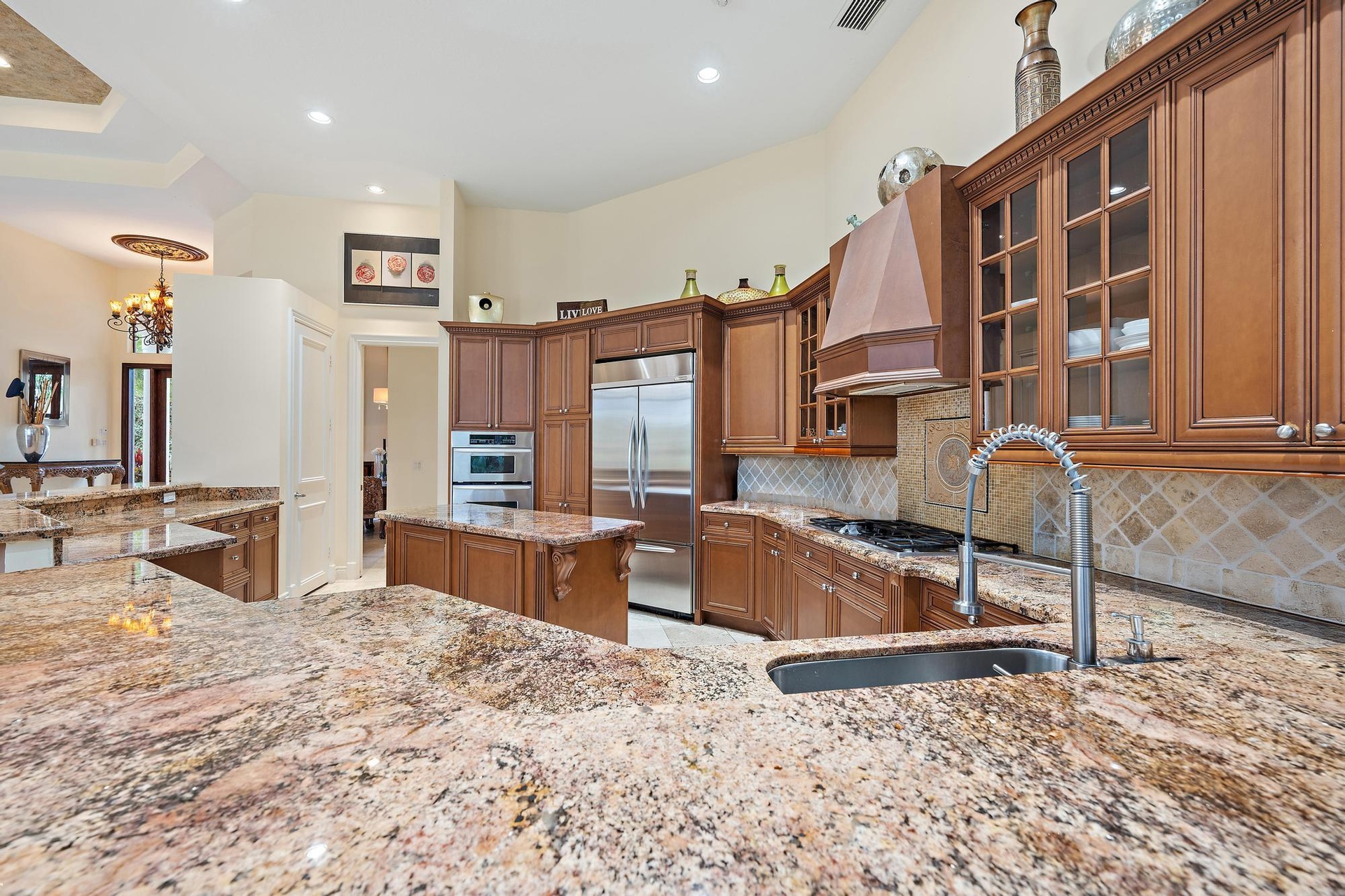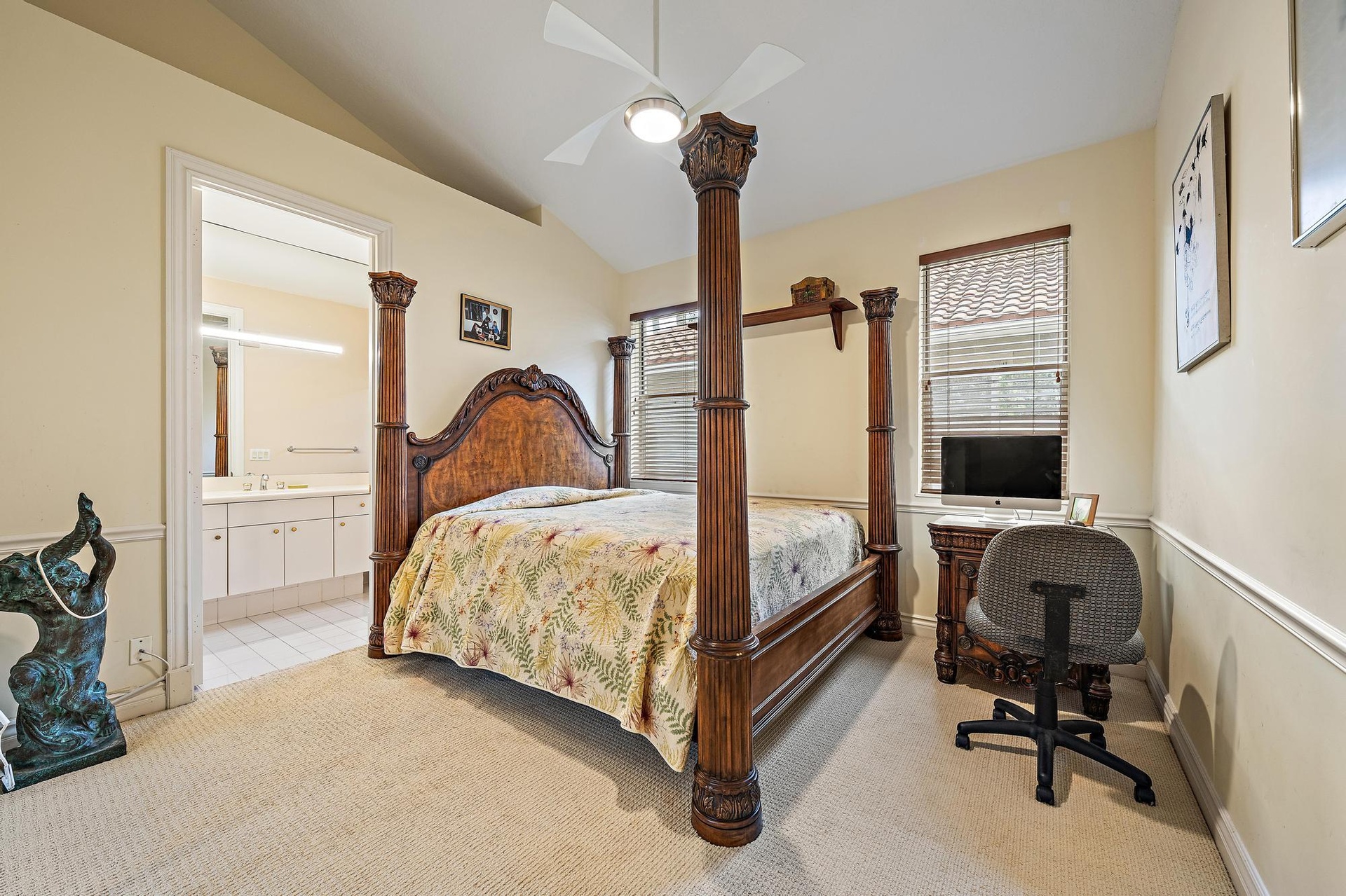 The split-bedroom floor plan provides privacy for all, with three guest bedrooms offering en-suite baths. Outdoor living is equally inviting, featuring a large covered patio, and a spacious pool and spa positioned to capture beautiful west-facing golf course sunsets. A previously added aviary in the family room will be removed, with the wall professionally restored and extended to its original design, ensuring a clean and cohesive living space.