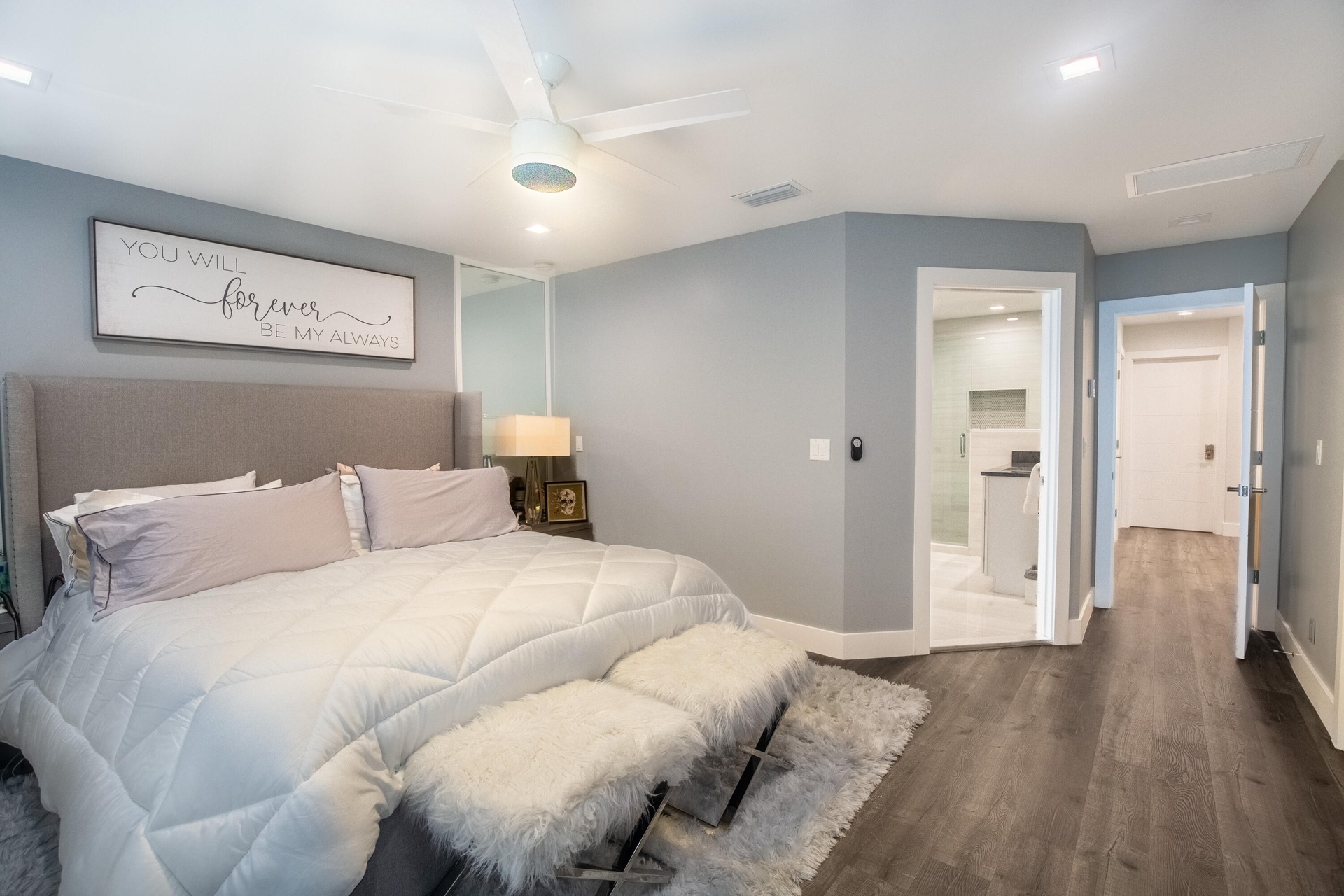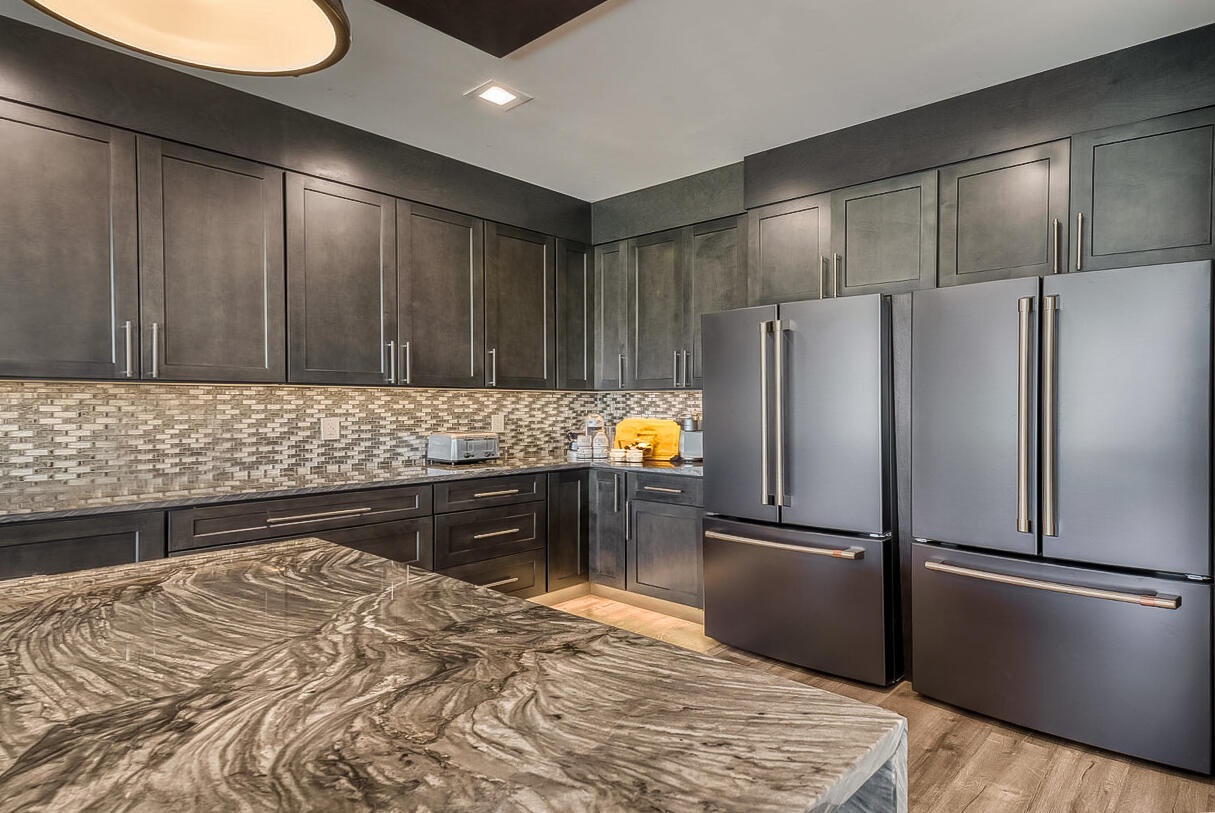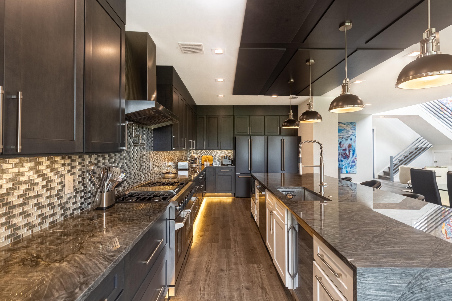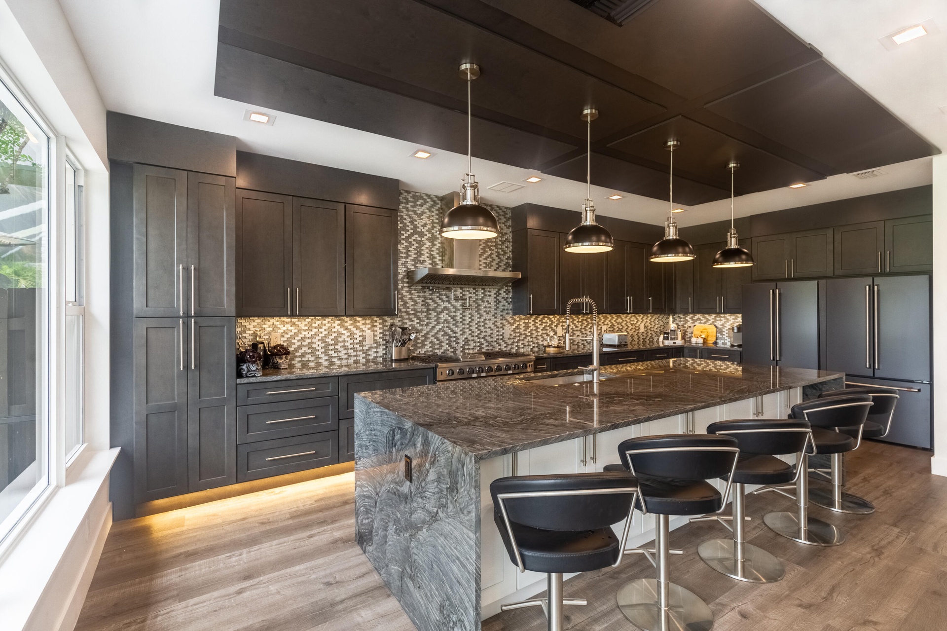 With 2,700 square feet of refined space, the interior features soaring ceilings, abundant natural light, and a versatile layout. The first floor showcases newly installed flooring, a stunningly renovated kitchen with dramatic quartz waterfall-edge countertops, premium appliances, and an inviting open flow to the living and dining areas. An office and powder room add convenience and functionality.