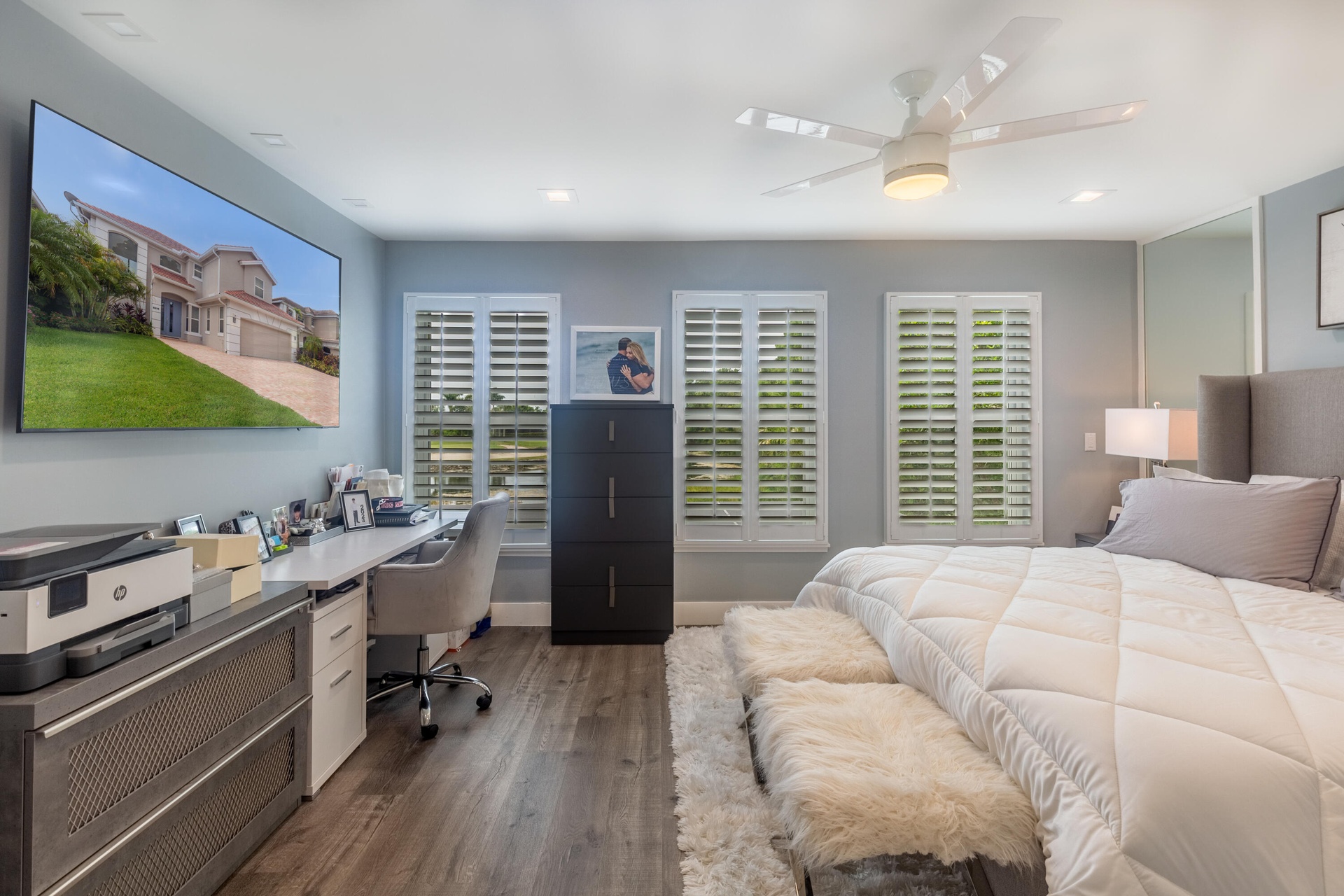 Upstairs, the private quarters include three bedrooms and an oversized primary suite designed for relaxation. A spacious loft offers additional living or working space, perfect for today's lifestyle needs. Outdoors, the screened patio with heated pool creates a serene retreat, framed by the picturesque water and fairway views for which Ibis is renowned.