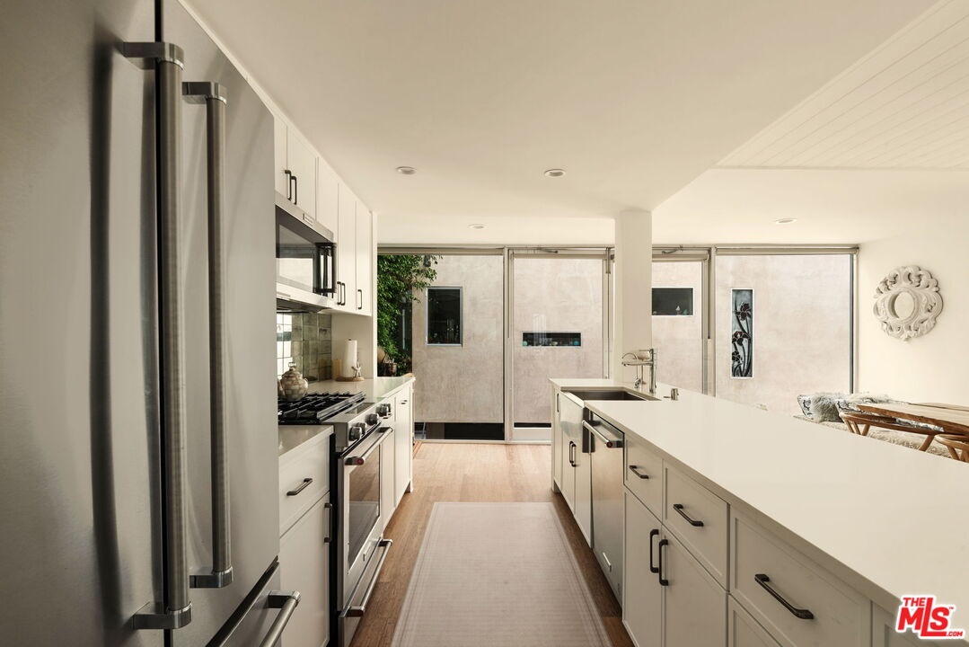Welcome to 657 Mildred Avenue, a contemporary architectural residence set in the heart of Venice's Silver Triangle, moments from the canals, Abbot Kinney Boulevard, the Marina, and the beach. Thoughtfully reimagined, this multi-level home blends modern design, flexible living spaces, and indoor-outdoor flow to support a true Venice lifestyle.The interior opens to light-filled living spaces defined by vaulted ceilings, floor-to-ceiling windows, and a loft-like open floor plan. Polished designer concrete and bamboo wood flooring, paired with custom wool stair runners, create a refined yet relaxed aesthetic throughout. The main living level seamlessly connects the living, dining, and kitchen areas, anchored by a sleek modern kitchen remodeled in 2025 and a fireplace that grounds the space for everyday living and entertaining.The primary suite serves as a private retreat, featuring a fireplace, dual walk-in closets, and a spa-style en-suite bathroom with oversized shower and tub. Additional bedrooms are thoughtfully positioned across multiple levels to provide privacy and versatility. In total, the home offers four bedrooms, three full bathrooms, and two half bathrooms.A spiral staircase leads to the expansive rooftop deck, offering sweeping city views with a peek of the ocean and ample space for lounging, dining, and entertaining. The roof was replaced in 2024, with approximately half of the roof area intentionally left open to accommodate future solar installation.Designed for indoor-outdoor living, the property includes a private garden area, gas BBQ, and an outdoor shower. The home is currently configured with a separated one-bedroom, one-and-a-half-bath portion of the residence with its own entrance and second kitchen, offering additional functional living space ideal for a guest suite, home office, creative studio, or extended living area.The main residence measures approximately 2,166 square feet, with an additional approximately 342 square feet of converted usable space, for a vendor-enhanced total of approximately 2,508 square feet. Buyer to verify all square footage to their satisfaction.Modern, flexible, and well-positioned, 657 Mildred Avenue offers architectural presence and proximity to Venice's most iconic destinations, delivering a compelling opportunity in one of the area's most sought-after neighborhoods.