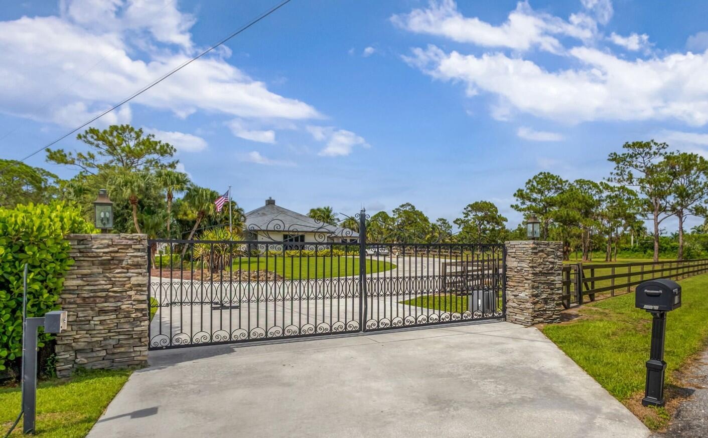 Exceptional 10-Acre Estate with Two Residences. Your privacy begins with the gated entrance to the property framed by two stone columns opening to 10 acres of beautifully manicured open land.