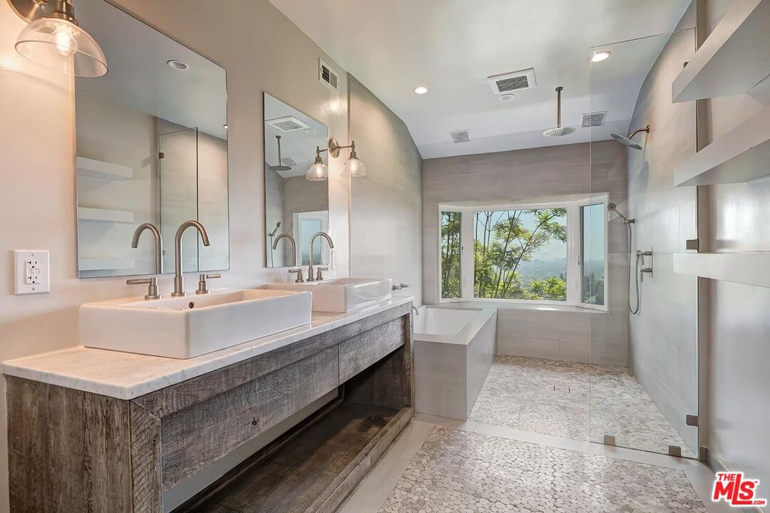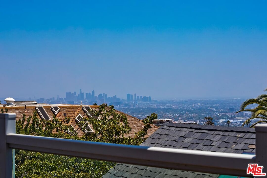 Gothic-Inspired home with Panoramic Views in Prime BHPO. Set high above the city in a peaceful & private enclave of Beverly Hills Post Office, this striking 3 bed + 3.5 bath + bonus room home blends dramatic Gothic-inspired architecture with modern luxury. Designed by a celebrity designer, the residence showcases custom wood detailing & breathtaking 180 views of the city skyline, ocean & canyons from every room. The expansive living room with soaring beamed ceilings is filled with natural light, featuring a stunning stone fireplace, oversized windows framing Downtown LA, & seamless flow into the dining area & out to an entertainer's dream deck. Spanning almost the entire length of the home, the deck offers unobstructed panoramic views & is ideal indoor/outdoor living. The chef's kitchen includes high-end stainless-steel appliances, tons of cabinetry, stylish tile flooring, & a bay window with hillside vistas. A convenient door opens directly to the deck perfect for morning coffee or al fresco dining. The primary suite is a true retreat, with a full wall of windows showcasing sweeping city & hill views, a massive walk-in dressing room with custom built-ins, & an additional wall of closets, ideal for the fashion-forward tenant. The spa-like en-suite bath is beautifully renovated, featuring double sinks, intricate tilework, a soaking tub inside the shower, & a bay window overlooking the treetops & skyline. The main level also includes a light-filled 2nd bedroom with built-ins, a fully renovated hall bathroom with skylight, & a chic powder room. Downstairs offers the 3rd bedroom en-suite with updated bathroom, a bonus room for a home office or creative space, a laundry room, & the direct access garage, complete with abundant storage & rubberized flooring, should you want to use it as a home gym. Surrounded by prestigious estate properties, this one-of-a-kind residence offers privacy, incomparable design, & effortless access to the best of Beverly Hills, the Valley, West Hollywood & the Westside.
