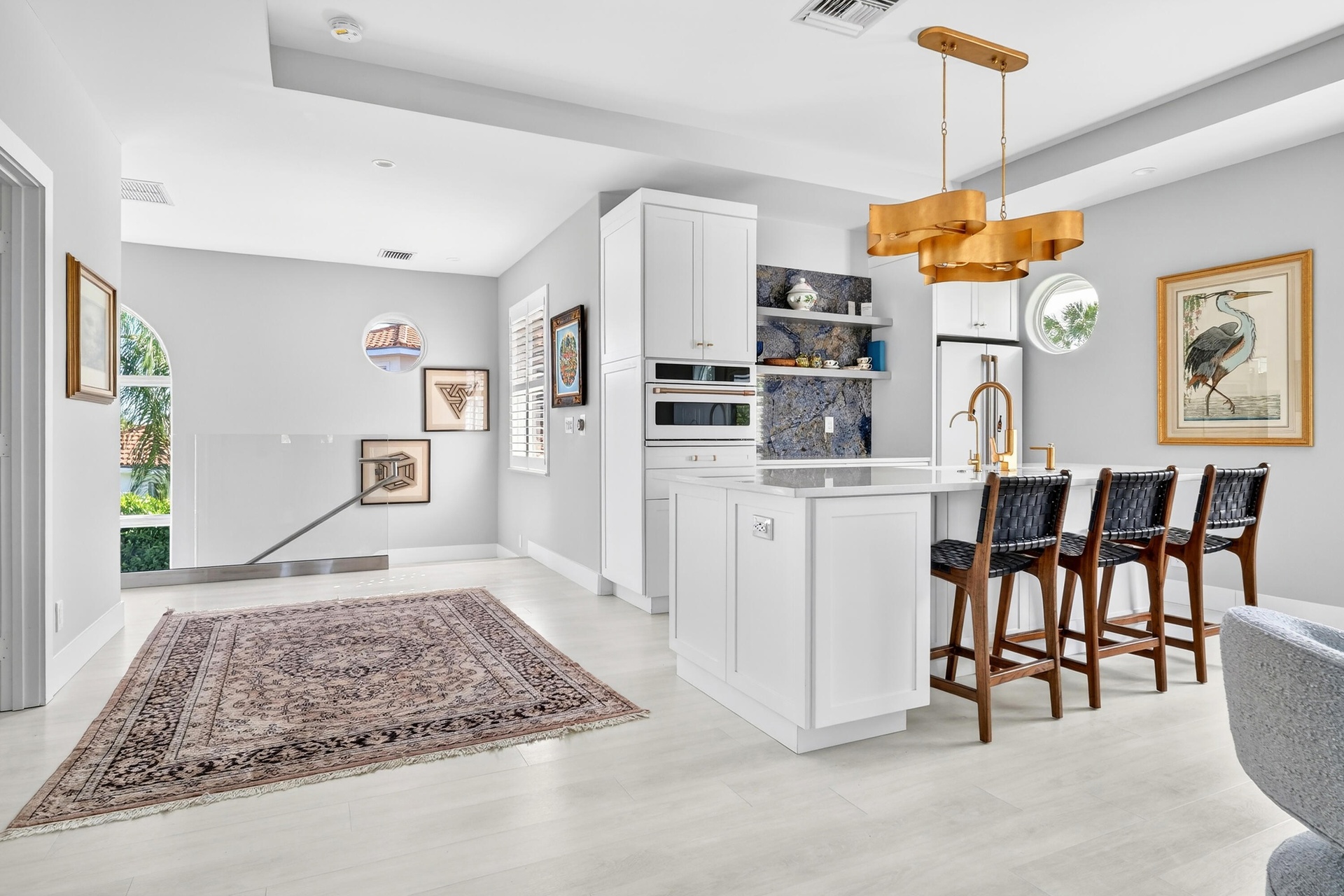 Bring your cherished collectible cars to this spectacular contemporary residence, perfectly tucked away on a peaceful cul-de-sac overlooking the fresh waters of Lake Mangonia. Custom built in 2019 by the current owner, this gracious home offers a versatile canvas designed to complement a wide range of taste and lifestyles. Nestled in the heart of West Palm Beach within the prestigious gated community of Presidential Estates, the property features a luxurious first-floor primary suite with a spa-inspired en-suite bath, a private workout/massage room, and a flexible loft space ready to adapt to your needs. Soaring ceiling and expansive windows bathe the interiors of this home in natural light, creating an open, airy atmosphere. Multiple pocket, sliding glass doors seamlessly connect the living space to the pool and terrace, inviting year-round enjoyment of Florida's indoor-outdoor lifestyle. The spacious backyard framed by endless lake views, sets the stage for unforgettable entertaining, alfresco under the stars, relaxed lounging, and of course, productive work-from-home days. Above the 3-car garage with 3 lifts for 3 additional cars, is a beautifully appointed one-bedroom apartment with a kitchen that provides the perfect retreat for guests/family/au pair. This home is more than a residence - it's a lifestyle, offering elegance, comfort, and endless possibilities in one of West Palm Beach's most desirable communities.