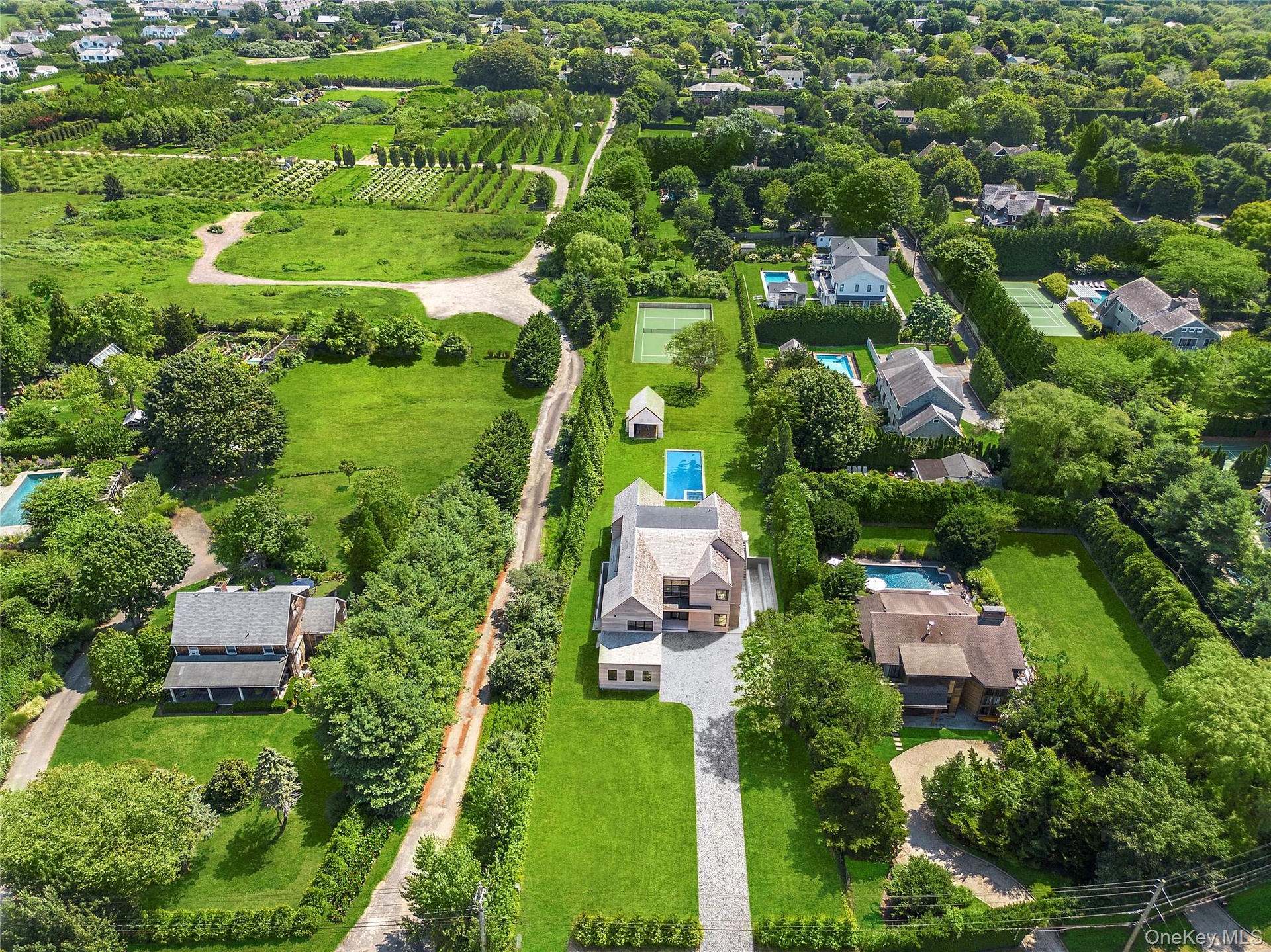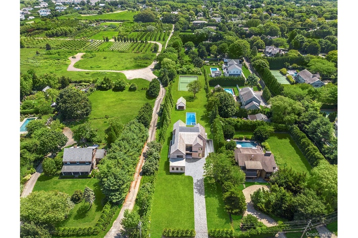 Tucked behind a curtain of privacy hedges and located south of the highway in Southampton Village, 50 Tuckahoe Lane is a stunning brand-new construction set on 1.2 lush acres, thoughtfully designed to offer luxury, comfort, and refined Hamptons living. Recently Completed and Move in Ready, this 7,307 square-foot residence has been meticulously curated for both functionality and style. The approach down the long gravel driveway welcomes you to an elegant two-story cedar-clad home with clean architectural lines and expansive glass windows that fill the interiors with natural light.