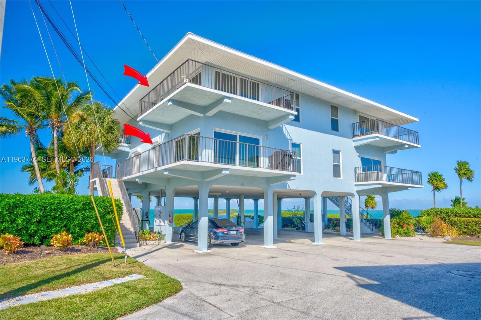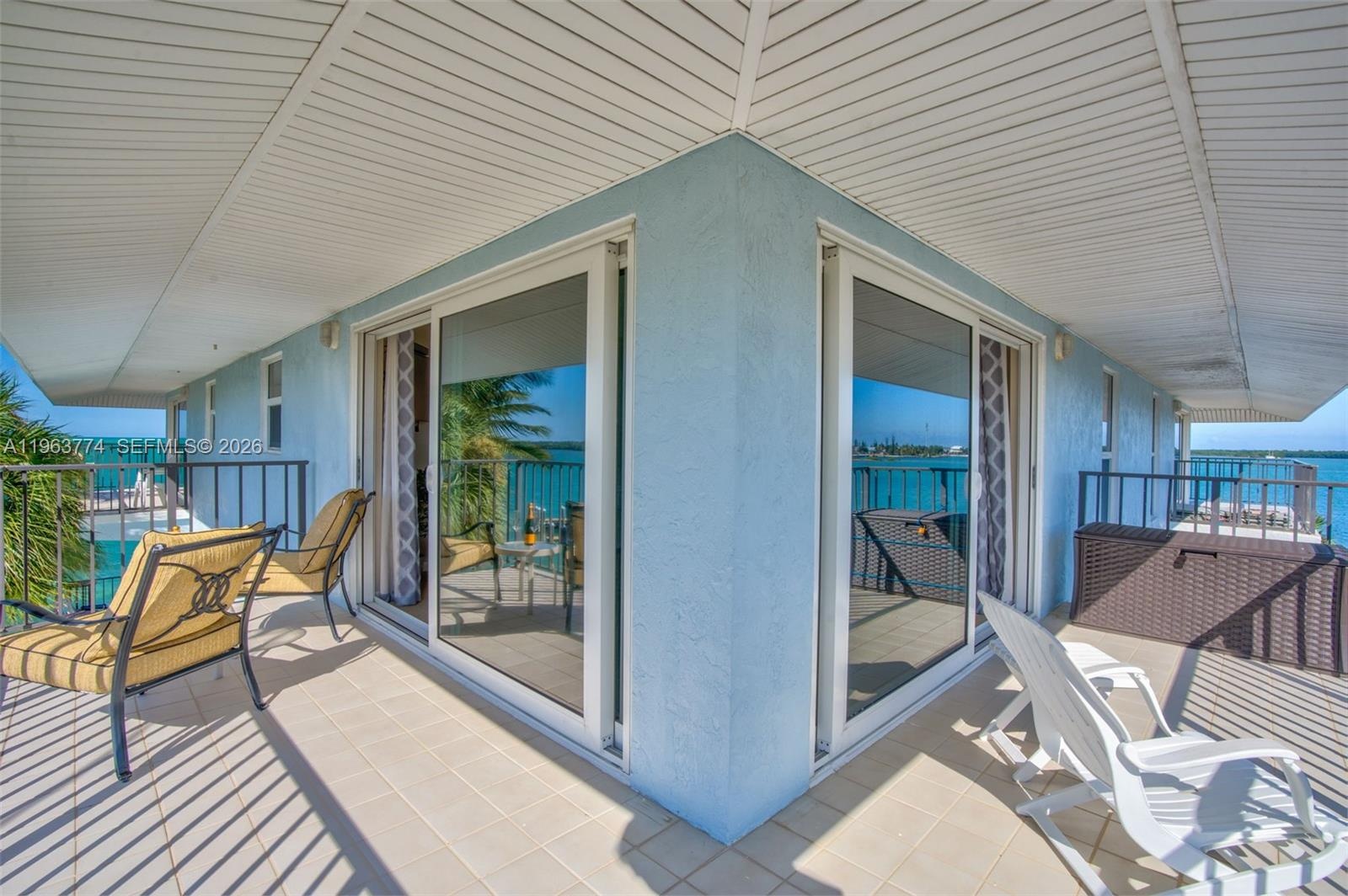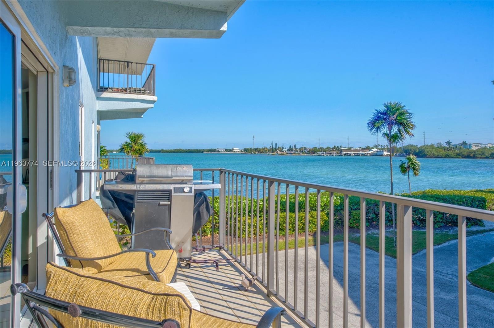Welcome to Gulfpointe II, a Gulf front community offering lots of amenities including great dockage, large heated and chilled pool and lots of parking. This spacious 2 Bedroom 2 Bath condo offers an open floor plan with panoramic views of the gulf from all angles. Enjoy morning coffee or evening cocktails watching the sunset over the water from one of your. two porches that face different angles so you can capture shade and breezes all day long while enjoying Gulf views. Inside, the open-concept living room is spacious and flooded with natural light, creating a bright and airy feel. The kitchen is functional, with ample counter space for cooking and meal prep and stainless steel appliances. A large island with peninsula seating provides extra seating, perfect for dining or entertaining. The primary bedroom is a private retreat with its own half wrap-around balcony, offering a serene spot to enjoy the views. The room is spacious, with an en suite bathroom featuring double sinks and a generous closet. The guest Bedroom is equally large and comfortable with room for queen and twin beds. Offered furnished and rental ready. Located in Marathon, this condo allows 7 days rentals and offers easy access to local beaches, restaurants, and outdoor activities. With a heated and AC cooled pool, first-come dock, 8 boat slips great for family fishing with dock lights, and community pool and Gulfside views this condo is the perfect place to enjoy the best of the Florida Keys.