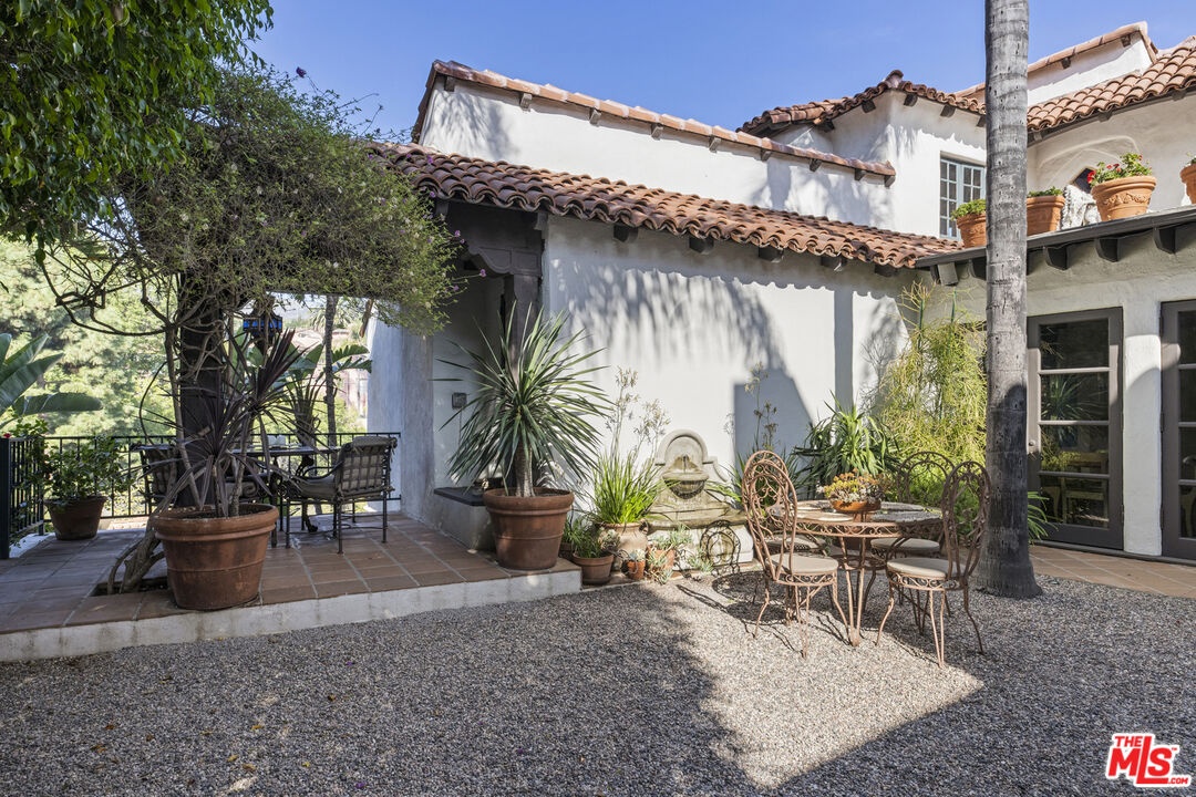 This gated circa 1926 Spanish Colonial Revival home with a rich historical pedigree, is one of Hollywoodland's earliest and most distinctive houses. Designed by architect Elmer Grey (known for the Beverly Hills hotel and the Huntington Art Gallery), the property rises from historic stone walls to a commanding Beachwood Canyon promontory with spellbinding views of major landmarks - Hollywood Sign, Griffith Observatory and L.A. skyline to the ocean, in a neighborhood synonymous with the golden age of cinema and magical architecture. Notable features of the 5 bedrooms, 4.5 bathrooms property include a formal entry with original terrazzo floor and a graceful, curved staircase; well-preserved Malibu tiles throughout, vintage light fixtures and windows, and multiple patios, with a layout that harmoniously balances formal old world elegance and comfortable contemporary living. The main level has a spacious family room opening to a peaceful romantic courtyard with a wood-burning fireplace and a separate dining alcove; a formal dining room; a large kitchen with high end appliances and custom cabinetry; 3 perfectly positioned bedrooms; 2 baths and a classic powder room. Upstairs features a grand scale living room with coved ceilings and a carved stone wood-burning fireplace, opening onto a sunny patio; an exquisite original chapel/library with a 1920s Della Robbia wall fountain, original stained-glass windows and walls of built-in bookcases. The well-appointed primary bedroom with ensuite luxurious bathroom opening to a private balcony, and a walk-in closet, completes this level. Discreetly tucked below, an ideal guest studio with views has a private street entrance, a kitchenette and a bath. The verdant and tranquil setting compliments the home's architecture and embodies the California lifestyle, offering optimum indoor/outdoor entertaining possibilities and expansive views from virtually every room. Glamorous and authentic architectural details have been thoughtfully preserved. This prized location on Belden Drive, near Beachwood Village market, cafes and shops, offers a calm oasis with utmost privacy.
