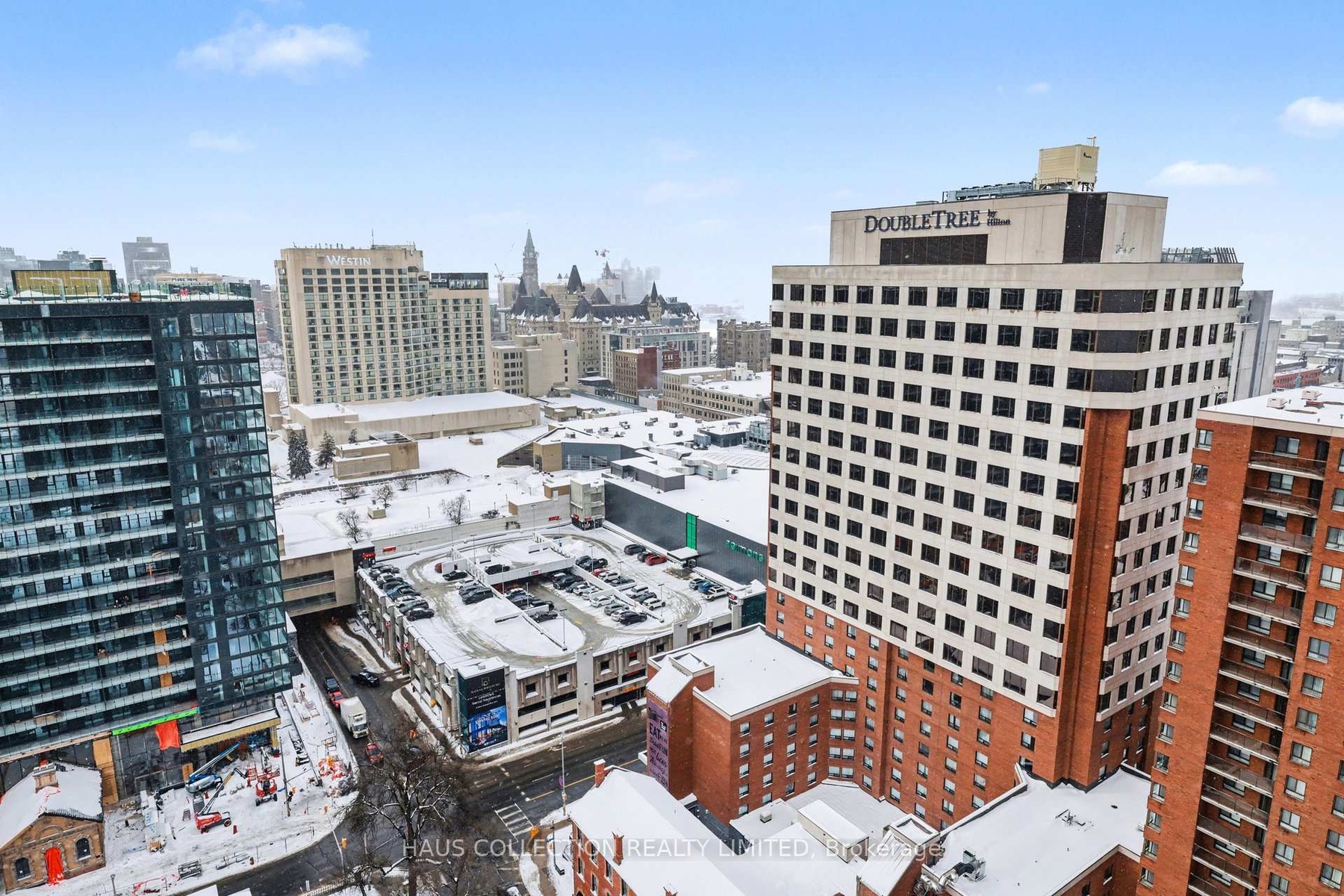 Located on the 22nd floor, just below the penthouse level, in the highly sought after ArtHaus building, this modern yet sophisticated and oversized 1 bed 1 bath suite offers convenient living in the heart of the nation's capital and just steps from the historic Byward Market. This high-floor suite features desirable western exposure, 9-foot ceilings, engineered birch hardwood and porcelain tile throughout, smooth finish ceilings with cement accents, custom kitchen with quartz countertops, a covered balcony, and floor-to-ceiling windows with stunning panoramic city views, including Parliament Hill. Its open layout is perfect for customizing your space. The building features a private lobby, exercise room, party room, rooftop terrace with outdoor fireplace & BBQ's, art gallery cafe, and the Le Germain Hotel and Restaurant. Art Haus is a true masterclass in architecture, design and livability that is a unique offering in the Ottawa market. Don't miss your opportunity to live in this extraordinary apartment in a timeless building. Parking can be made available at an extra cost, and the unit can also be offered furnished if needed.