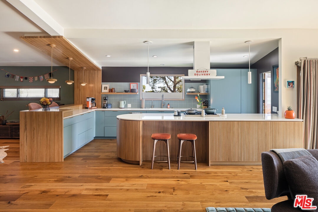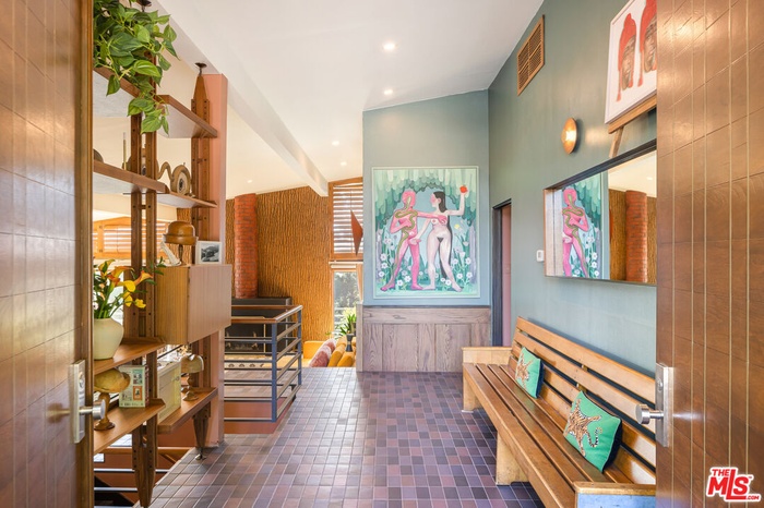 Ocean, Century City & Downtown: Mid-Century Modern Retreat with Iconic Views & Inspired Design, featuring panoramic skyline vistas and a direct sightline to the legendary Hollywood Sign from your balconies and upon arrival at both the front and back of the home. Surrounded by historically significant and architecturally notable Hollywood Hills homes, the setting carries a sense of legacy and understated sophistication unique to this storied enclave. Designed with intention and owned by Hollywood creatives, the home balances artistic expression with livable luxury. Warm walnut floors, artisan wall coverings, and a striking, one-of-a-kind fireplace wrapped in a real tree trunk anchor the main living space. Walls of glass frame sweeping treetop, hillside, and neighborhood views, filling the home with natural light and showcasing the character of the surrounding architecture. Two balconies one off the kitchen and one off the guest suite offer tranquil vantage points for morning coffee or evening unwind, with layered views stretching from historic hillside homes to distant city skylines spanning Downtown Los Angeles and Century City. The chef's kitchen is a sculptural showpiece featuring soft blue cabinetry, fluted wood paneling, a wraparound breakfast bar, and designer Roll & Hill pendant lighting. High-end Thermador appliances, upgraded plumbing, and added insulation enhance everyday function. Nearly all windows and sliding doors have been replaced with high-efficiency Renewal by Andersen upgrades, maximizing comfort, energy efficiency, and panoramic views. Downstairs, a versatile bonus room provides flexibility as a media lounge, home gym, or creative studio, complemented by a stylish laundry area and thoughtful design details. Outdoors, the multi-level yard offers a private hillside retreat with mature avocado and citrus trees, lush landscaping, and multiple areas for outdoor enjoyment serene, intimate, and distinctly Hollywood Hills. Additional highlights include owned solar panels, an EV charger, a full seismic retrofit completed in 2019 by McGrath, a Post alarm system, California Closets throughout, and a one-car carport. A rare blend of character, calm, and creativity, this timeless architectural sanctuary captures the essence of refined Hollywood Hills living.