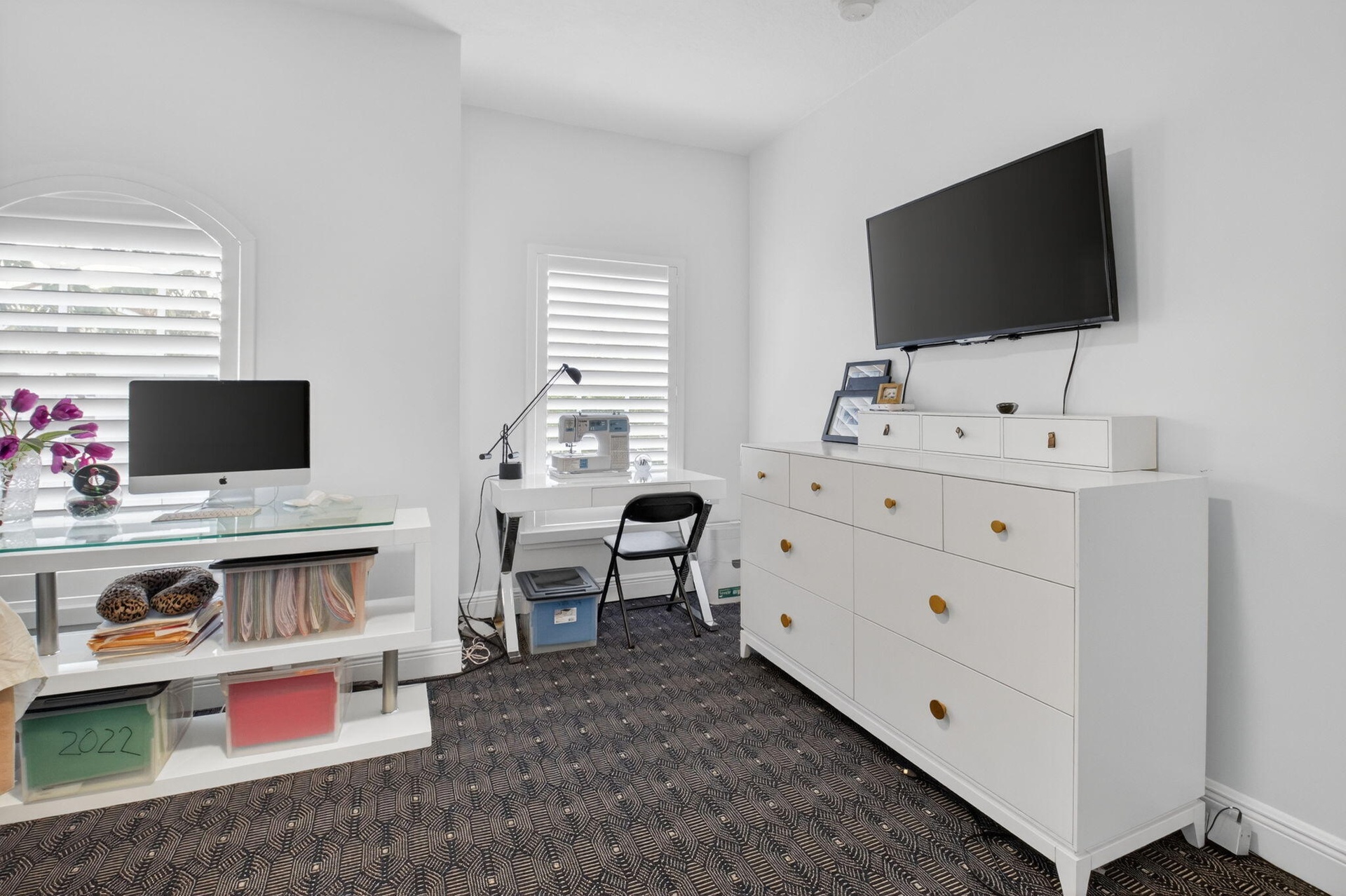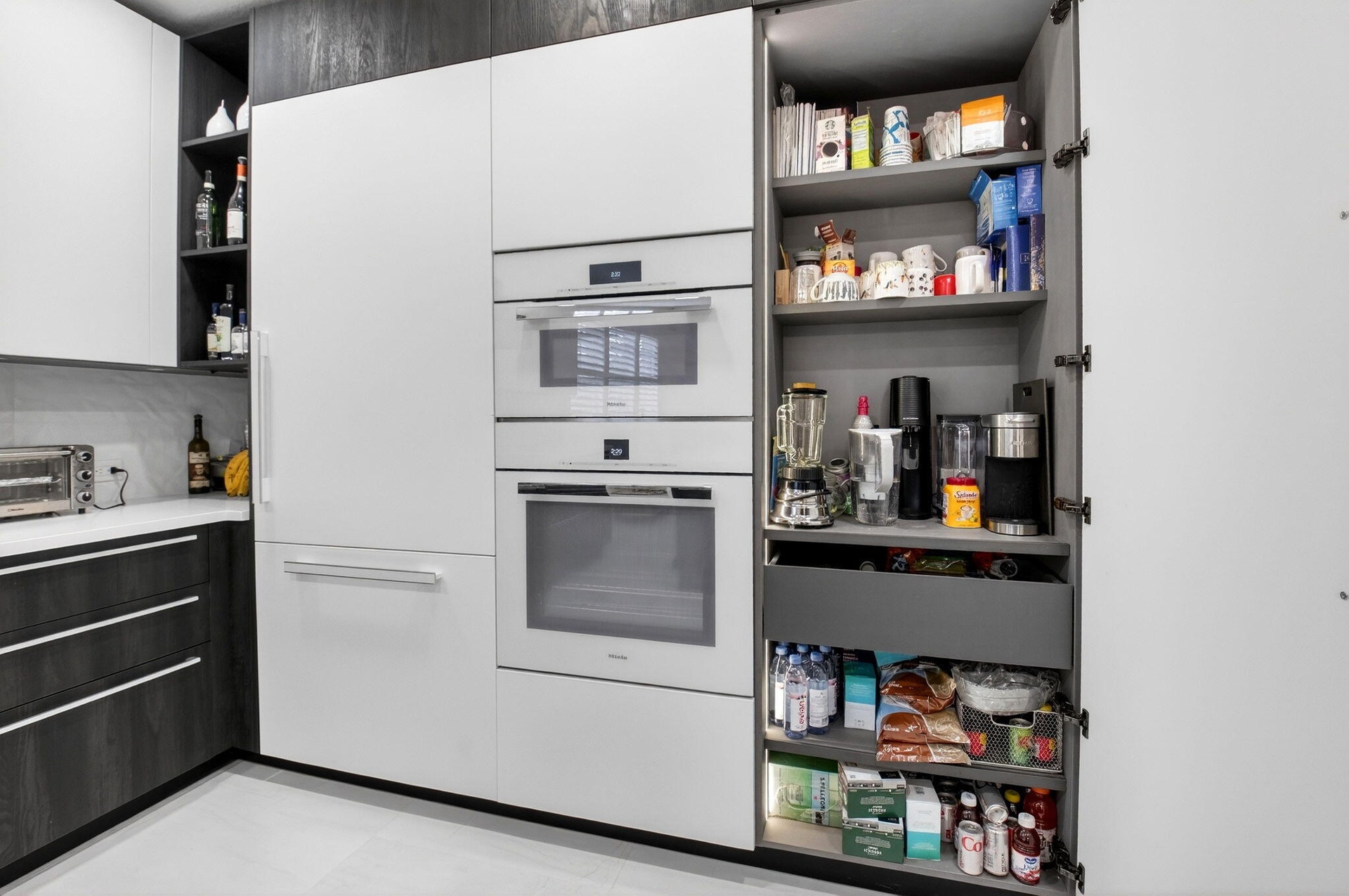 The kitchen is the true heart of the home. A gourmet chef's dream designed to impress and perform. An oversized stone island anchors the space, complemented by sleek European contemporary cabinetry and top-of-the-line Miele appliances, including a speed oven/microwave. A gas range by Fulgor Milano elevates the culinary experience, while a dedicated coffee station invites you to slow down and savor life's daily rituals. Elegant plantation shutters frame the windows, allowing soft natural light to flow through the home. Downstairs, a custom-built office with tailored built-ins creates the perfect environment for working from home, peaceful, practical, and inspiring.