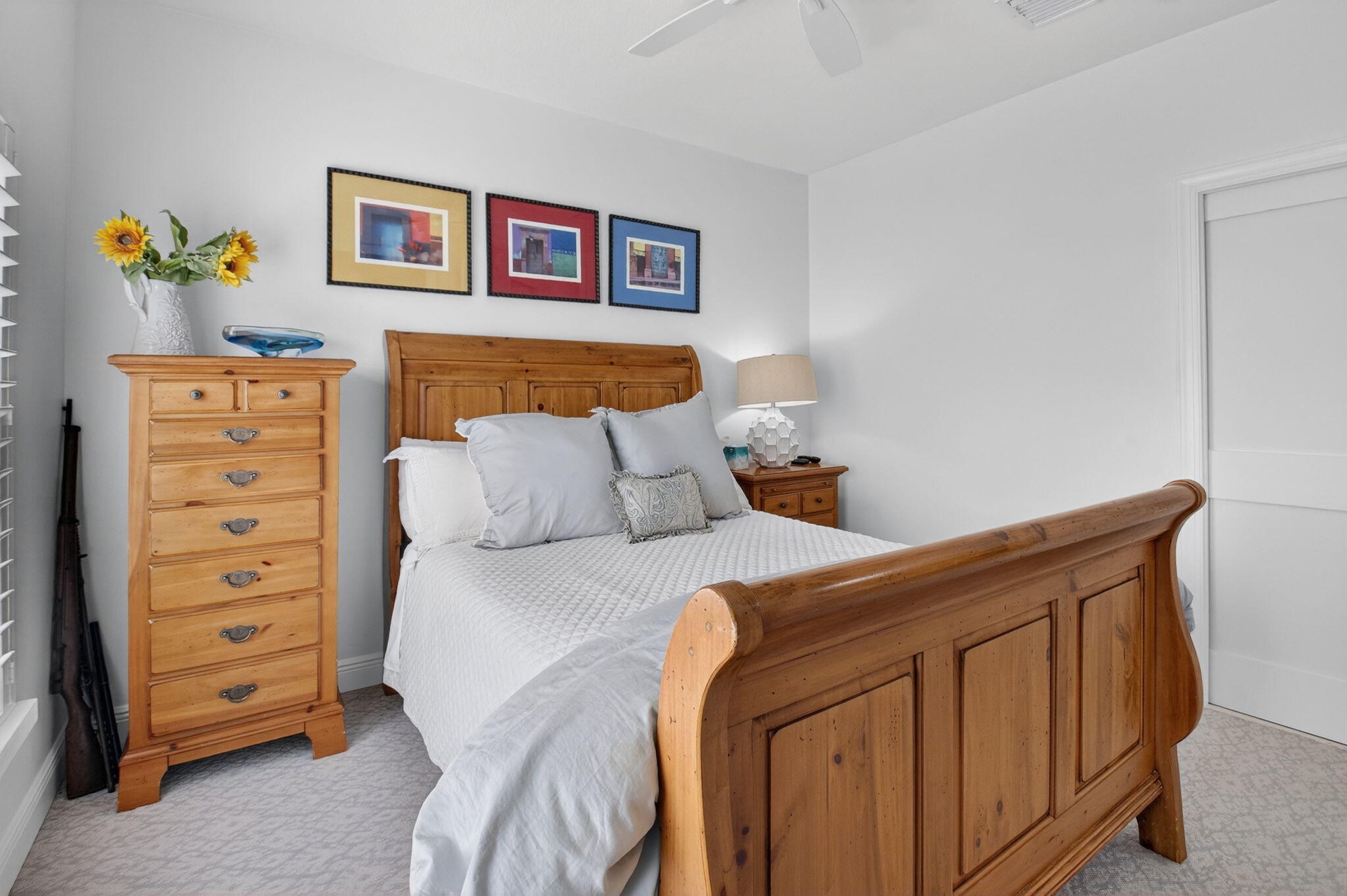 Throughout the home, large rectified porcelain tile flooring offers a clean, modern aesthetic, complemented by plush bedroom floors and a striking staircase featuring a sleek metal handrail for a streamlined, contemporary look. All closets are fully fitted to maximize storage, and the finished garage with epoxy flooring adds both practicality and polish.
