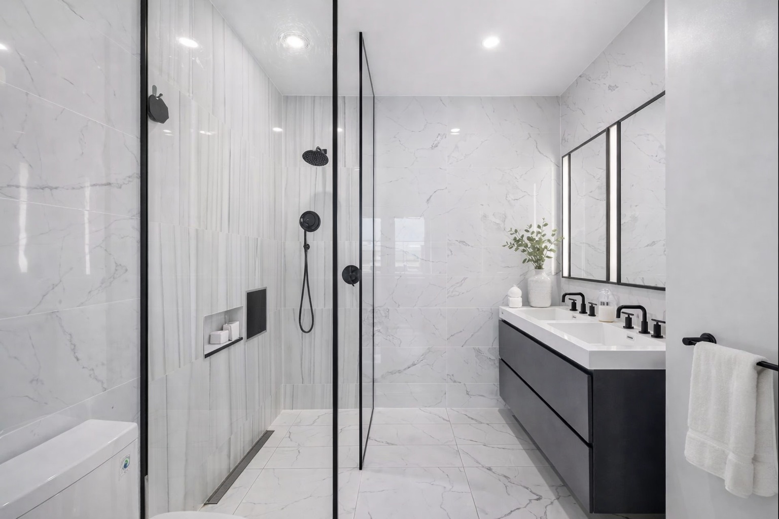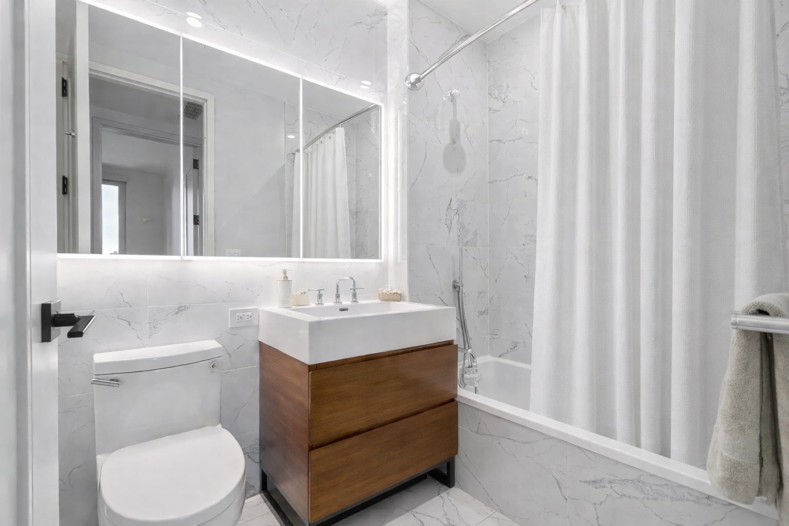 The chef’s kitchen is thoughtfully designed with custom oak cabinetry, integrated LED lighting, natural stone countertops and backsplash, and a fully integrated Miele appliance suite. Bathrooms evoke a spa-like ambiance with radiant heated floors, sleek porcelain finishes, custom vanities, and illuminated medicine cabinets. A Latch smart entry system enhances both security and ease.