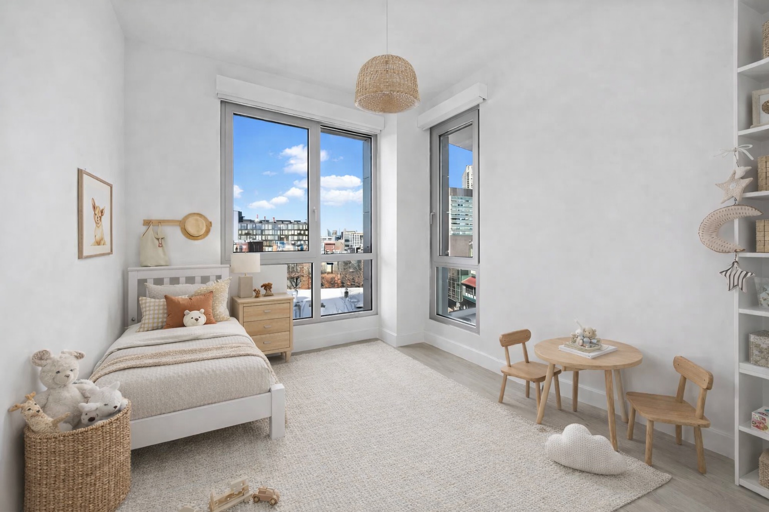 This exceptional corner residence spans approximately 818 square feet indoors plus 166 square feet of private outdoor space, delivering both light and openness with 10-foot ceilings and dramatic floor-to-ceiling insulated windows. Wide-plank white oak floors add warmth throughout, while multi-zone climate control and an in-unit Miele washer/dryer ensure everyday convenience.