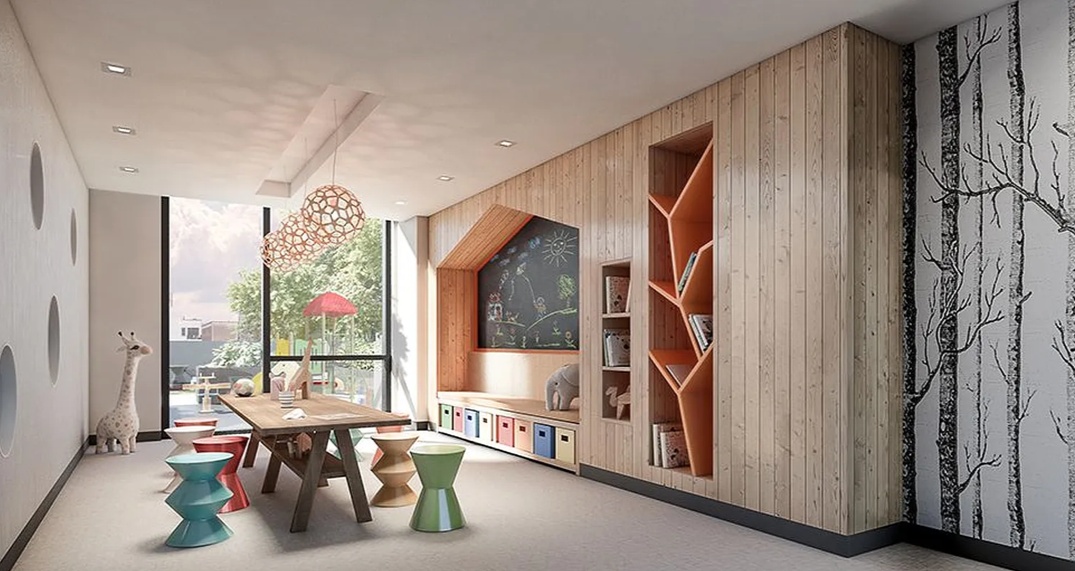 Residents enjoy a full-service lifestyle with a 24-hour attended lobby, live-in superintendent, fitness center, children’s playroom, residents’ lounge, landscaped terrace with water feature, and bicycle storage.