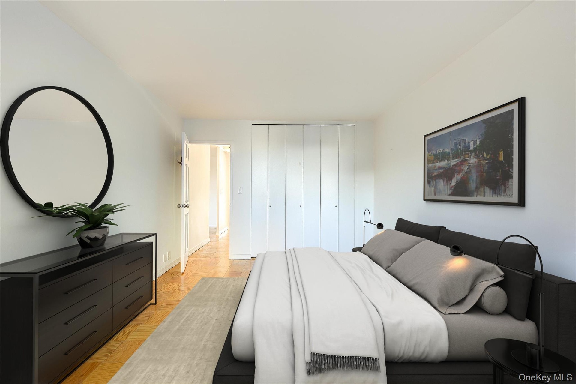 Both bedrooms are generously sized and well-proportioned. The primary suite features 2 large closets and a windowed en-suite bathroom with a stall shower. The second bedroom includes 3 large closets, both bedrooms can easily fit a King size bed. The second bathroom has a soaking tub. The floors are wood parquet throughout the entire apartment.