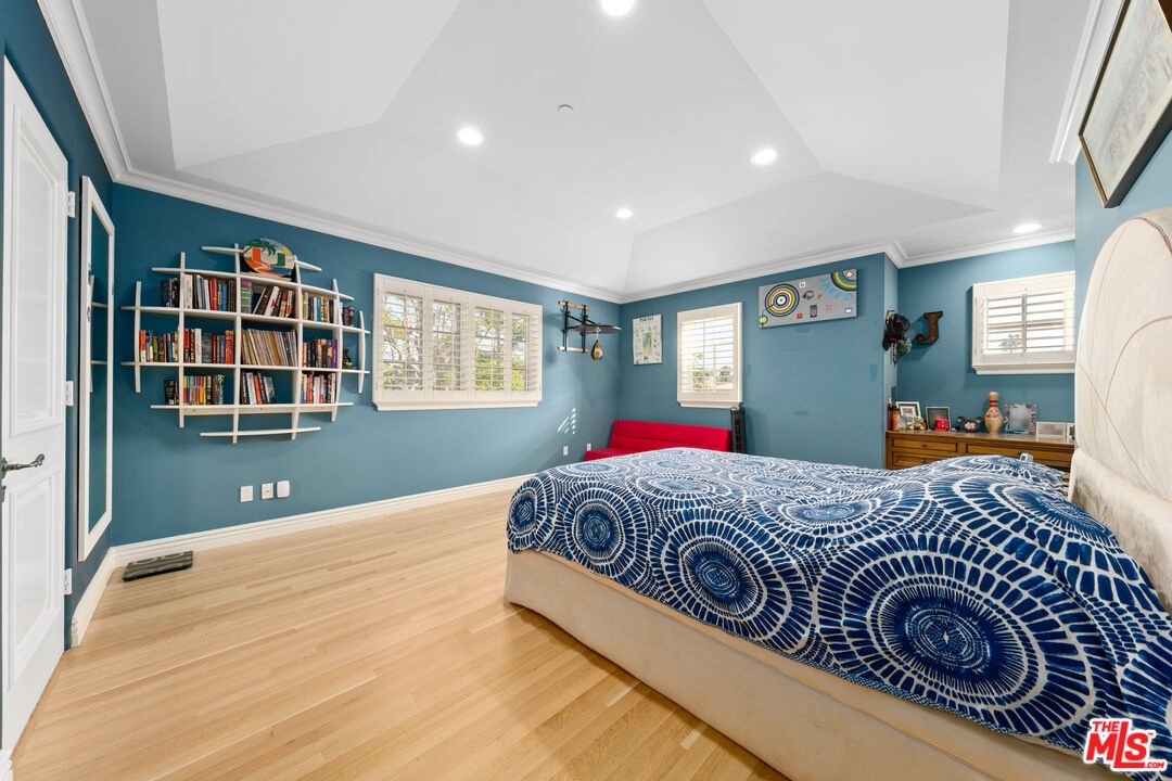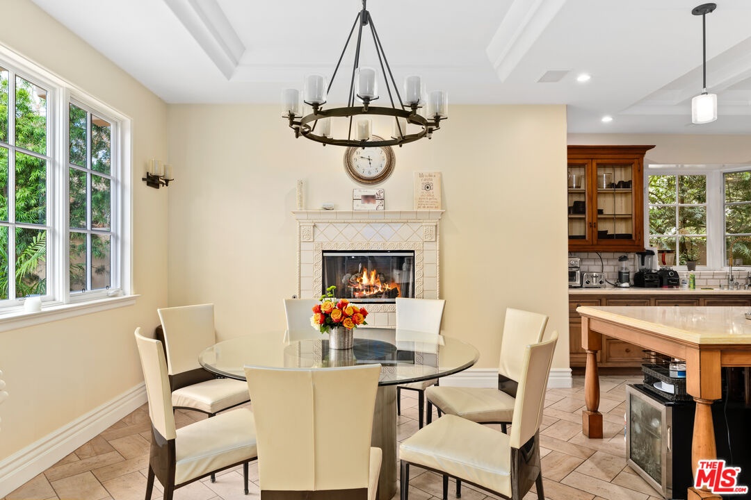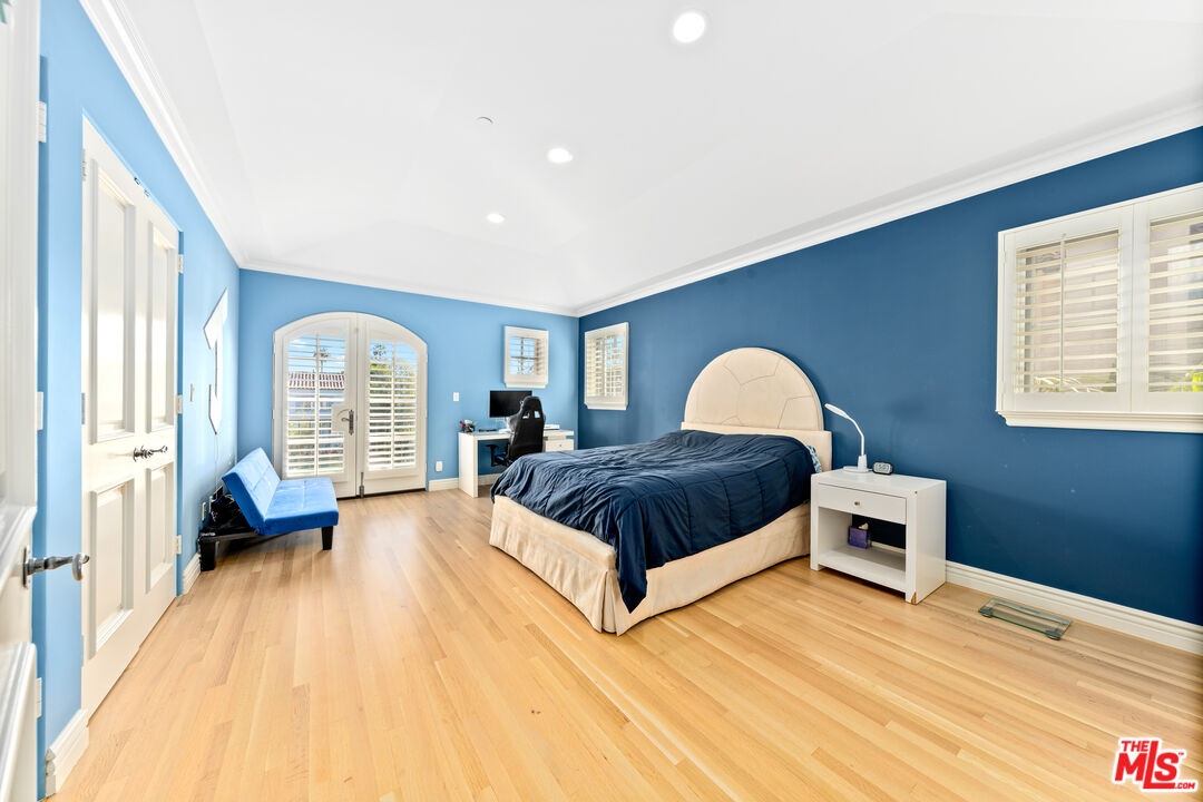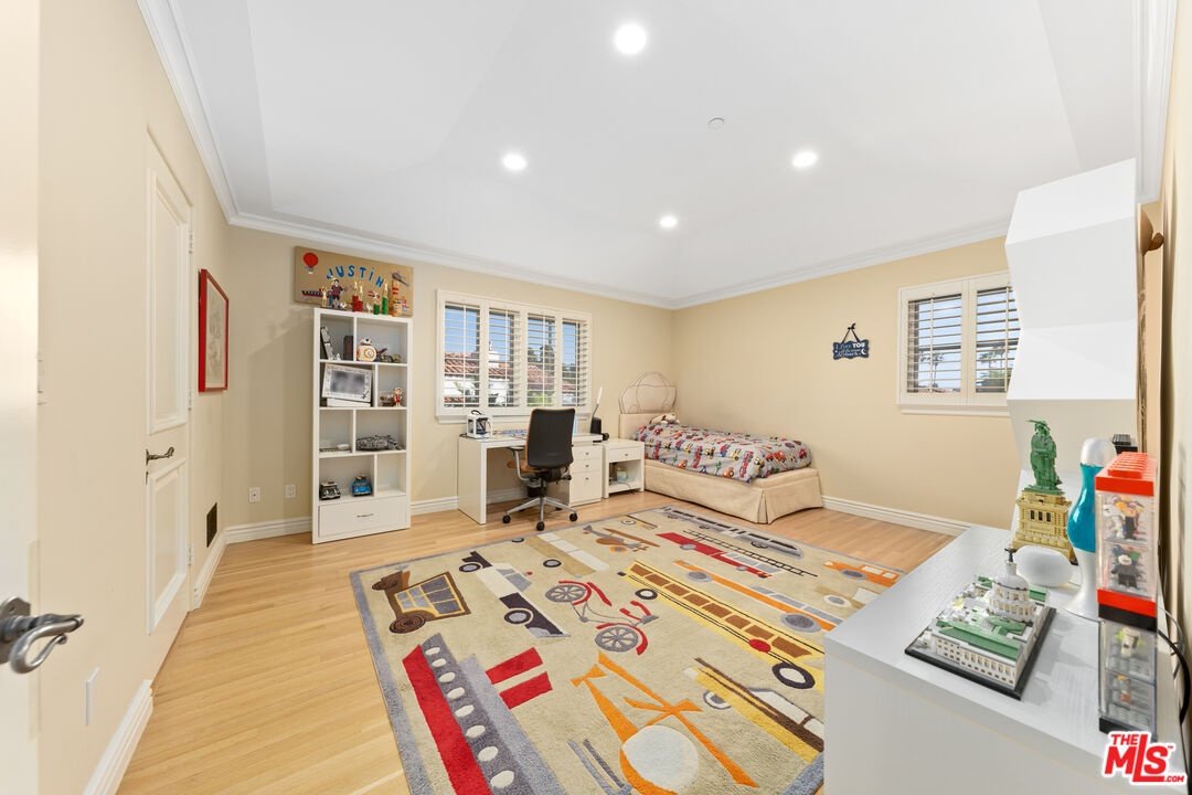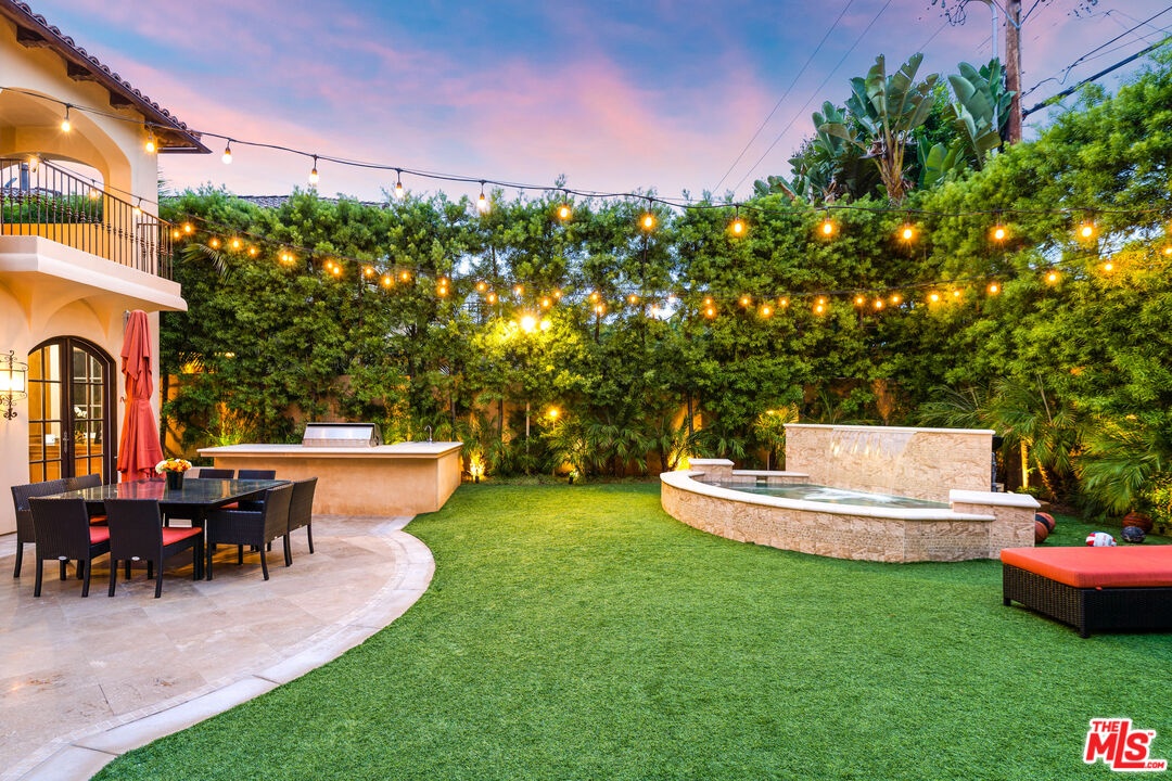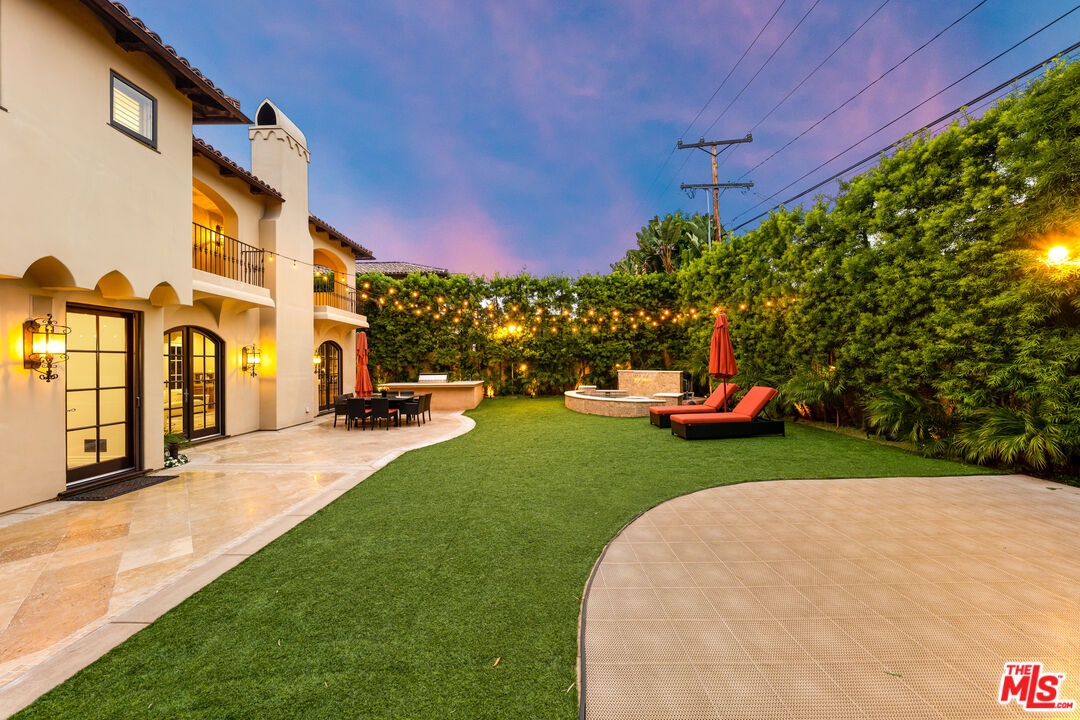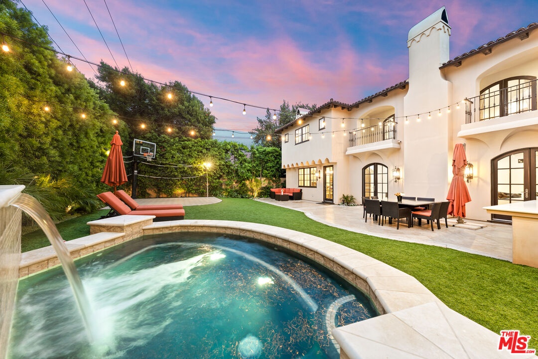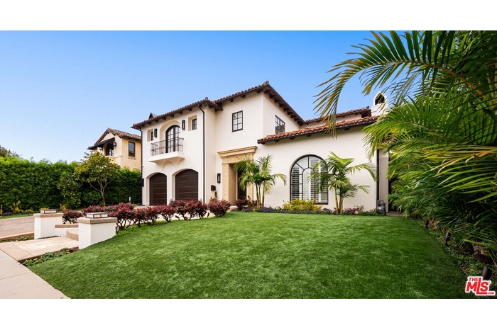 Located in prime North of Montana, this beautifully refreshed Mediterranean villa offers 5 bedrooms, 6 bathrooms, and approximately 5,276 square feet thoughtfully designed for both everyday living and entertaining. A dramatic two-story atrium entry welcomes you into expansive living spaces, including a chef's kitchen with stainless steel appliances, oversized island, fireplace, and sunlit breakfast area overlooking the landscaped yard. Multiple gathering areas open seamlessly to the backyard through French doors, and the main level also features a guest suite, formal dining room, elegant living room with soaring ceilings and fireplace, and a private office with custom built-ins. Upstairs, three en-suite bedrooms accompany a spacious primary retreat complete with a generous walk-in closet, dual French doors leading to a private balcony, and a spa-inspired bath with soaking tub, dual vanities, and large shower. The backyard is an entertainer's dream with a resort-style spa and waterfall, outdoor kitchen with BBQ, grassy lawn, basketball court, and inviting seating areas strung with caf lights. A converted two-car garage functions as a fully equipped gym with air conditioning and premium equipment. Located in the coveted Franklin School District and just moments from Montana Avenue, the Brentwood Country Mart, and the beach, this home offers exceptional Westside living in one of Santa Monica's most sought-after neighborhoods.