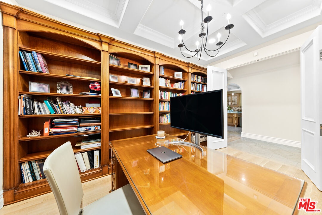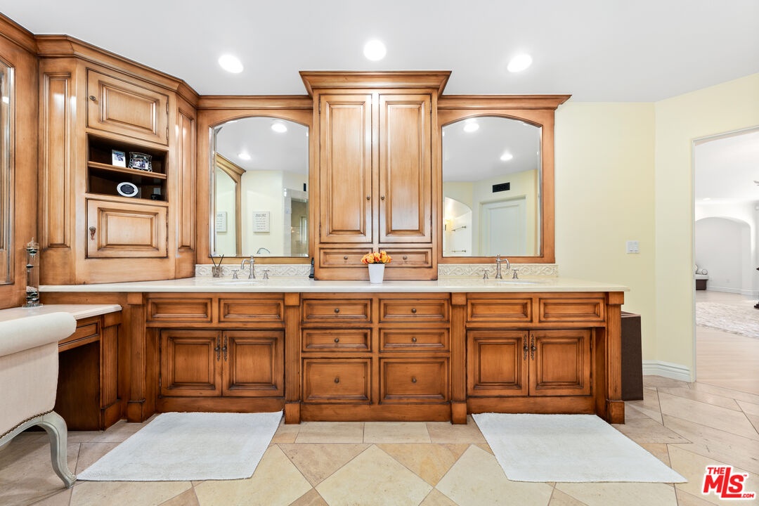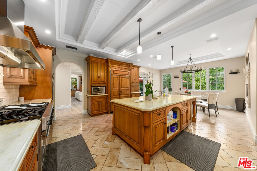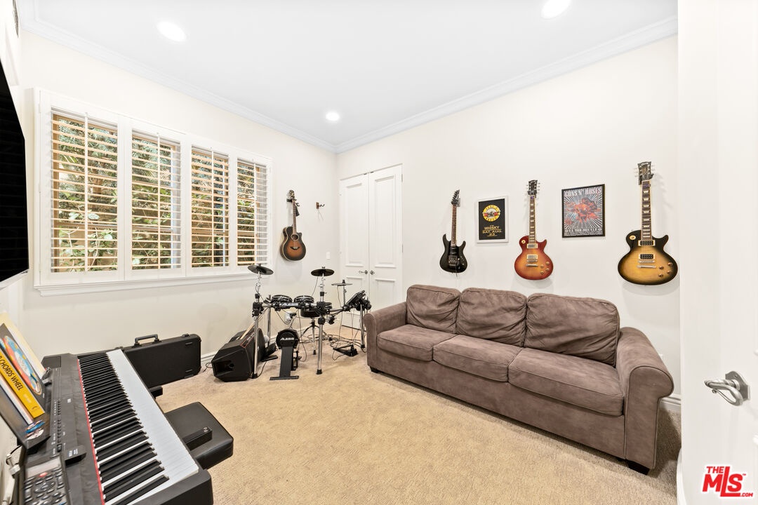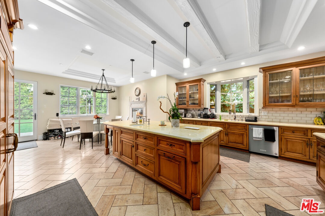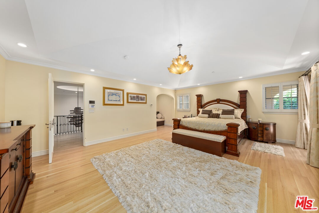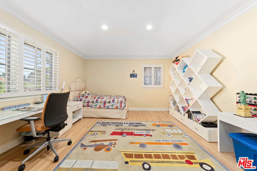 Located in prime North of Montana, this beautifully refreshed Mediterranean villa offers 5 bedrooms, 6 bathrooms, and approximately 5,276 square feet thoughtfully designed for both everyday living and entertaining. A dramatic two-story atrium entry welcomes you into expansive living spaces, including a chef's kitchen with stainless steel appliances, oversized island, fireplace, and sunlit breakfast area overlooking the landscaped yard. Multiple gathering areas open seamlessly to the backyard through French doors, and the main level also features a guest suite, formal dining room, elegant living room with soaring ceilings and fireplace, and a private office with custom built-ins. Upstairs, three en-suite bedrooms accompany a spacious primary retreat complete with a generous walk-in closet, dual French doors leading to a private balcony, and a spa-inspired bath with soaking tub, dual vanities, and large shower. The backyard is an entertainer's dream with a resort-style spa and waterfall, outdoor kitchen with BBQ, grassy lawn, basketball court, and inviting seating areas strung with caf lights. A converted two-car garage functions as a fully equipped gym with air conditioning and premium equipment. Located in the coveted Franklin School District and just moments from Montana Avenue, the Brentwood Country Mart, and the beach, this home offers exceptional Westside living in one of Santa Monica's most sought-after neighborhoods.