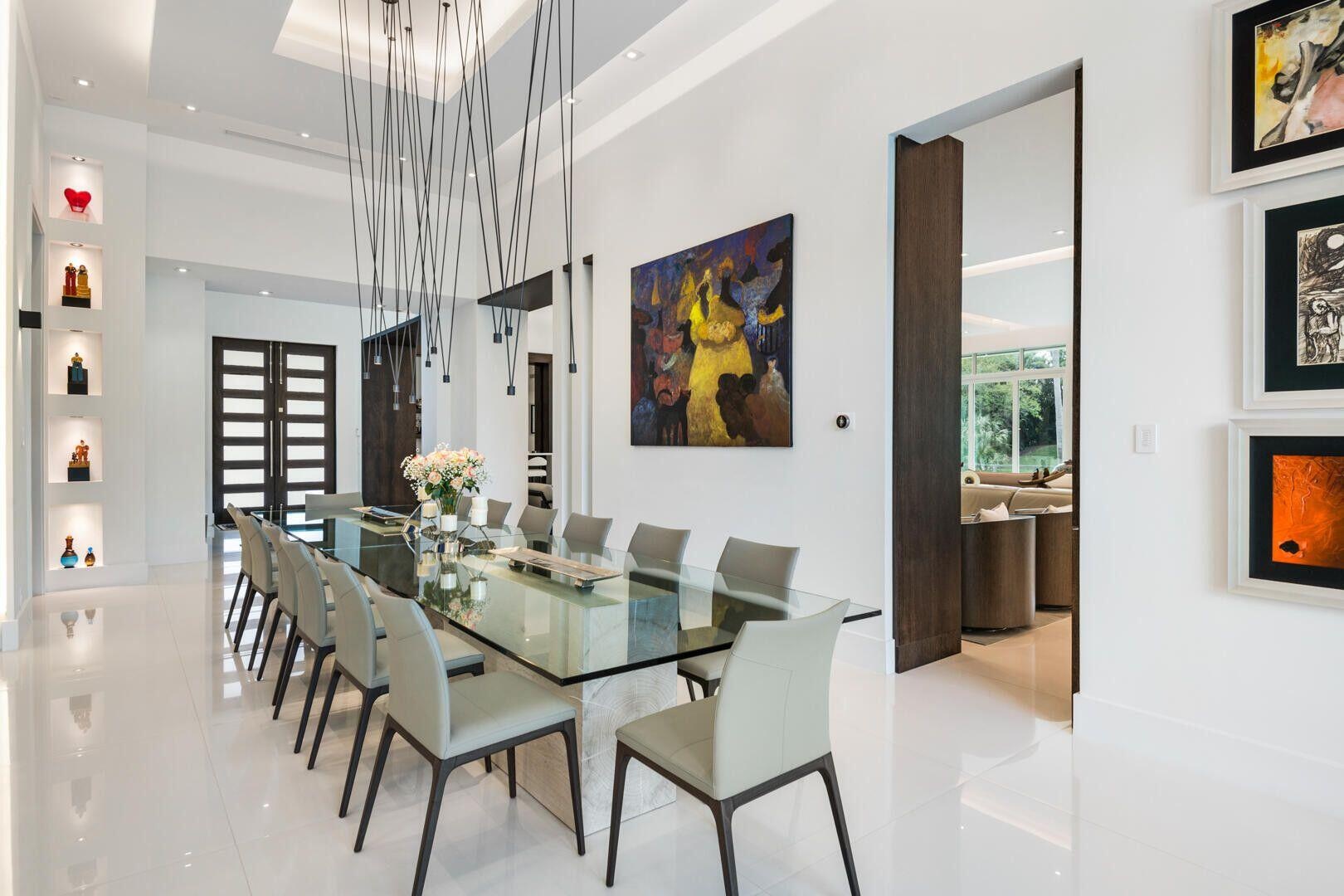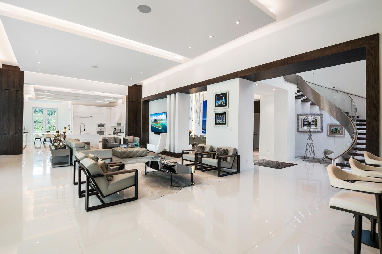 Rare opportunity in the prestigious, gated community of Le Rivage in Boca Raton. Set at the end of a private cul-de-sac, this 7-bedroom modern estate offers over 7,800 sq ft of living space on an oversized lakefront lot of more than half an acre, with water views wrapping around two sides of the home. The main level features an open-concept layout with soaring LED backlit ceilings, a chef's kitchen with Thermador and Miele appliances, custom cabinetry, quartz countertops, large island, and breakfast area. The great room's floor-to-ceiling pocket sliding doors showcase stunning lake and pool views, while a walk-in wet bar with wine refrigerator and formal dining room create an ideal entertaining setting. Also on the main level is a guest bedroom and an impressive primary suite with sitting area, dual spa-style baths, two custom walk-in closets, and a private office/TV room. Upstairs offers three en-suite bedrooms, a spacious loft with built-ins, and balcony access. A covered walkway leads to a 2-bedroom, 2-bath guest house above the garage. The air-conditioned, lift-ready 3-car garage is accessed separately via a covered walkway. Outdoor living features a resort-style pool with sun shelf and spa, expansive patio, full summer kitchen, and lush tropical landscaping overlooking the lake. Additional highlights include a whole-house generator, water filtration system, Crestron smart-home automation, and dedicated AV/mechanical room.