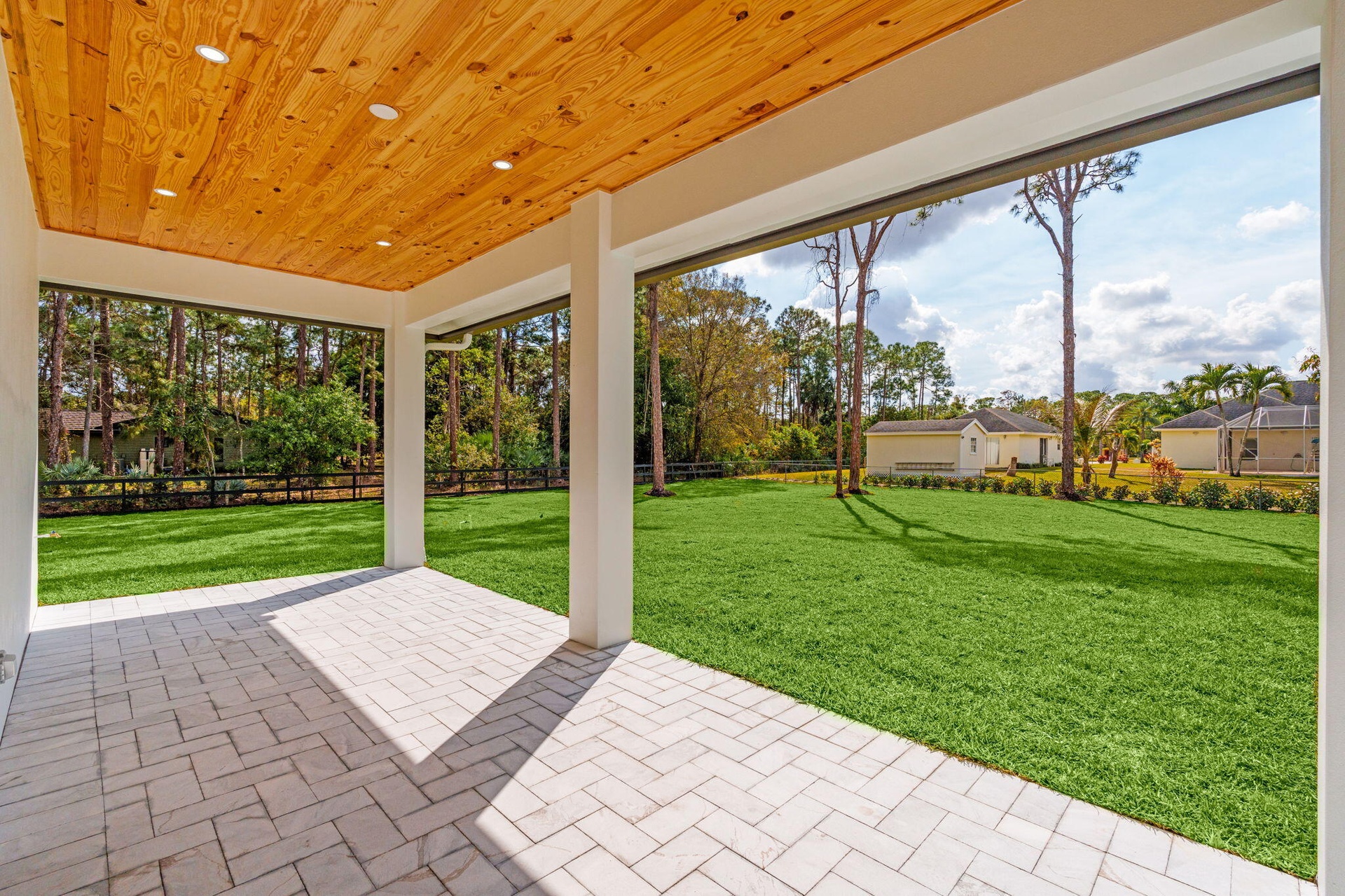 Step outside to your private resort-style backyard, complete with a tongue-and-groove ceiling detail, fully equipped summer kitchen, brand-new sod, and full irrigation. The property is fully fenced along the perimeter with dual driveways and elegant concrete columns, creating a grand yet private entrance.