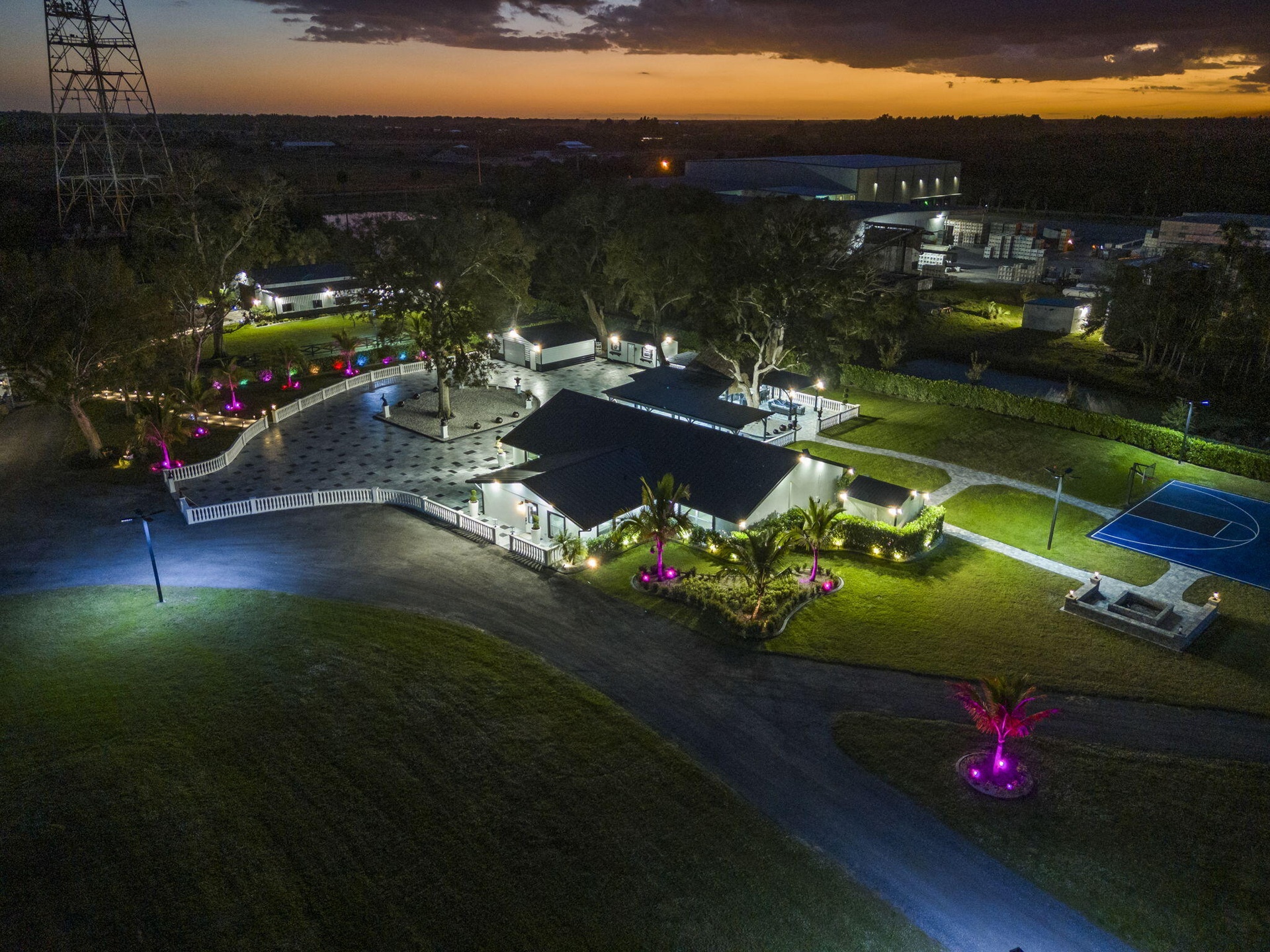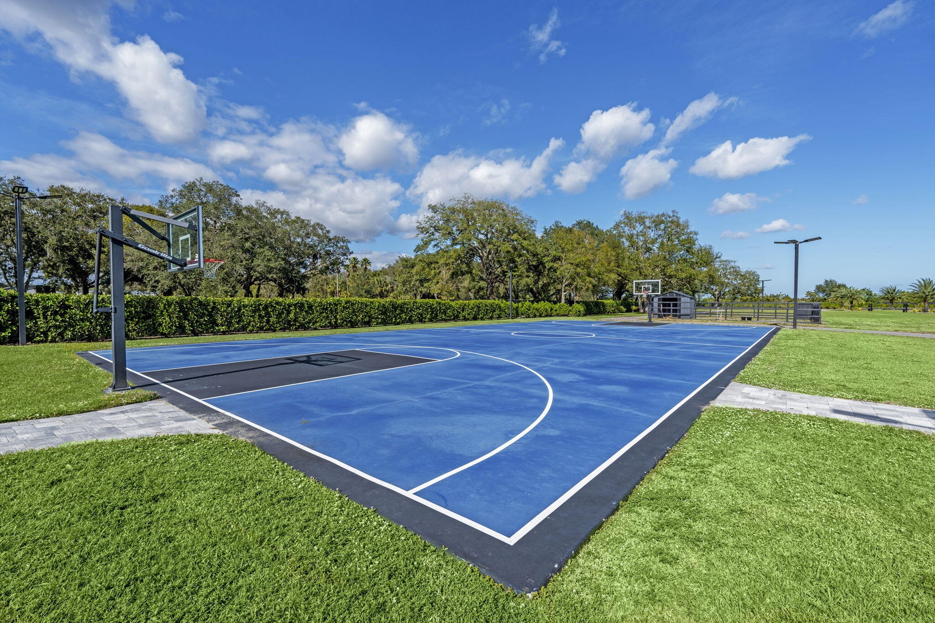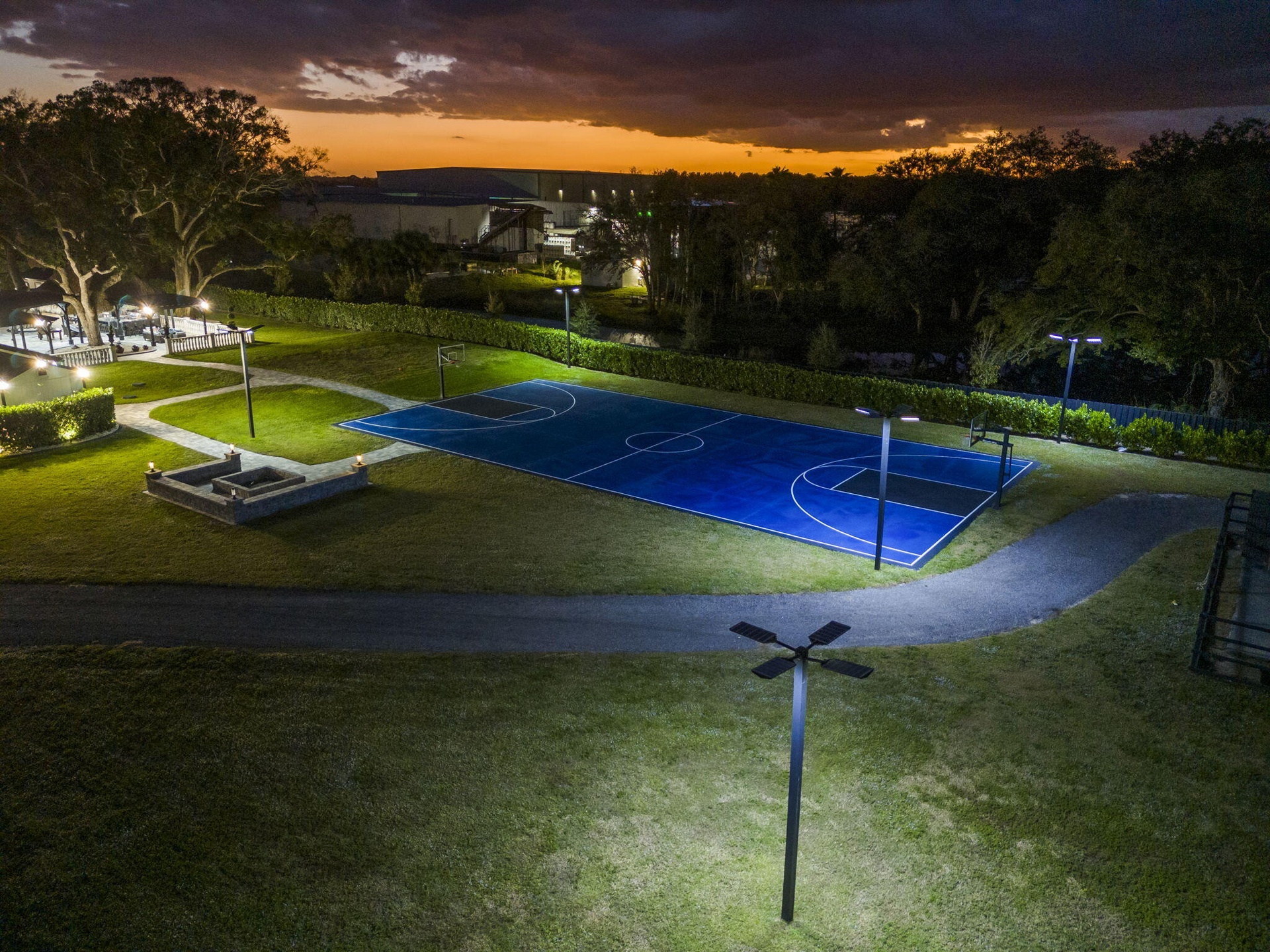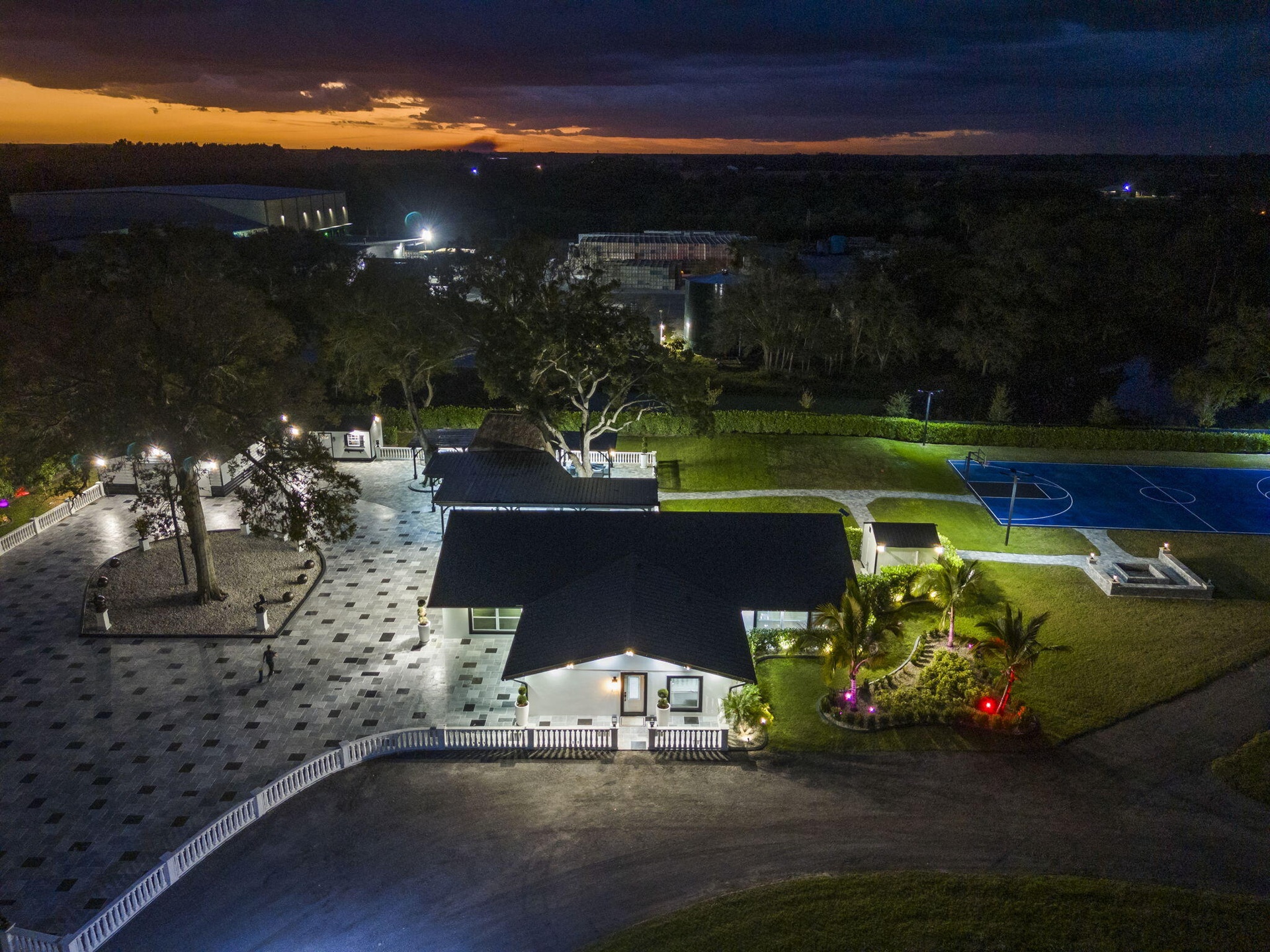 Interiors feature large-format tile and quartz surfaces, while impact-rated windows and doors provide security and efficiency. Outdoor entertaining reaches new heights with a chef's kitchen under pergolas, dedicated exterior bath facilities, and a full basketball court.