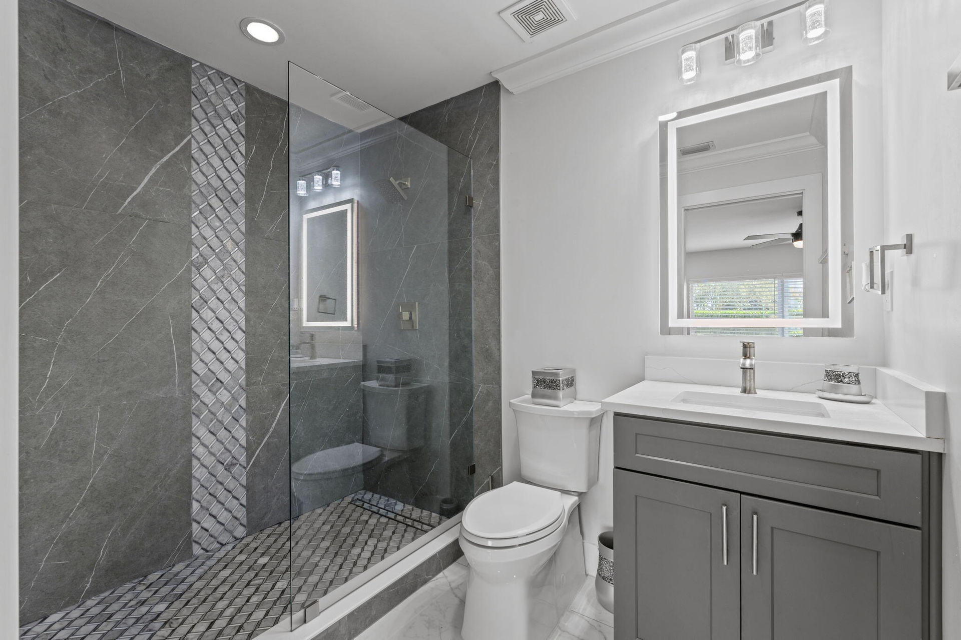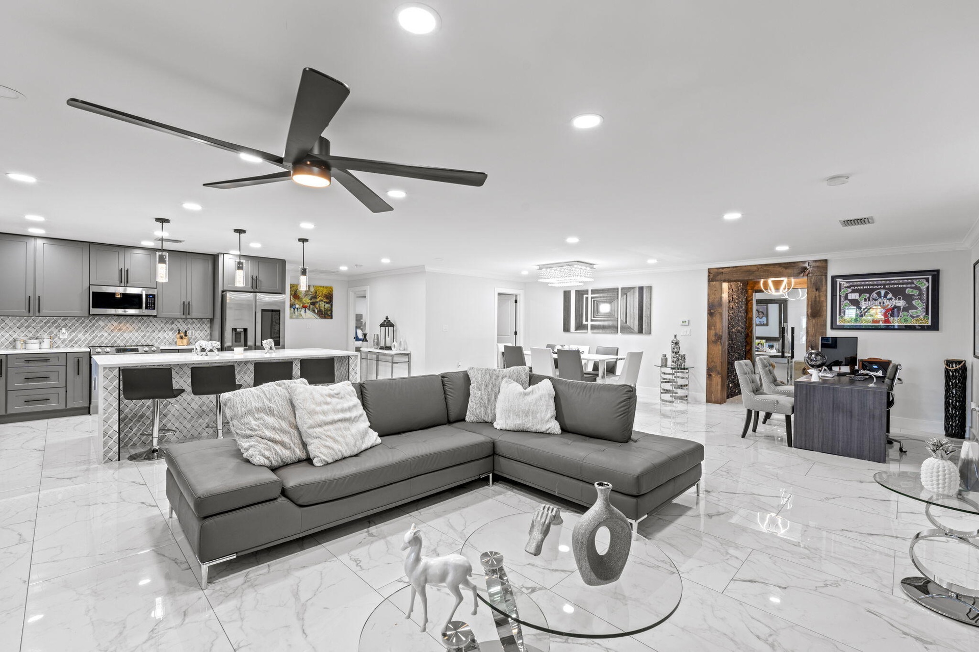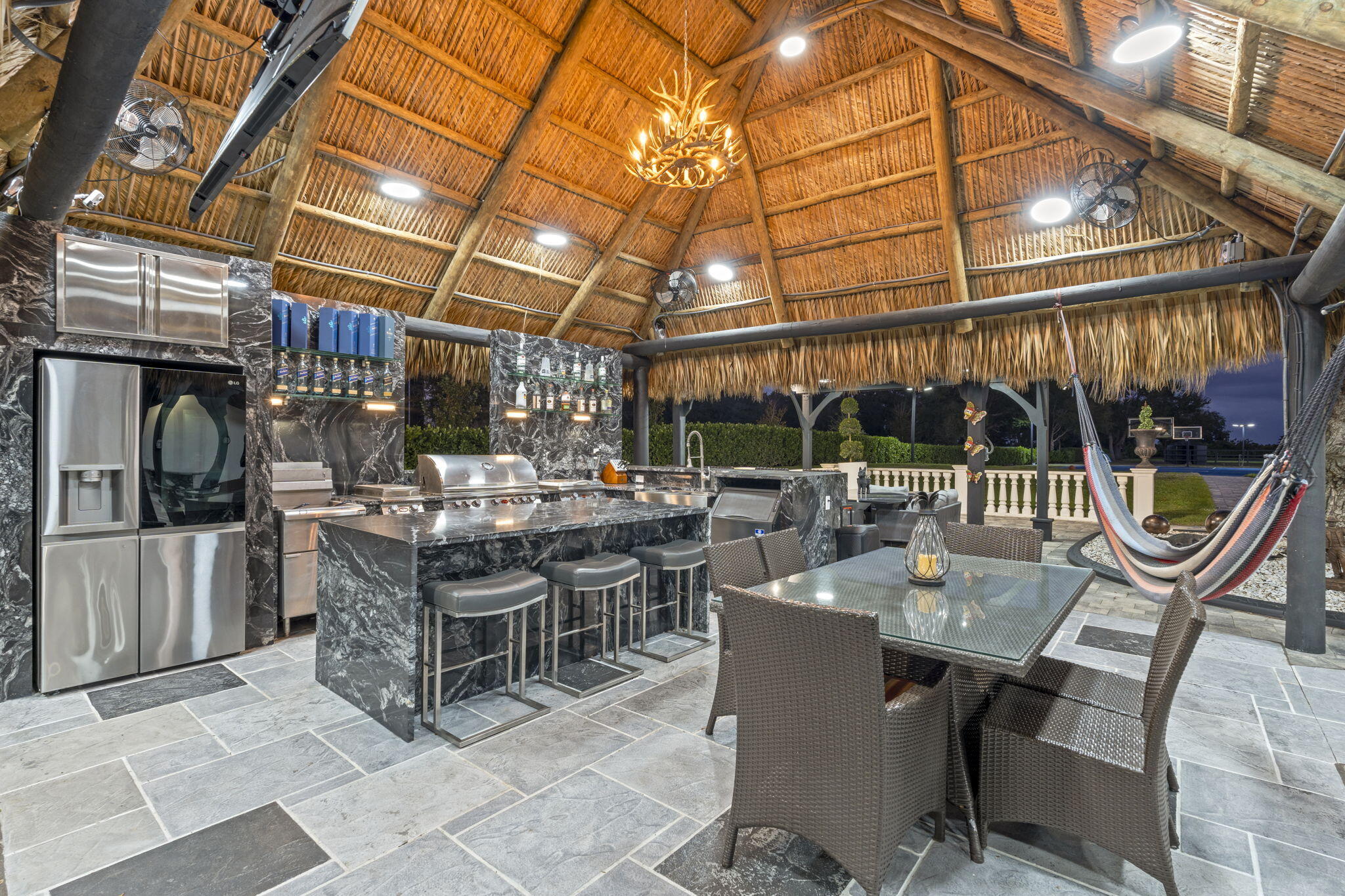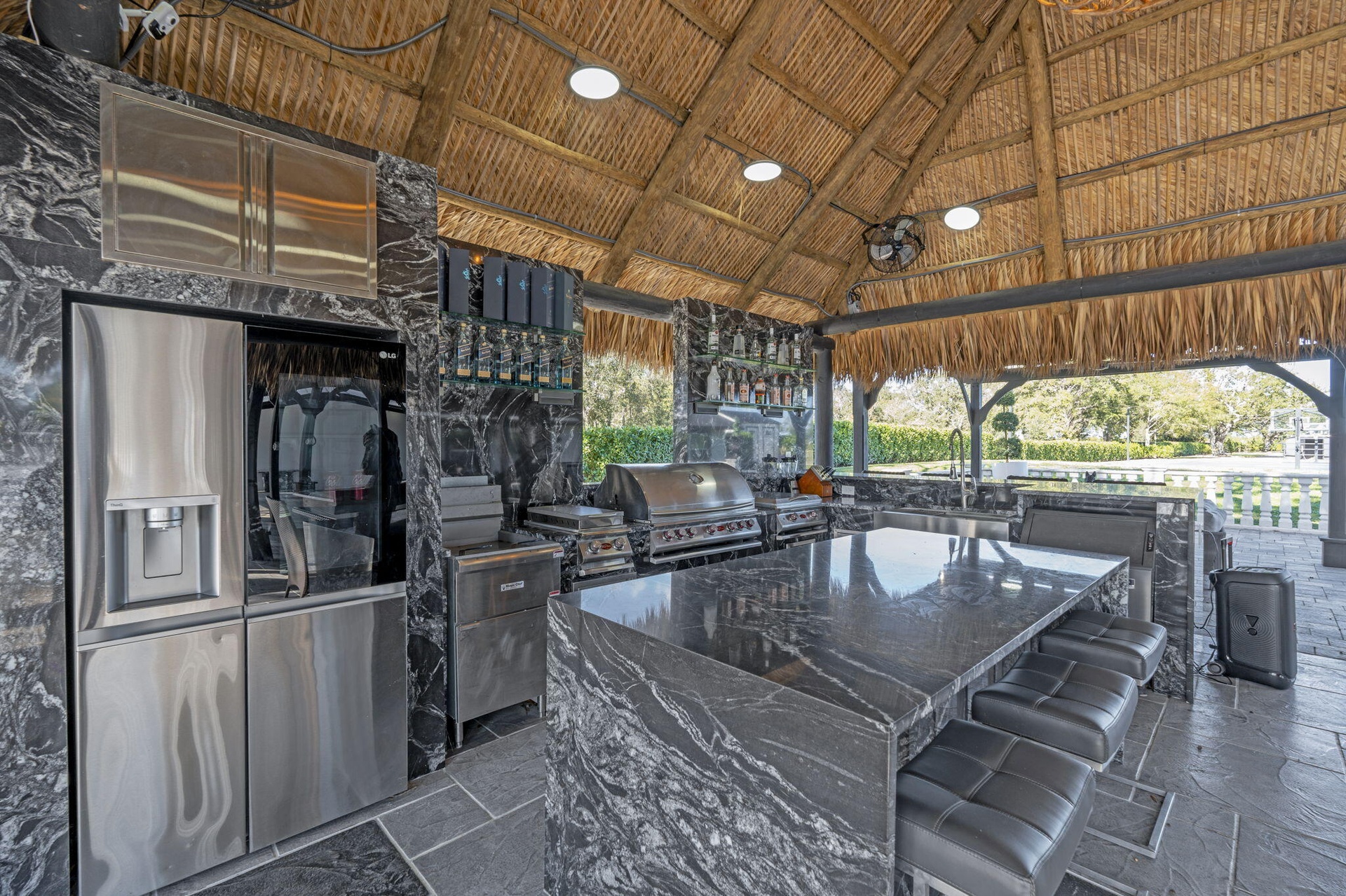 Interiors feature large-format tile and quartz surfaces, while impact-rated windows and doors provide security and efficiency. Outdoor entertaining reaches new heights with a chef's kitchen under pergolas, dedicated exterior bath facilities, and a full basketball court.