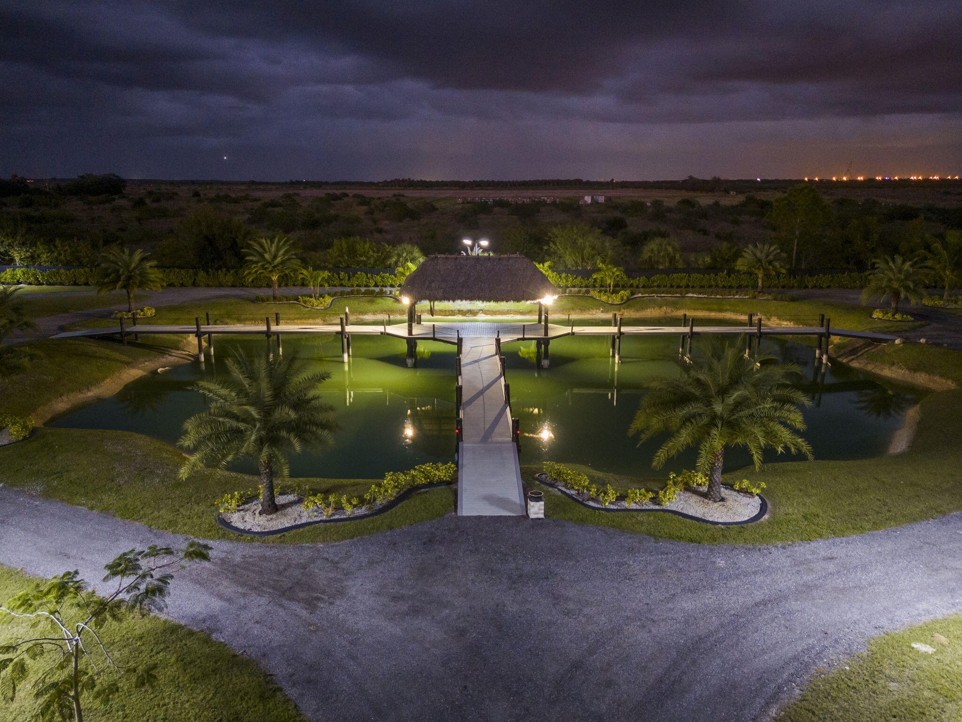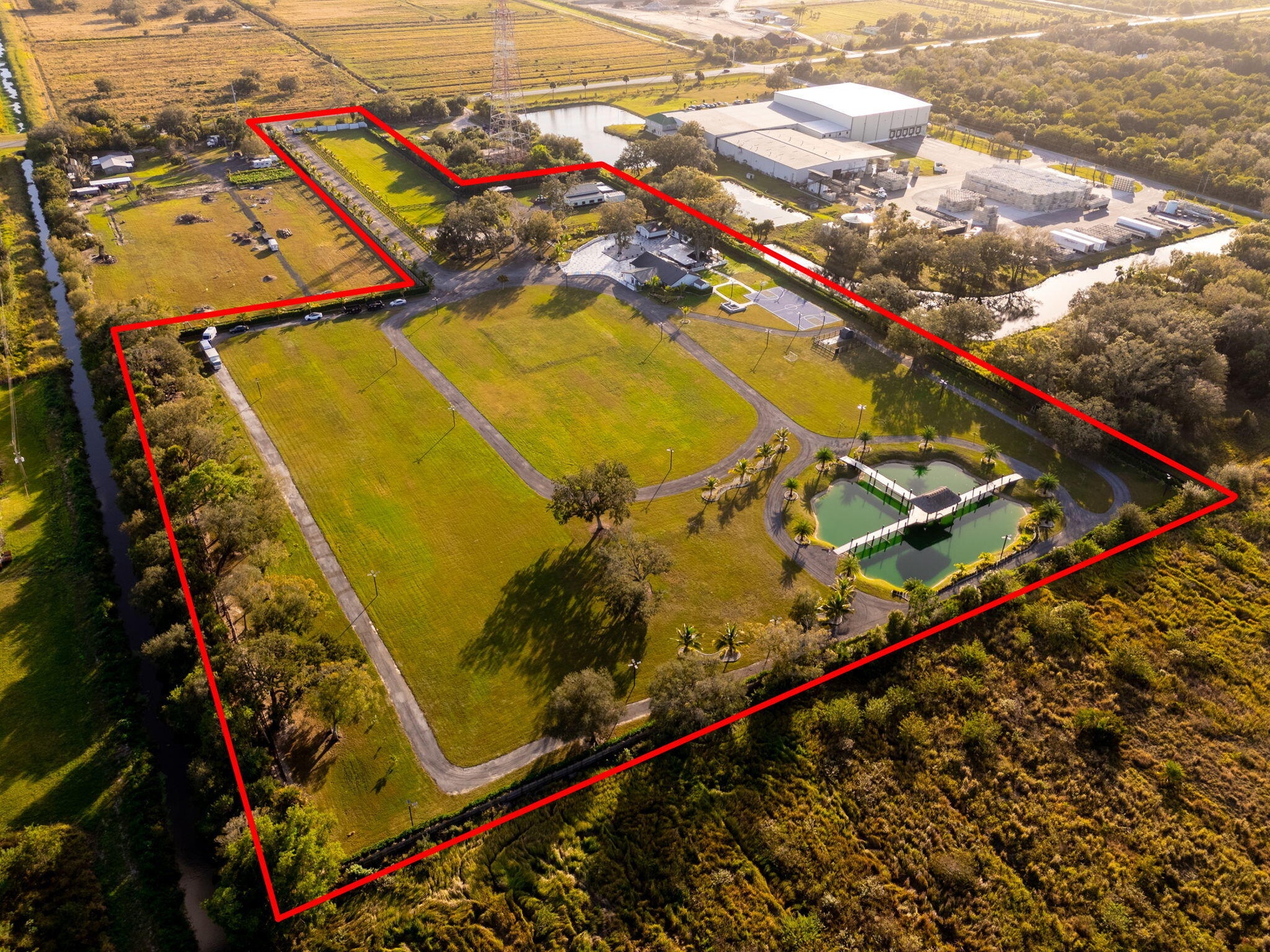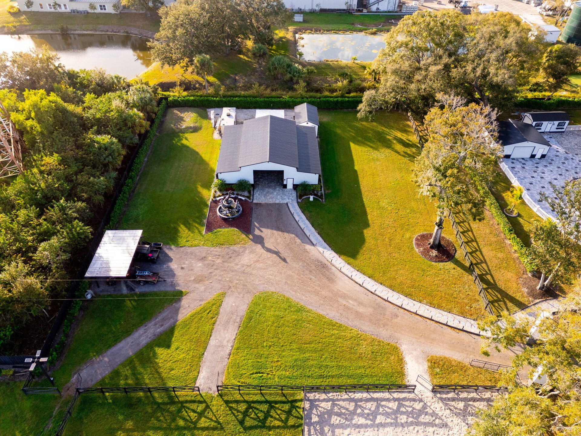 A scenic half-acre pond with dock, bridge, and tiki pavilion creates a serene waterfront focal point. Fully fenced, irrigated, and supported by a reverse osmosis system, the grounds are both functional and elegant.