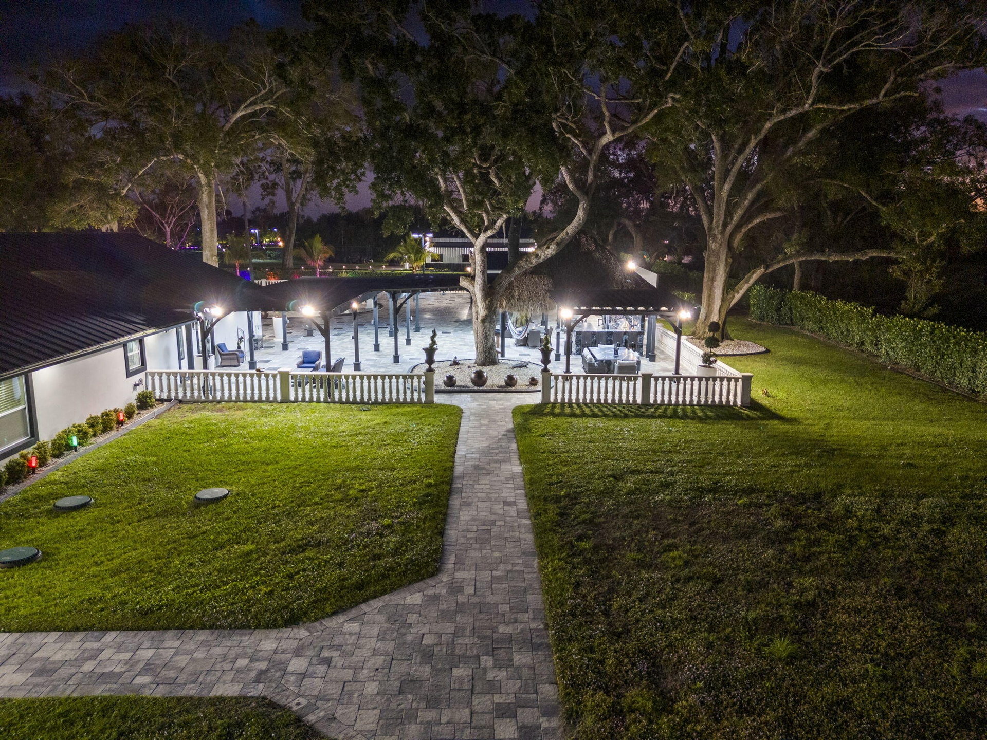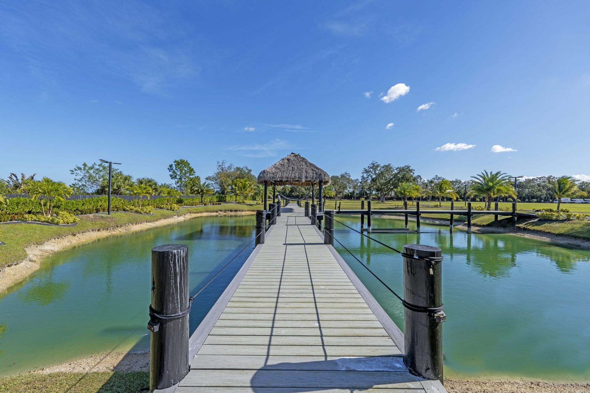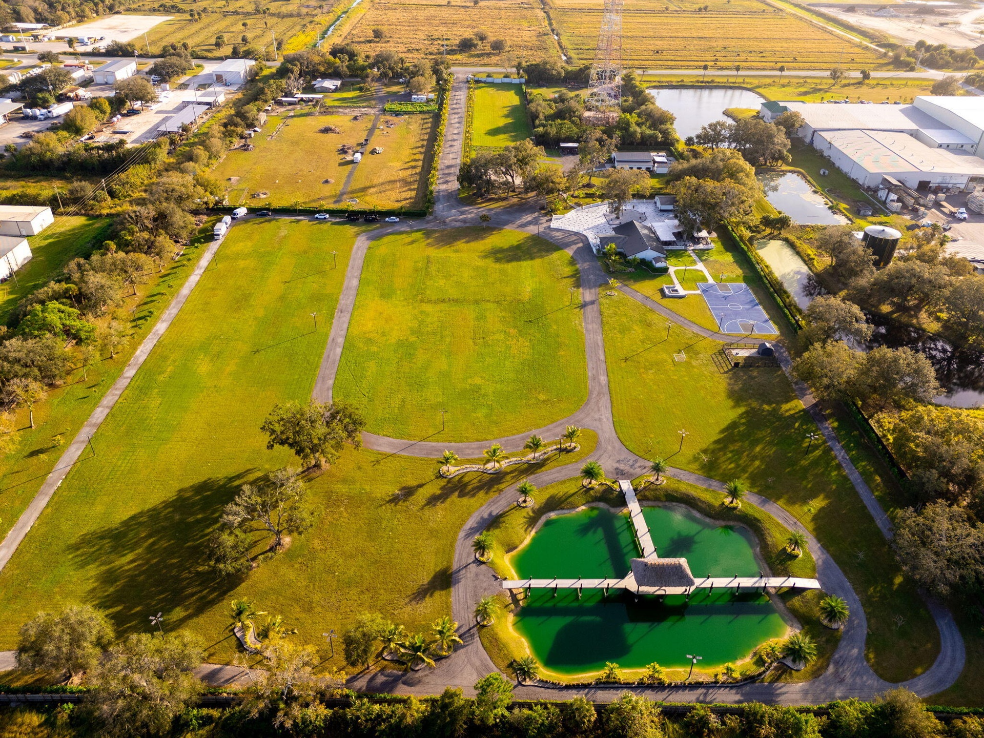 A scenic half-acre pond with dock, bridge, and tiki pavilion creates a serene waterfront focal point. Fully fenced, irrigated, and supported by a reverse osmosis system, the grounds are both functional and elegant.