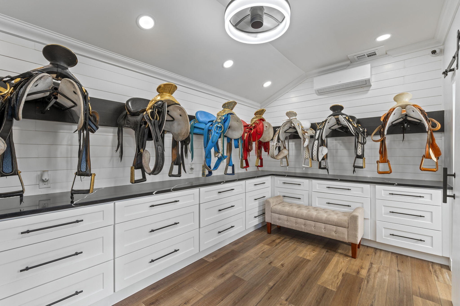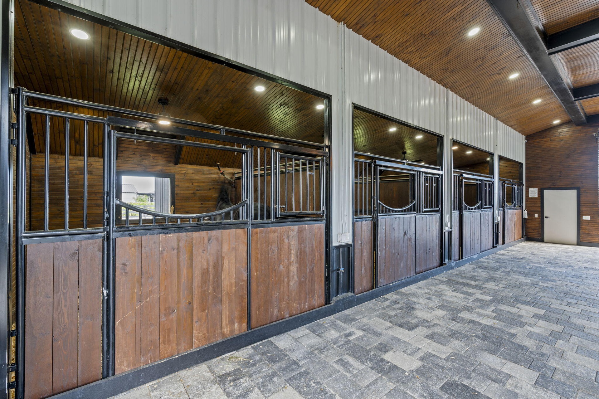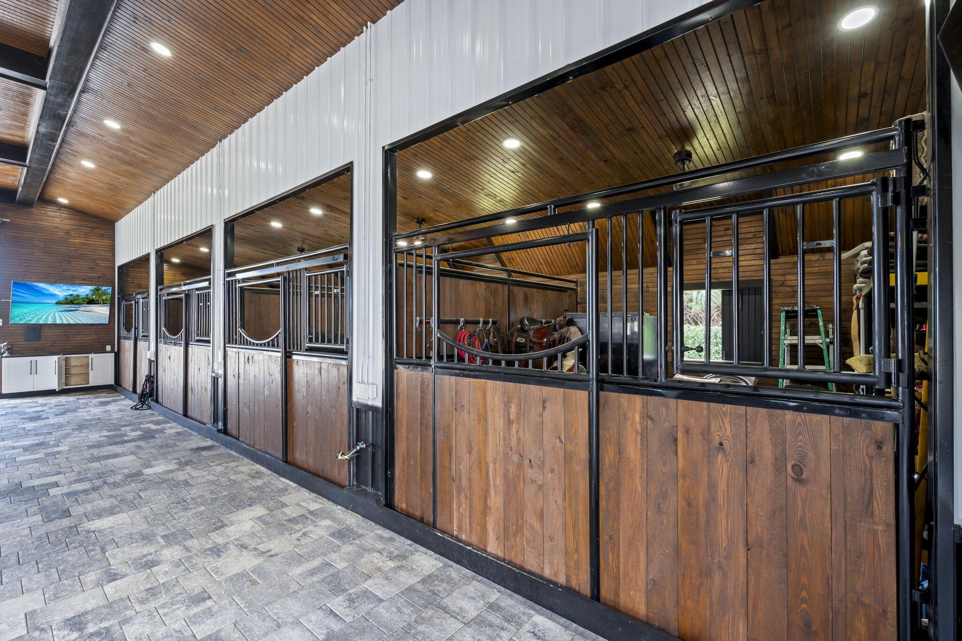 Equestrian facilities reflect extraordinary craftsmanship: a 2,560 sq ft barn with eight stalls, saddle room with bath, central wash area, and decorative stone-accented concrete columns -- a $400,000 investment demonstrating both luxury and practicality.