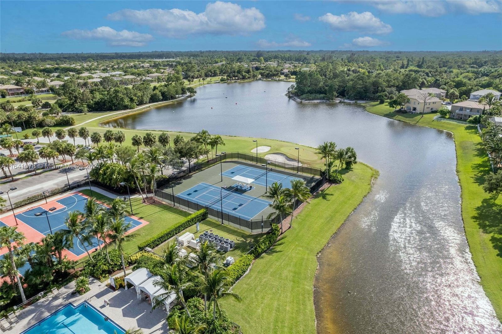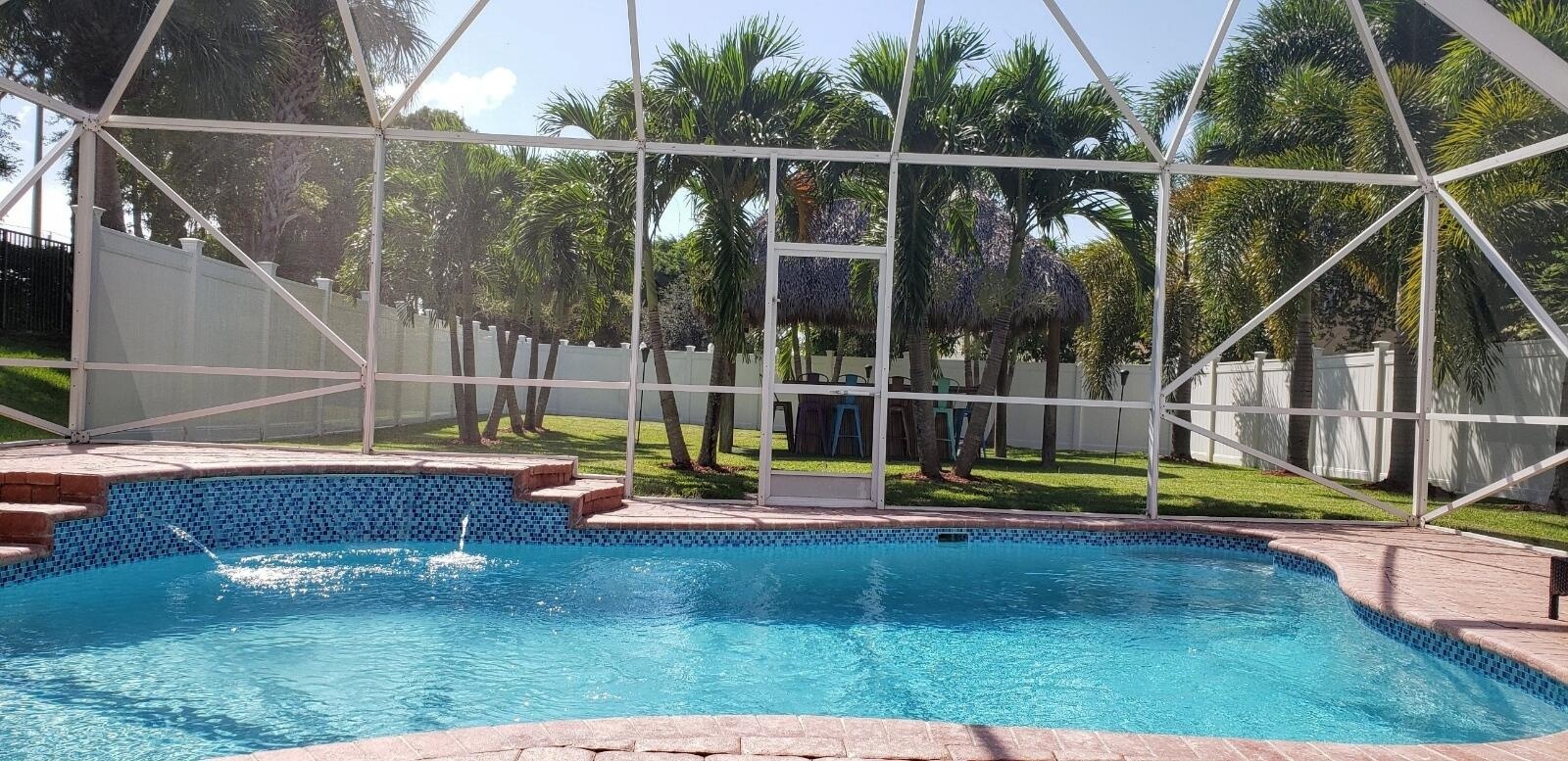 Discover your dream home in the prestigious Madison Green Country Club, a vibrant golf community. This stunning two-story residence offers 2,109 square feet of luxury living with 3 bedrooms, 3 full bathrooms, and a 2-car garage. Situated in a gated community on a spacious lot at the end of a cul-de-sac, it features a sparkling pool and an inviting atmosphere. The first floor welcomes you with soaring cathedral ceilings and abundant natural light, complemented by elegant eucalyptus wood flooring and plantation shutters. The kitchen boasts beautiful cabinetry, modern appliances, and stunning blue Bahia granite countertops, while the expansive living room opens to a picturesque view of the pool and backyard. Upstairs, the primary suite offers a luxurious bathroom with dual sinks and a separate shower, alongside generously sized additional bedrooms, all finished with exquisite Italian Carrara marble and upscale lighting. Step outside to your private oasis with an oversized screened enclosure, glistening pool, and custom-built bamboo tiki bar, perfect for entertaining or relaxing. Madison Green provides an array of resort-style amenities, including tennis, basketball, and pickleball courts, a community pool and spa, a splash pad, a tot playground, a gym, and a clubhouse with a bar and grill. Don't miss this incredible opportunity to make this dream home your own! Move in APRIL 2026