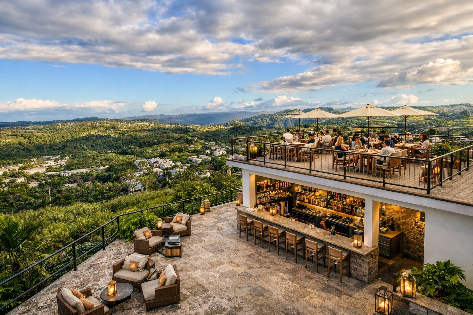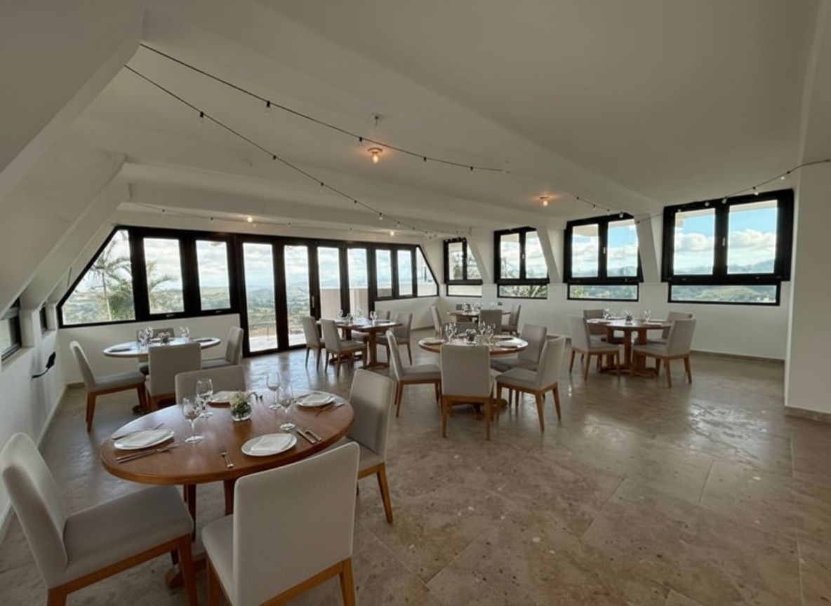 At the highest point of the hill sits an existing structure, positioned to capture sweeping panoramic views of Puerto Rico’s central mountain range. The building was originally envisioned as a restaurant / viewpoint concept, designed to welcome guests at the summit—where sunsets become part of the experience.