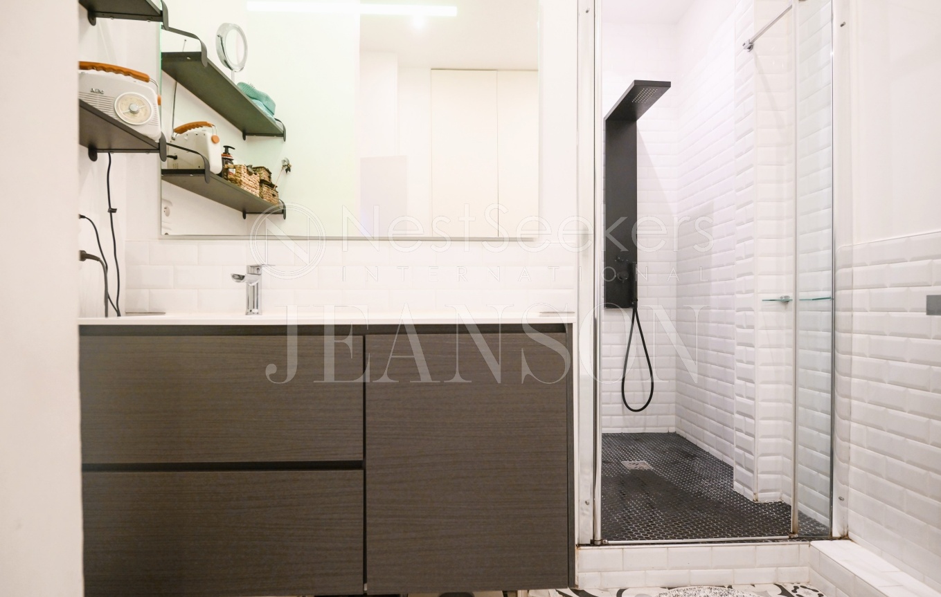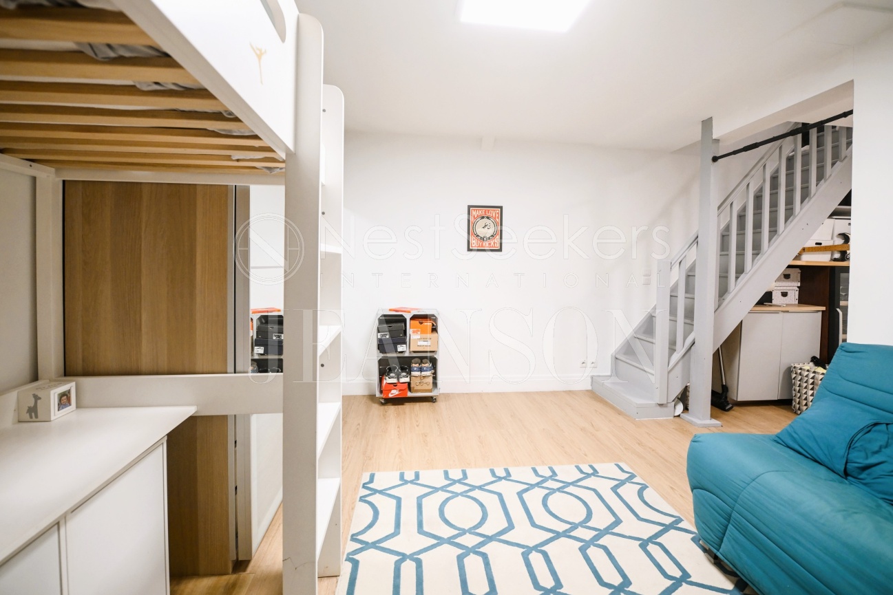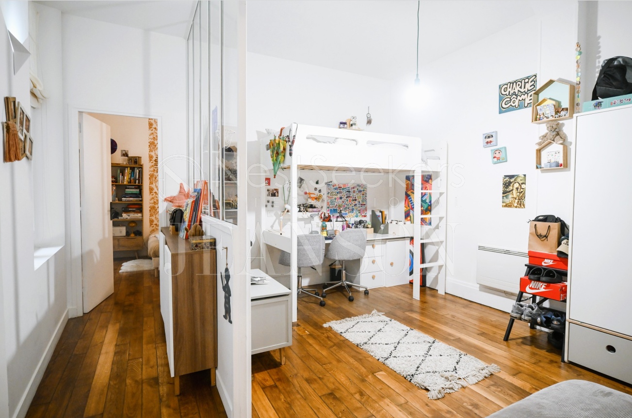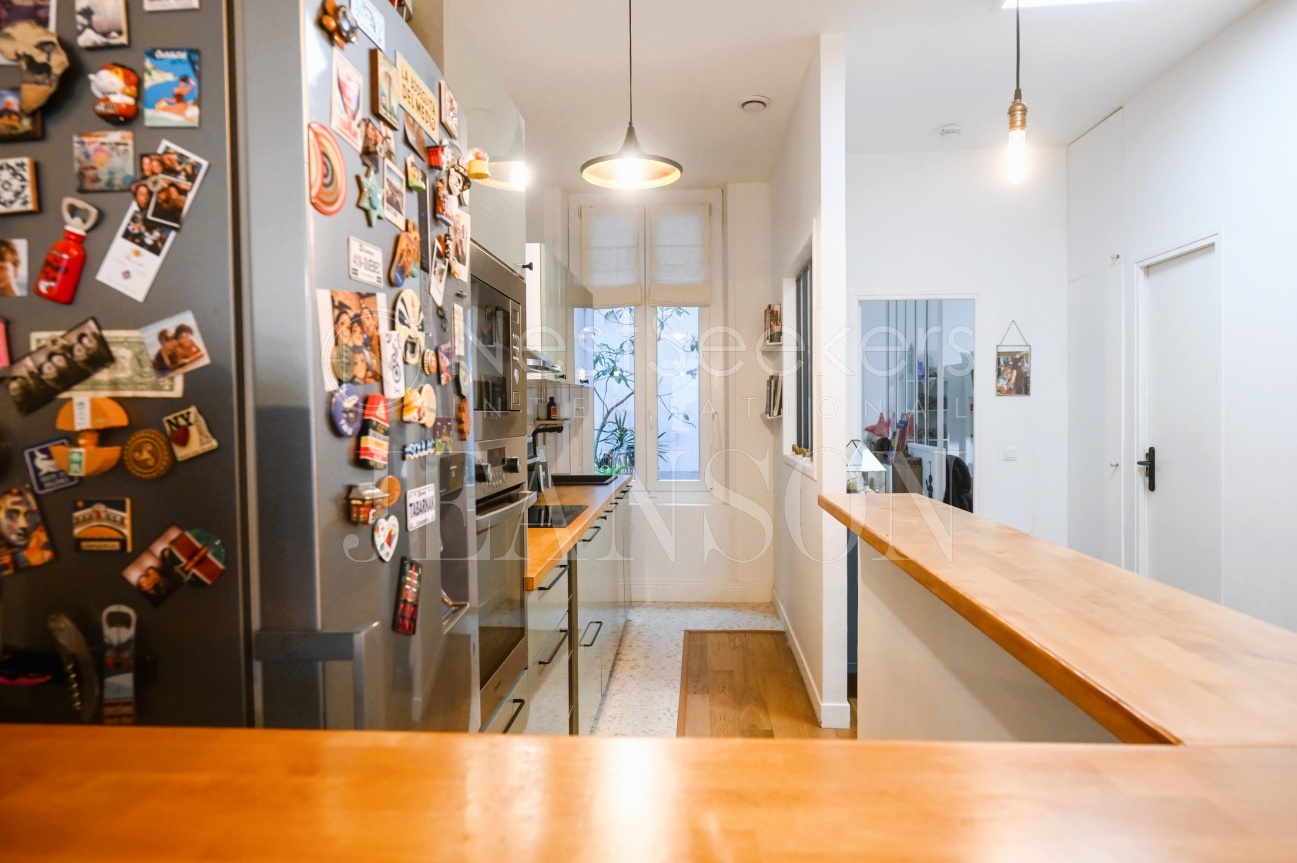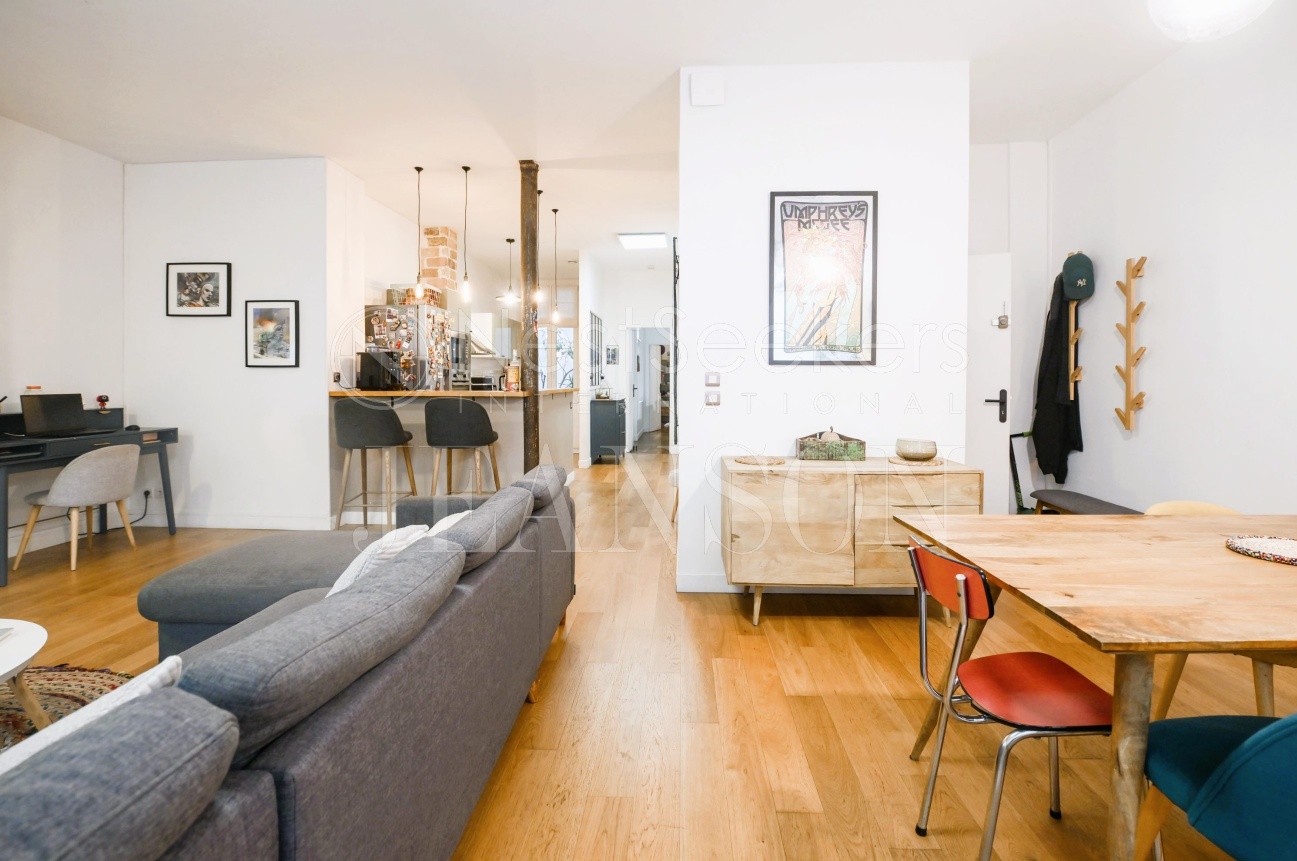 NestSeekers / Jeanson Properties presents this exceptional 108 m2 duplex loft, including 84 m2 of completely redesigned interior space in a contemporary style, offering generous and fluid volumes. Located on the ground floor of a cut-stone building, this property captivates from the moment you enter with its exceptional character, natural light, and optimized layout, designed for modern living comfort in the heart of Paris. The main level comprises an entrance hall with a spacious and bright double living room, a welcoming and modern open-plan kitchen, two bedrooms, including an elegant master suite, a bathroom with a corner bathtub and walk-in shower, and a separate toilet. The lower level, completely renovated, offers an additional bedroom and a laundry room. This flexible space is ideal for an office, guest suite, or independent living area. Insulated glazing ensures privacy and tranquility.