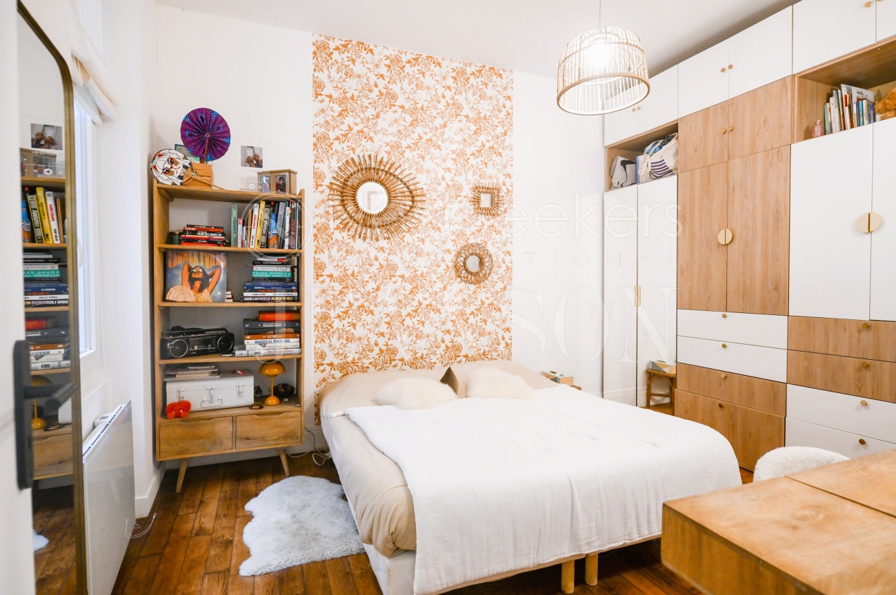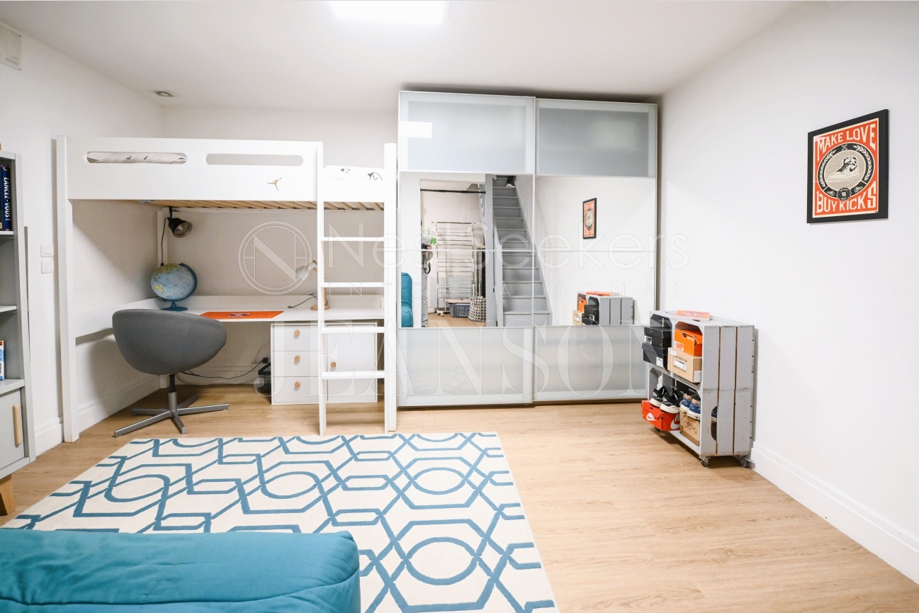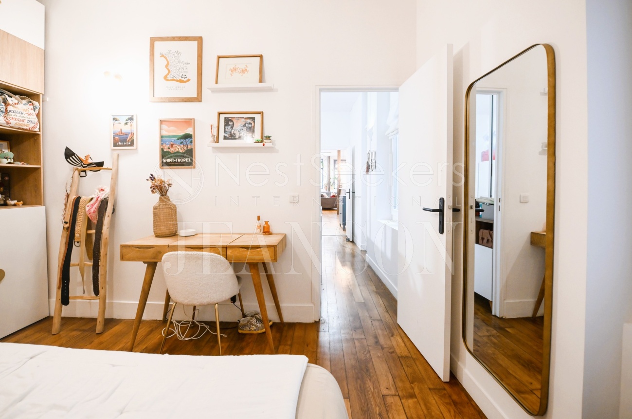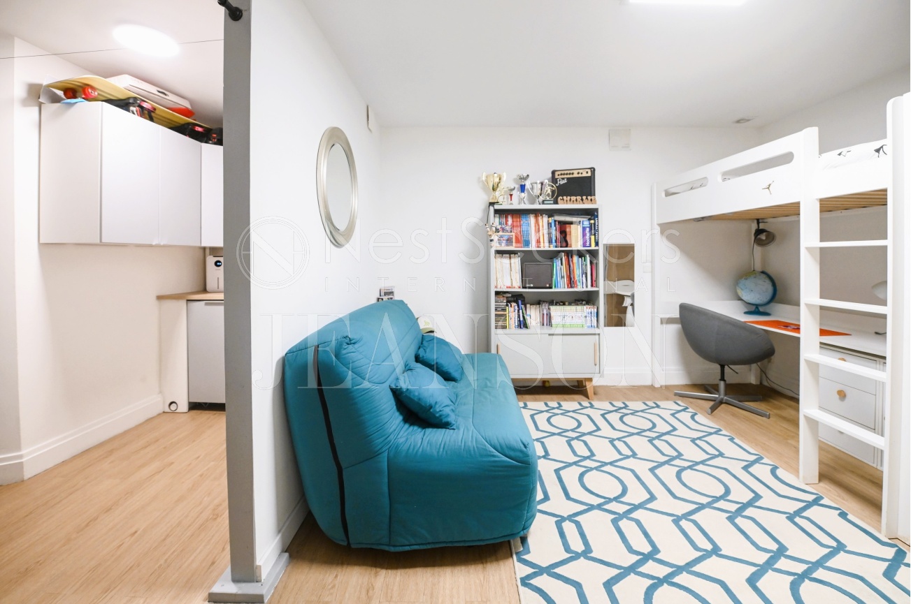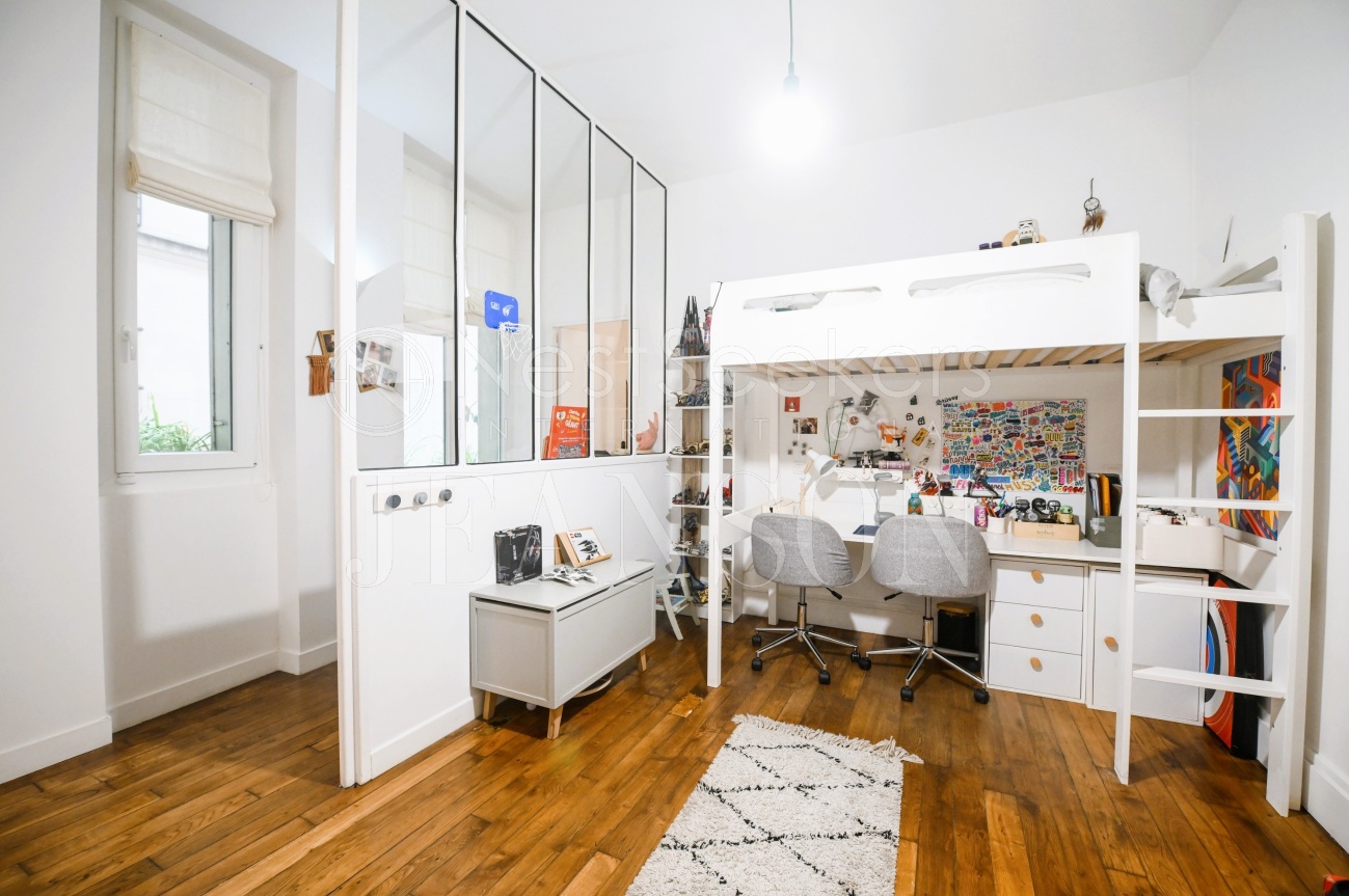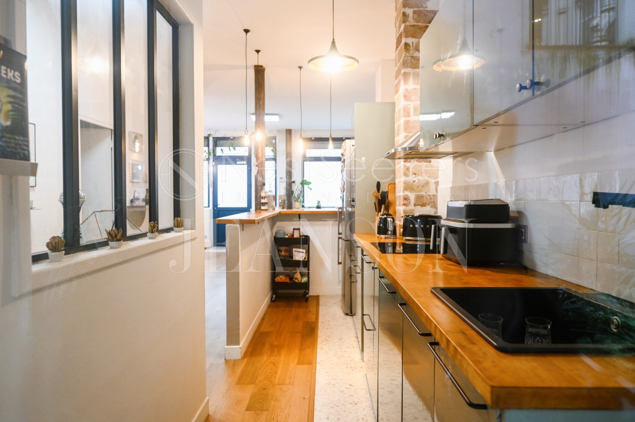 NestSeekers / Jeanson Properties presents this exceptional 108 m2 duplex loft, including 84 m2 of completely redesigned interior space in a contemporary style, offering generous and fluid volumes. Located on the ground floor of a cut-stone building, this property captivates from the moment you enter with its exceptional character, natural light, and optimized layout, designed for modern living comfort in the heart of Paris. The main level comprises an entrance hall with a spacious and bright double living room, a welcoming and modern open-plan kitchen, two bedrooms, including an elegant master suite, a bathroom with a corner bathtub and walk-in shower, and a separate toilet. The lower level, completely renovated, offers an additional bedroom and a laundry room. This flexible space is ideal for an office, guest suite, or independent living area. Insulated glazing ensures privacy and tranquility.