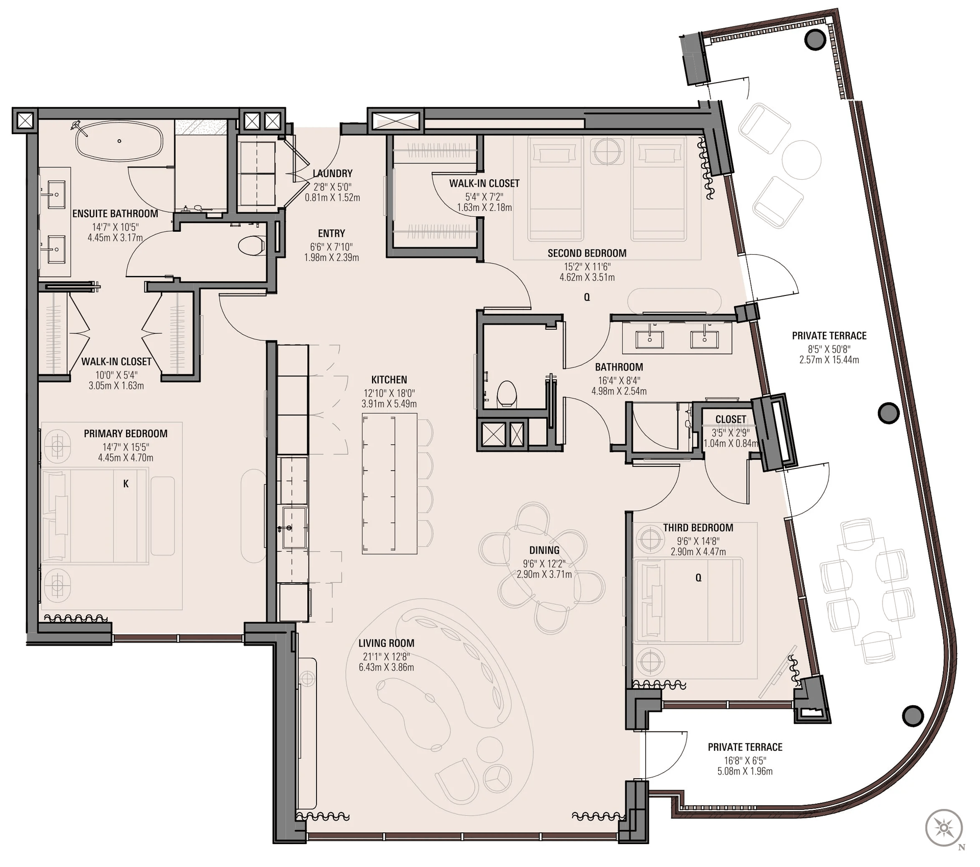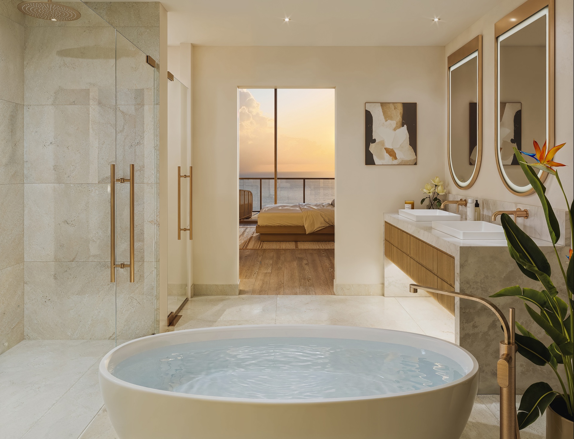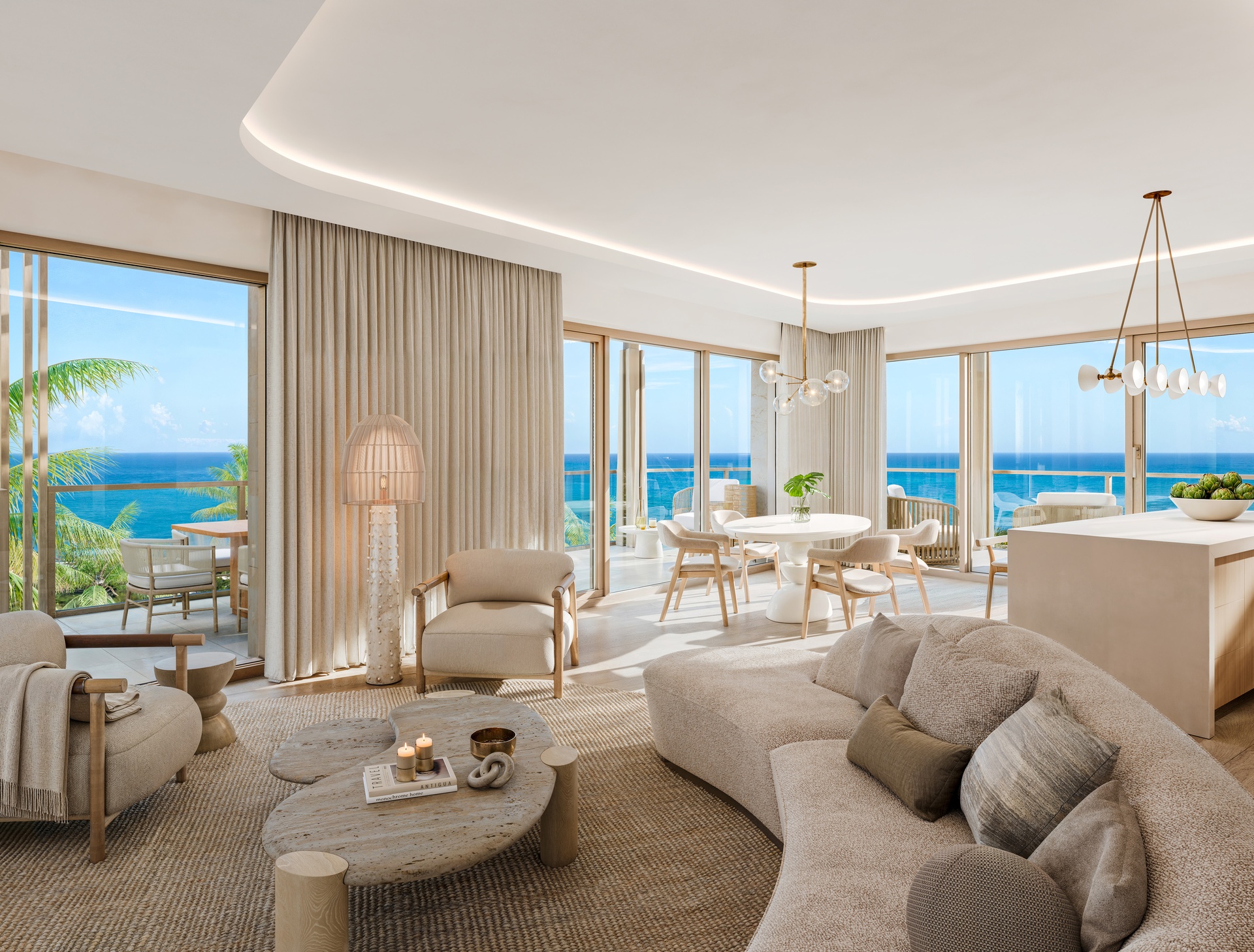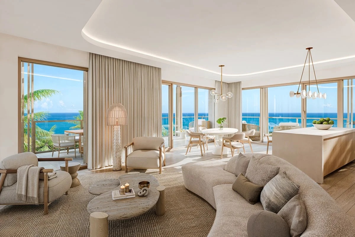 The Three Bedroom Residences are thoughtfully designed for elegant simplicity. Ranging from approximately 1912 sq ft to 2279 sq ft, the layouts are open and fluid, maximising natural light and framing views of the ocean, marina or landscaped gardens. Floor to ceiling glazing opens onto generous terraces that extend the living space outdoors, creating a seamless transition between interior and exterior living.